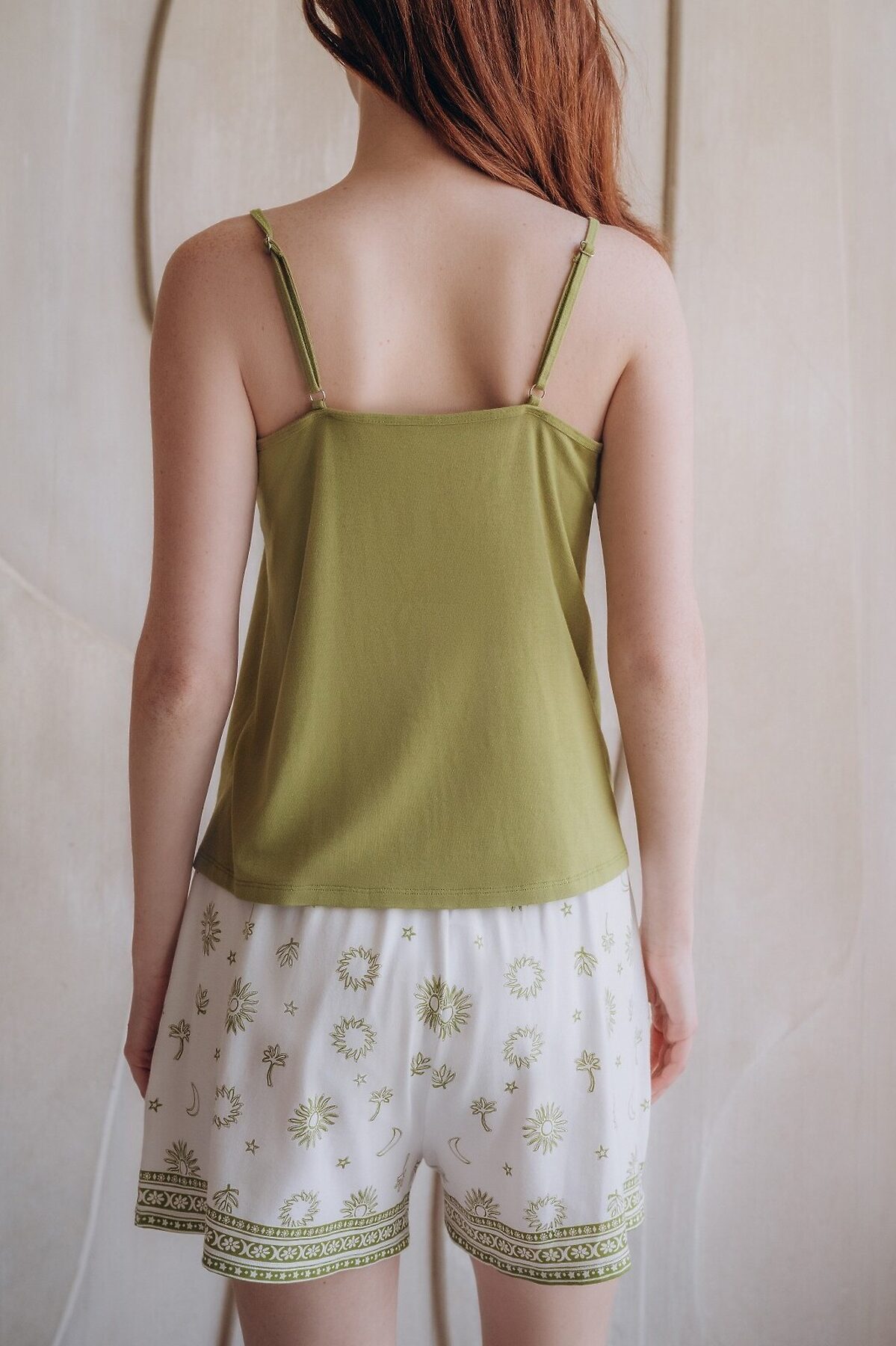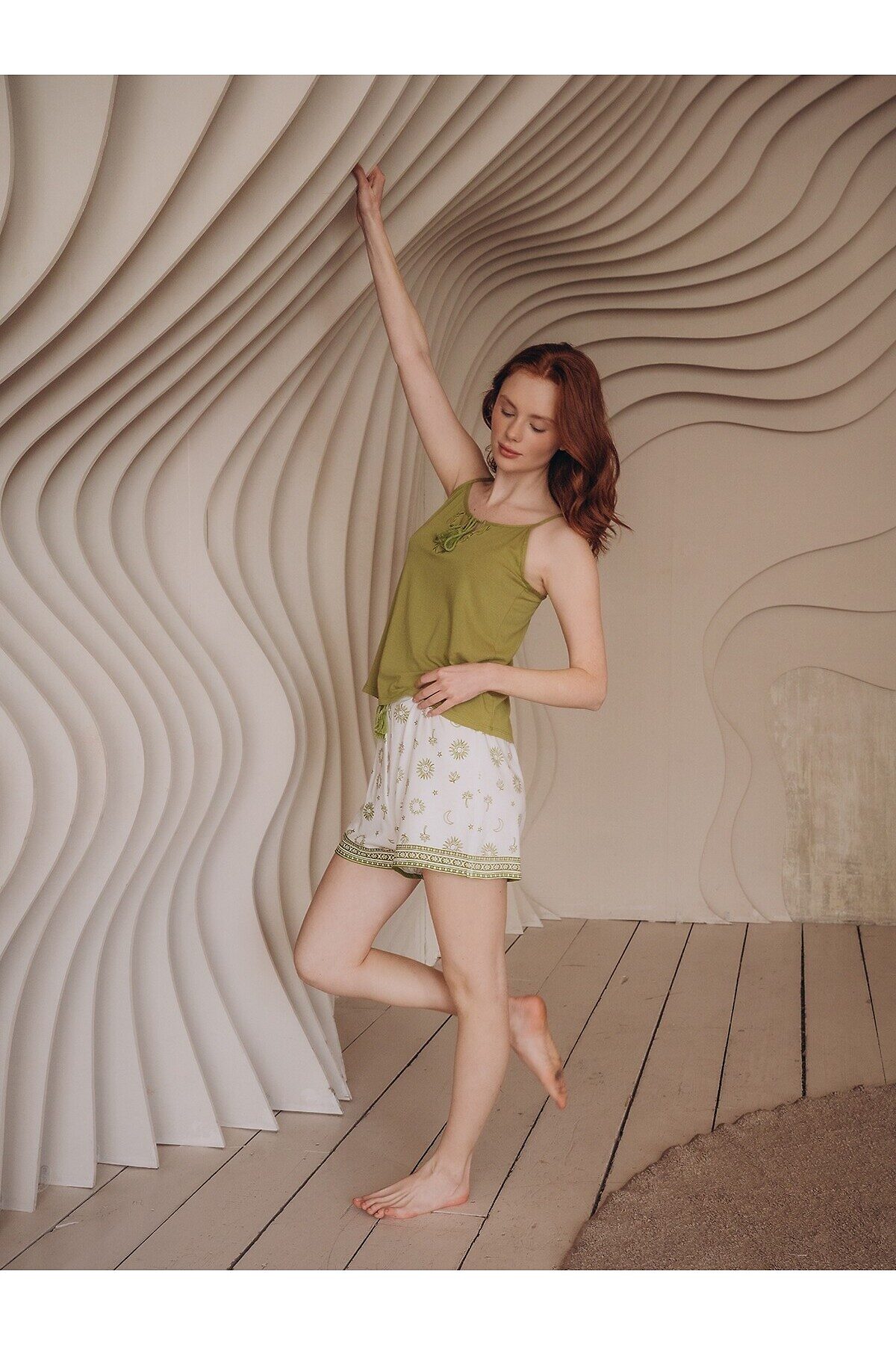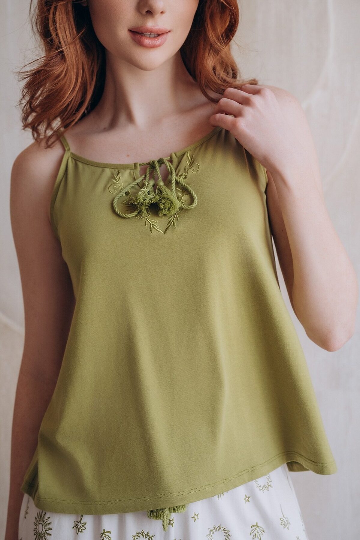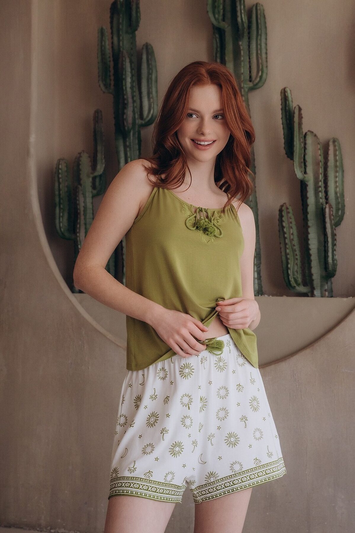 Пижама женская 5052TDP бренда Indefini изготовлена из смеси бамбука и хлопка. Она состоит из майки и шорт. Майка выполнена в зеленом цвете на тонких регулируемых бретелях. Зона декольте украшена цветочной вышивкой и двумя завязываемыми шнурками с кисточками. Шорты выполнены в белом цвете с абстрактным принтом. Они имеют мягкую эластичную резинку на талии с вязаным регулирующим шнурком с кисточками.