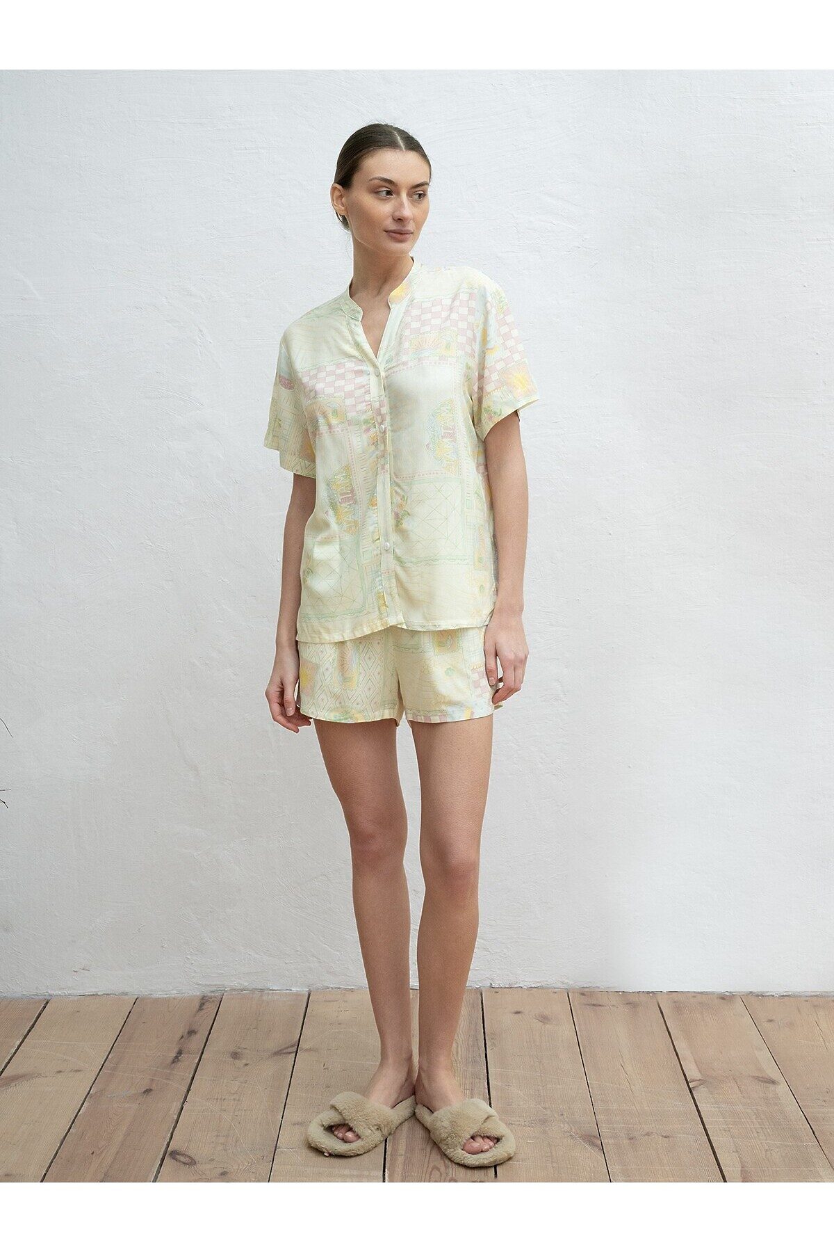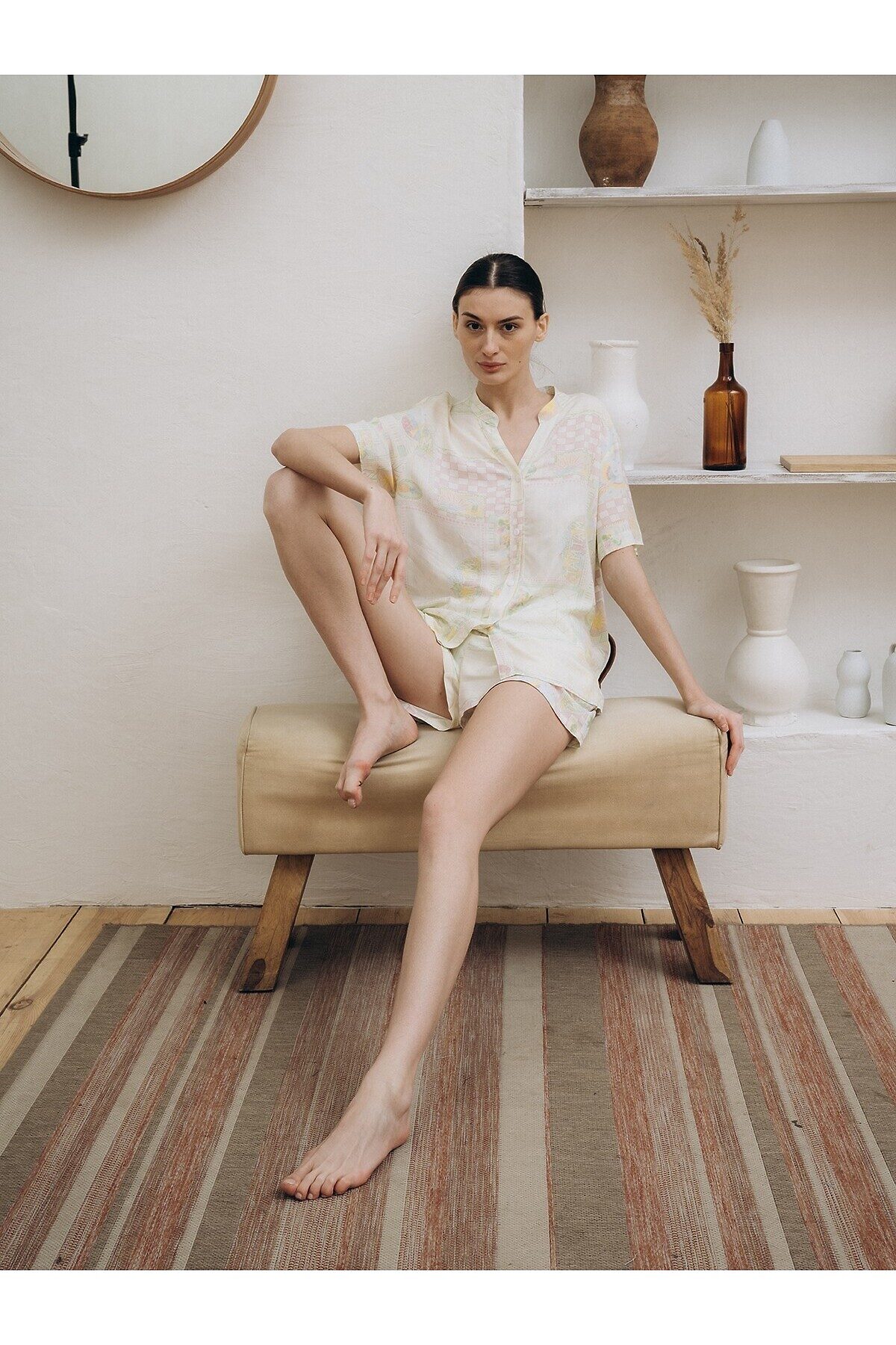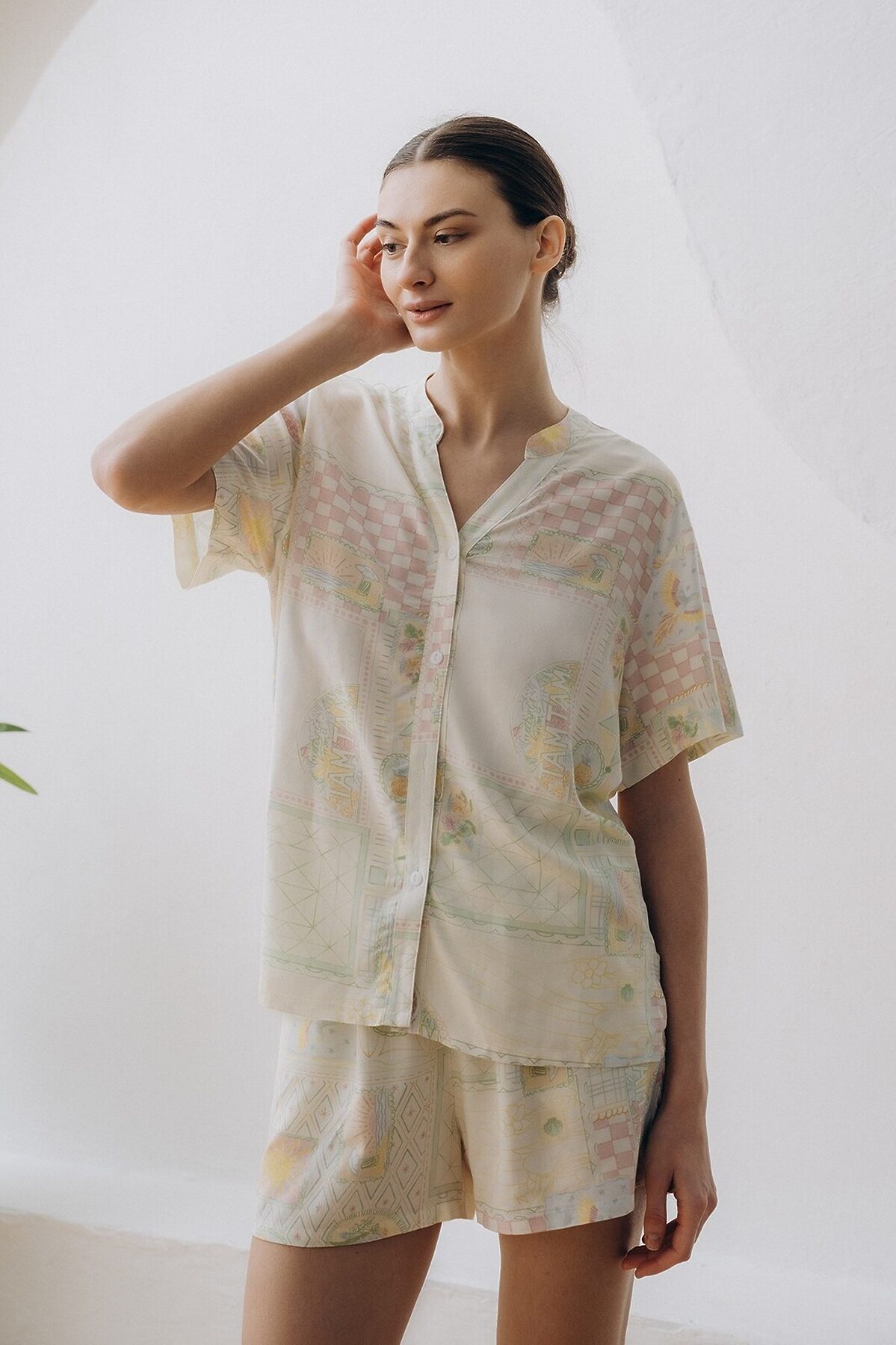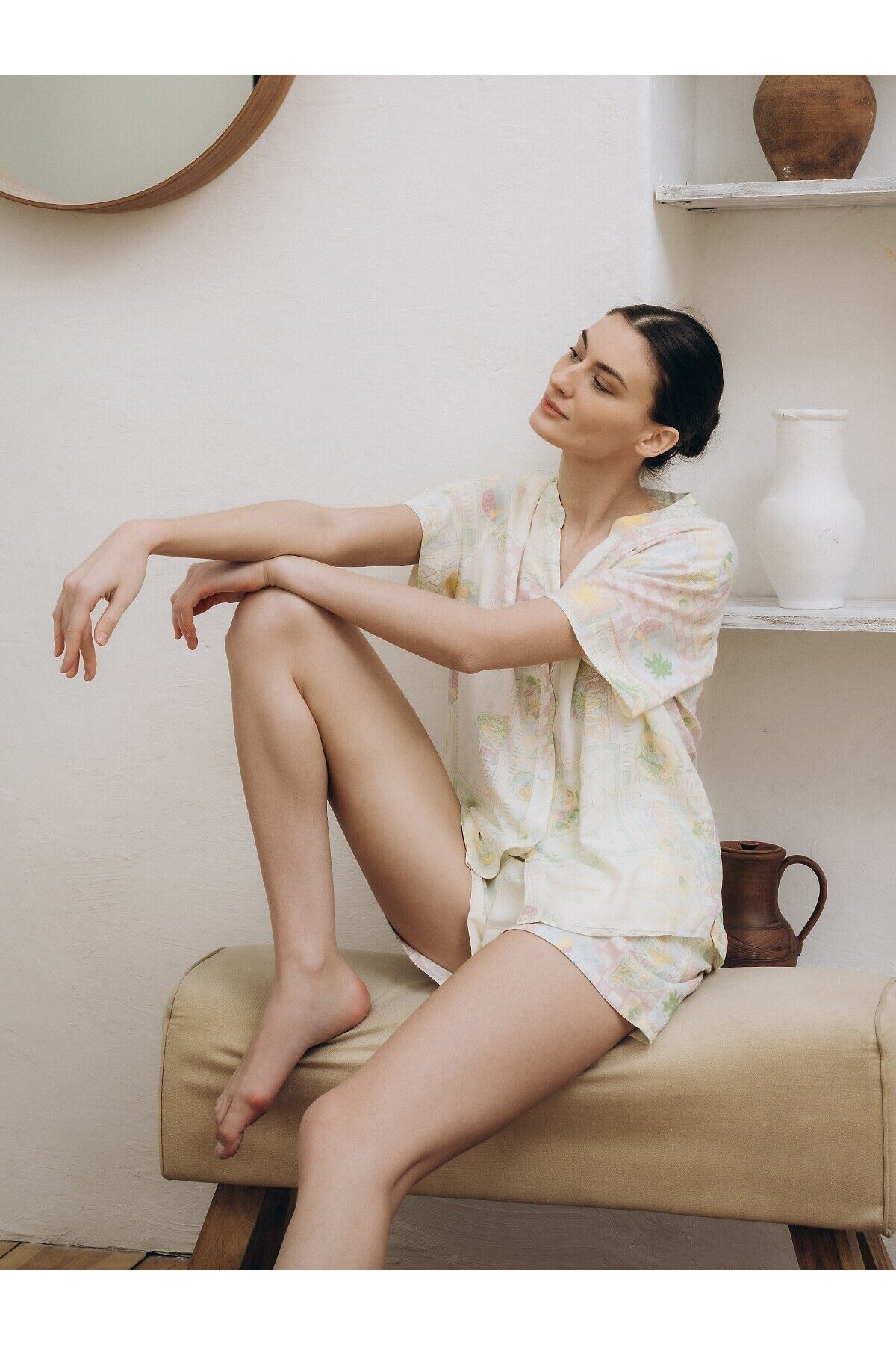Пижама женская 5064TBD бренда Indefini изготовлена из смеси вискозы и хлопка. В комплект входят рубашка и шорты. Рубашка на пуговицах имеет короткие рукава. Шорты на мягкой эластичной резинке имеют два боковых кармана. Пижама выполнена в цвете мультиколор с абстрактным принтом.