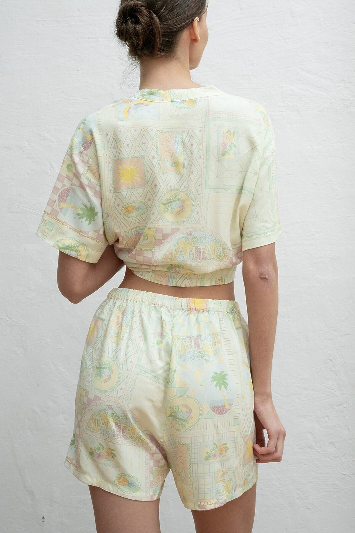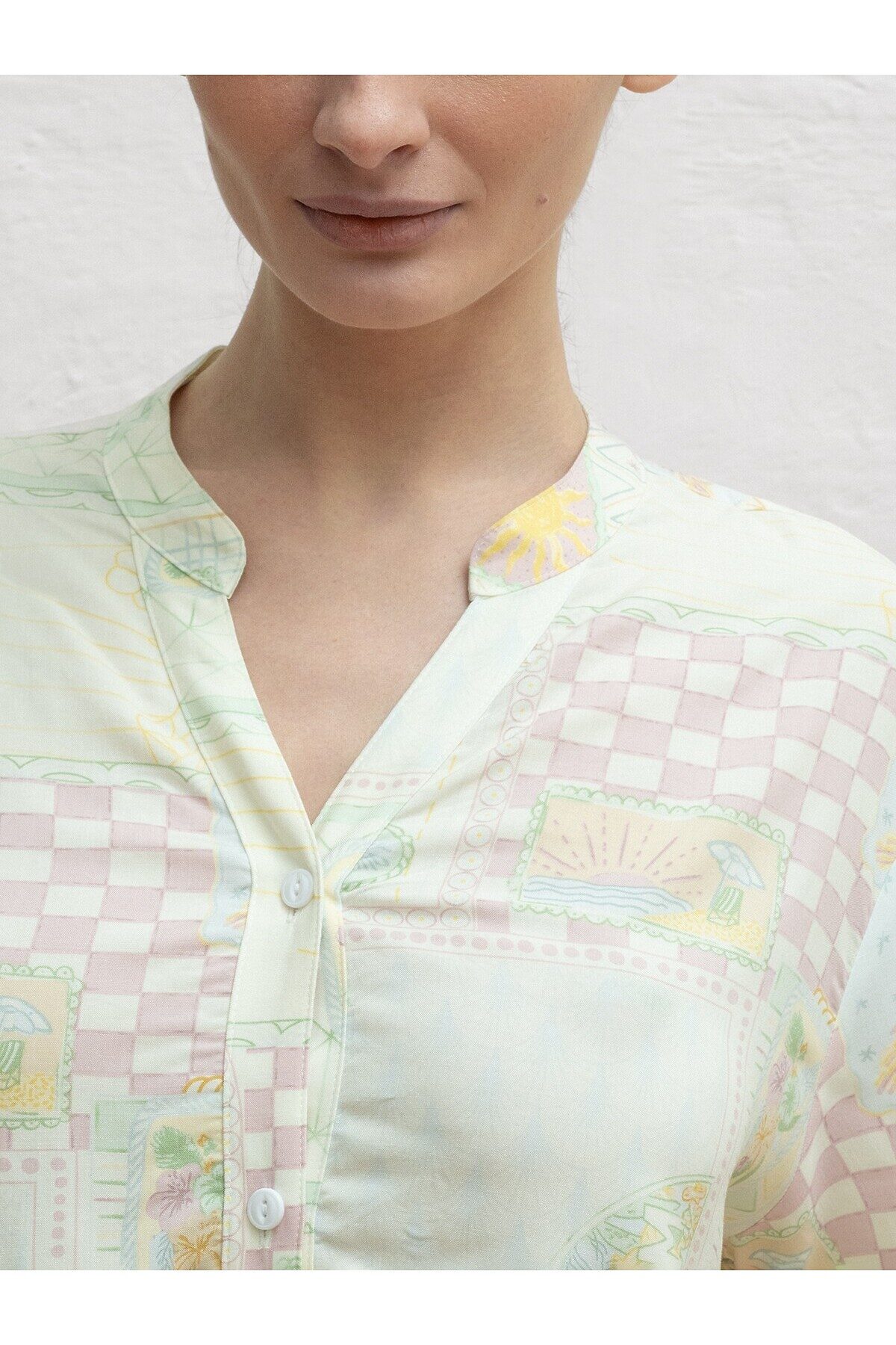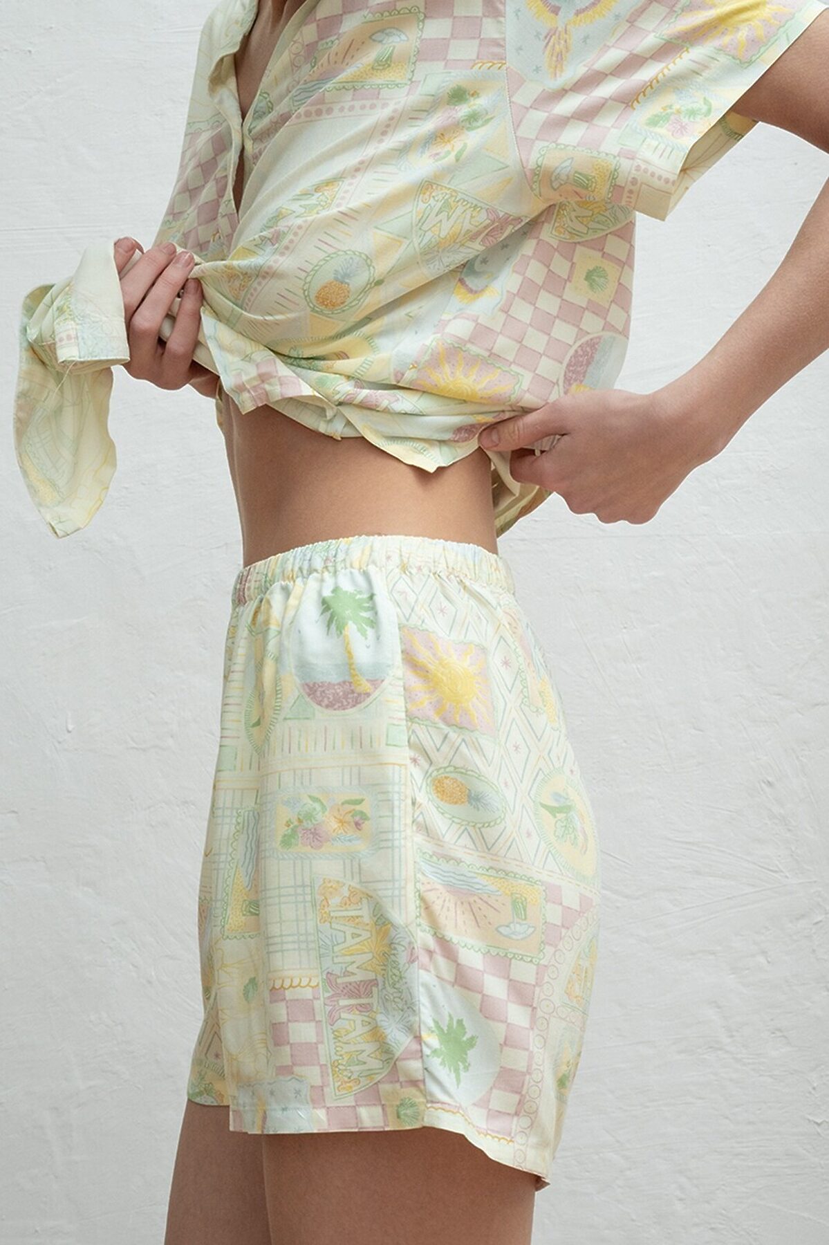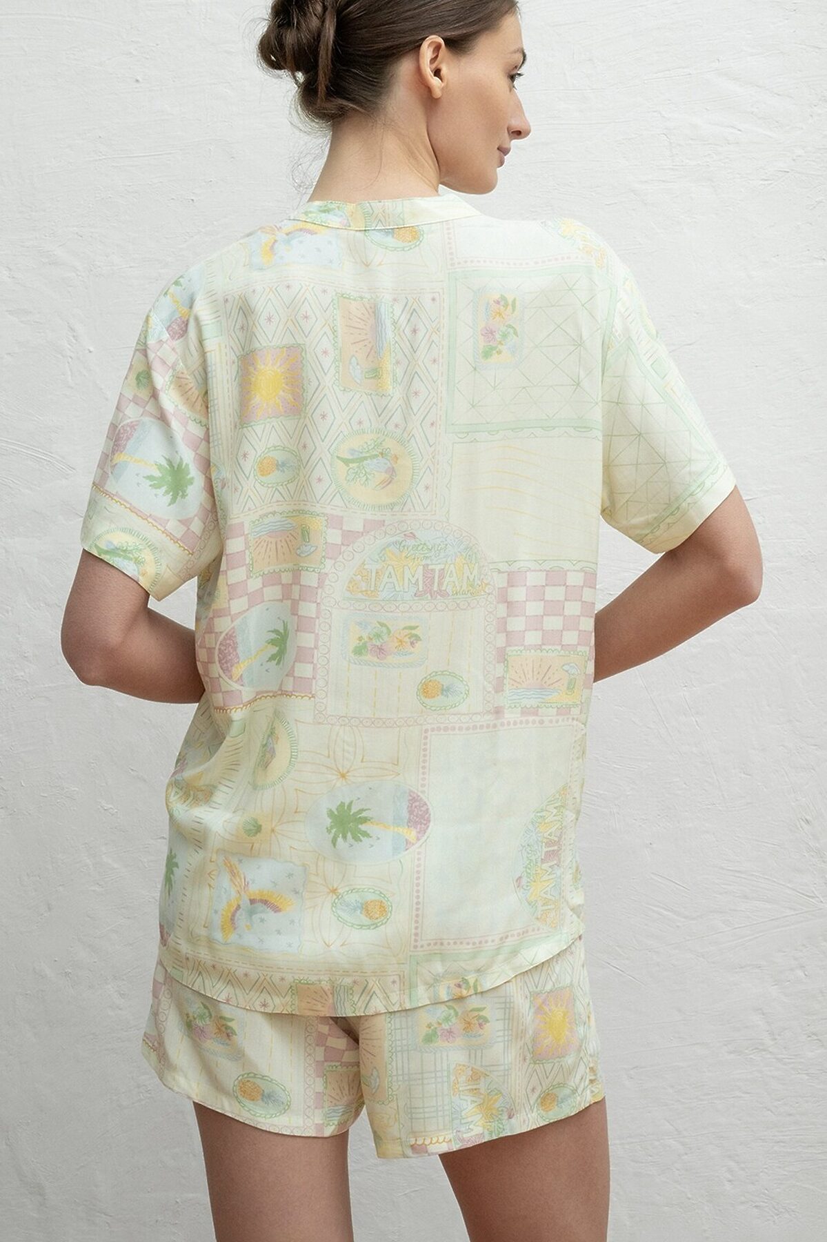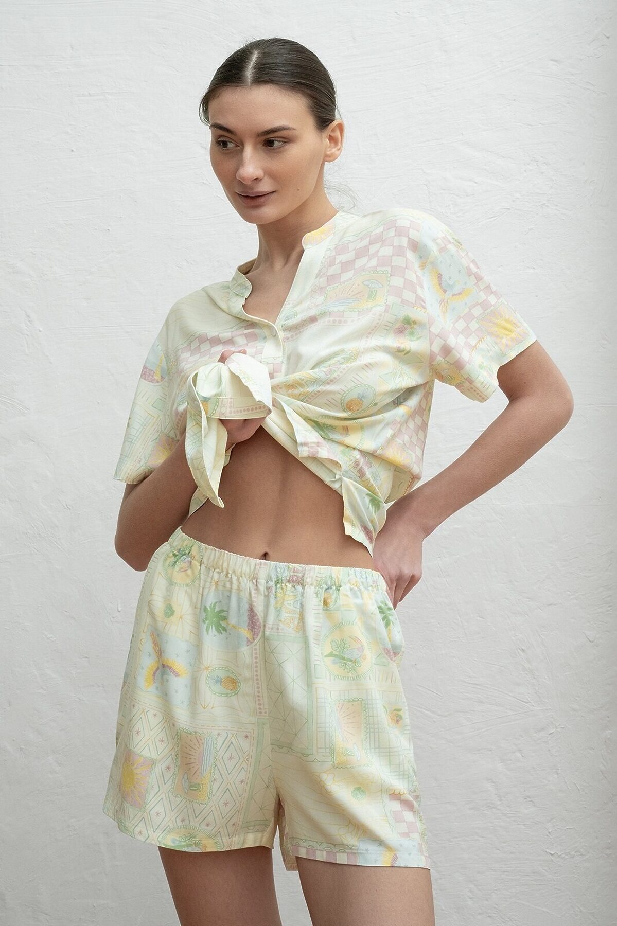 Пижама женская 5064TBD бренда Indefini изготовлена из смеси вискозы и хлопка. В комплект входят рубашка и шорты. Рубашка на пуговицах имеет короткие рукава. Шорты на мягкой эластичной резинке имеют два боковых кармана. Пижама выполнена в цвете мультиколор с абстрактным принтом.