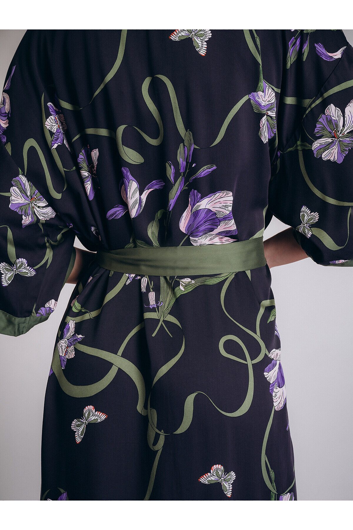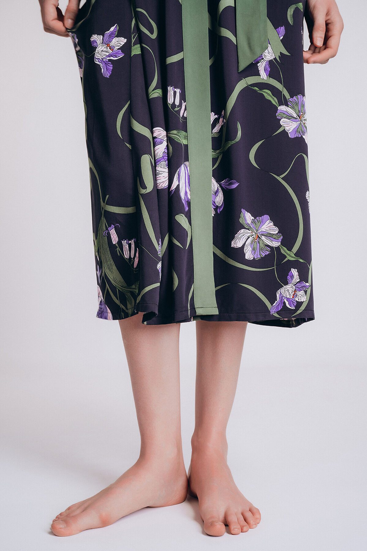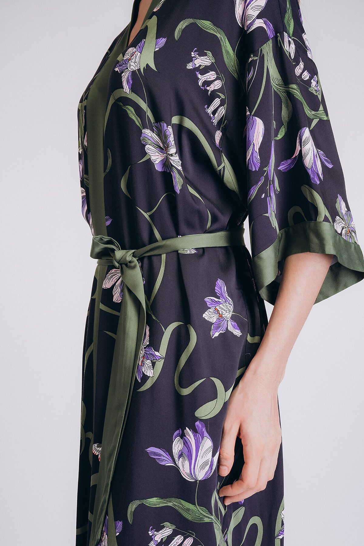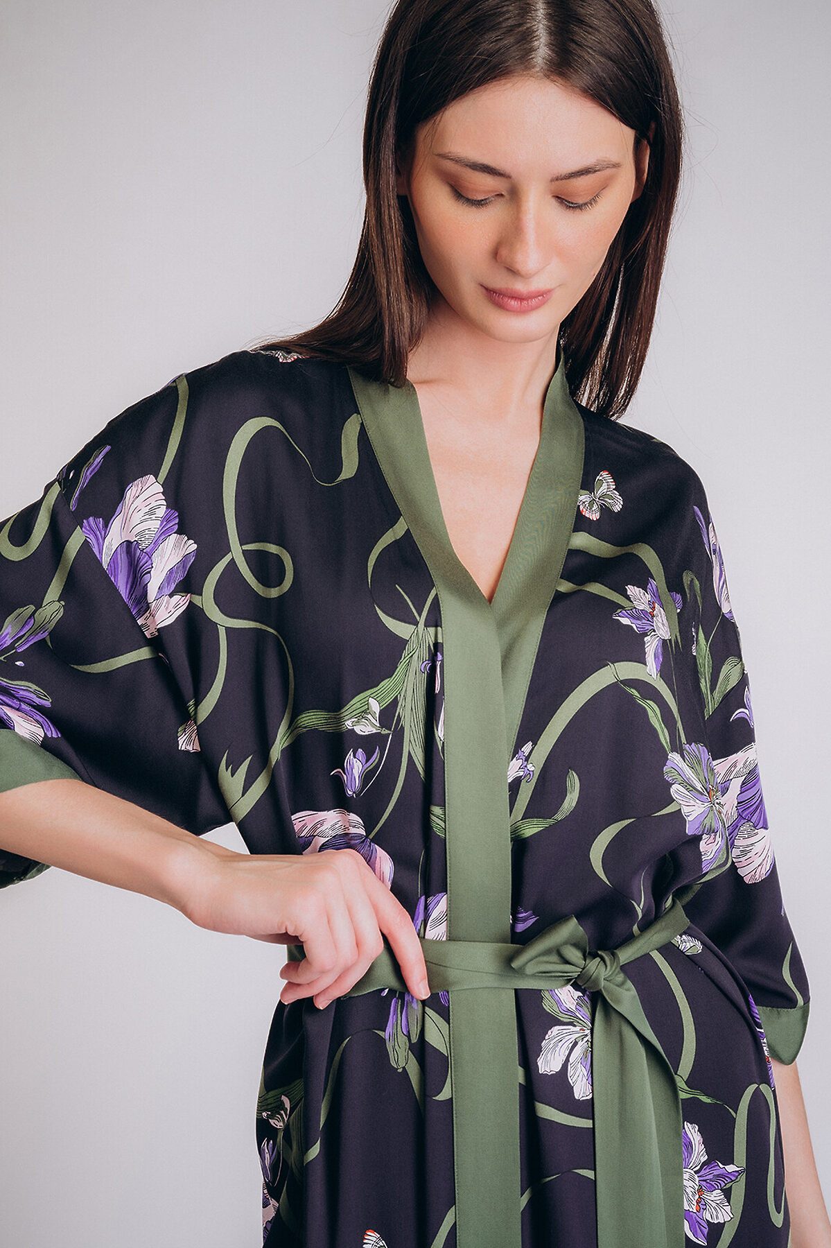 Женский халат 5024SYZ изготовлен из 100% вискозы. Ткань легкая и приятная на ощупь. Модель выполнена в черном цвете с контрастной отделкой по краям и прямым кроем. Халат имеет широкий рукав и пояс на талии для удобной фиксации. Изделие украшено ярким цветочным принтом с изображением цветов и бабочек. Идеально подходит для домашнего использования и создает ощущение уюта и комфорта.
