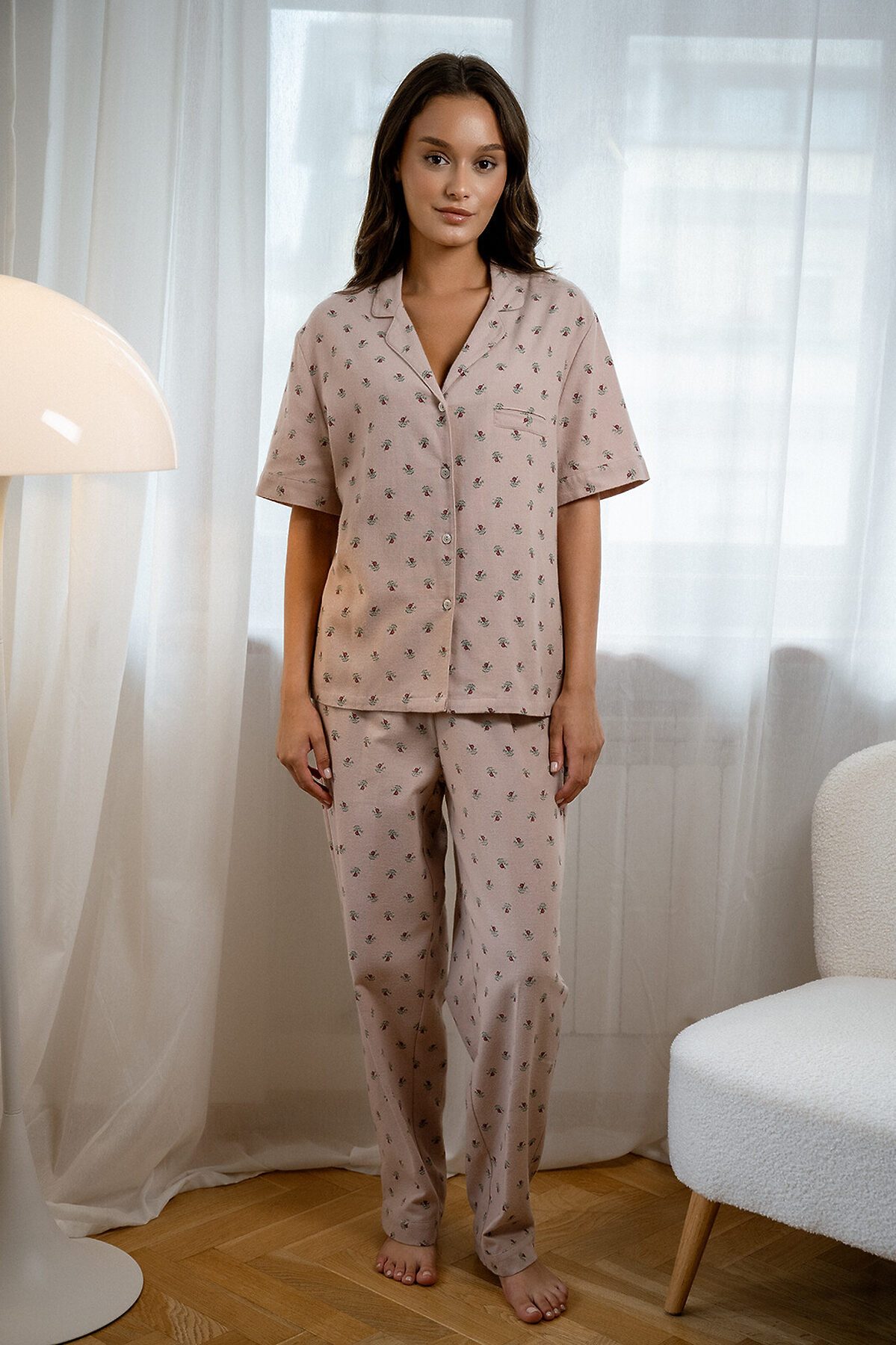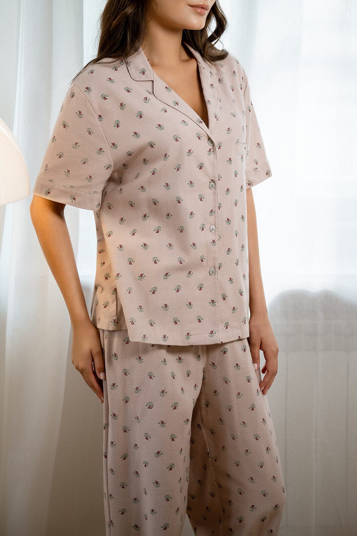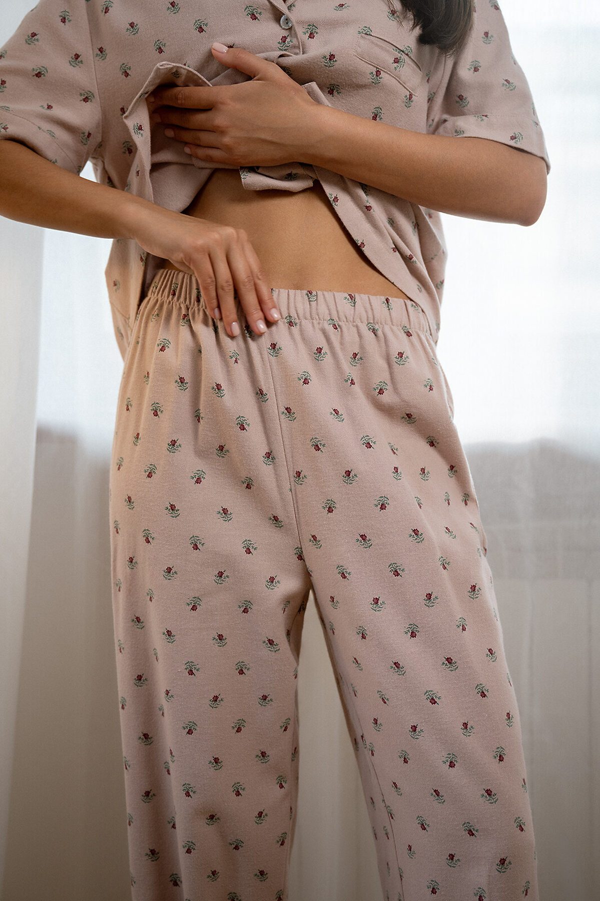 остюм женский 5187TBC бренда Indefini изготовлен из хлопка. Выполнен в бежевом цвете. Состоит из рубашки и брюк. Рубашка на пуговицах с длинными рукавами и отложным воротником. Брюки на мягкой широкой резинке имеют два боковых кармана.