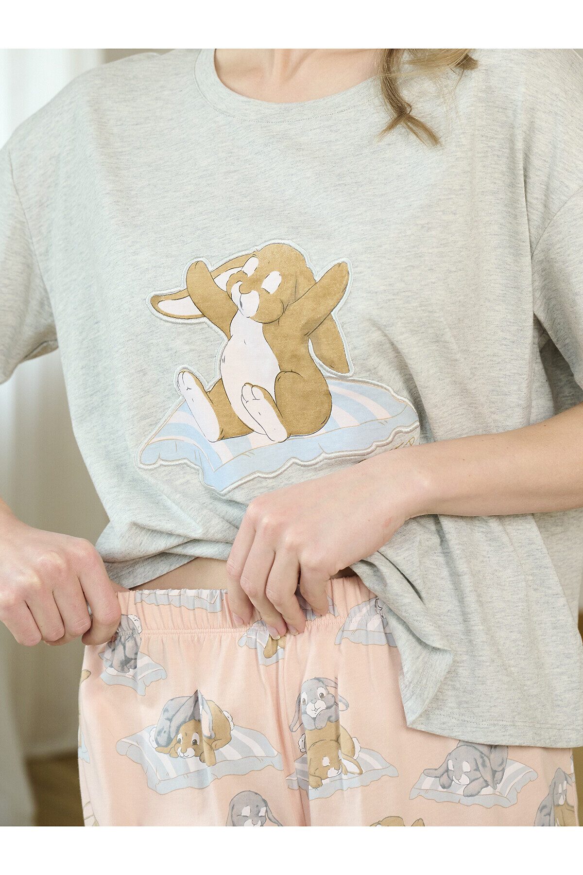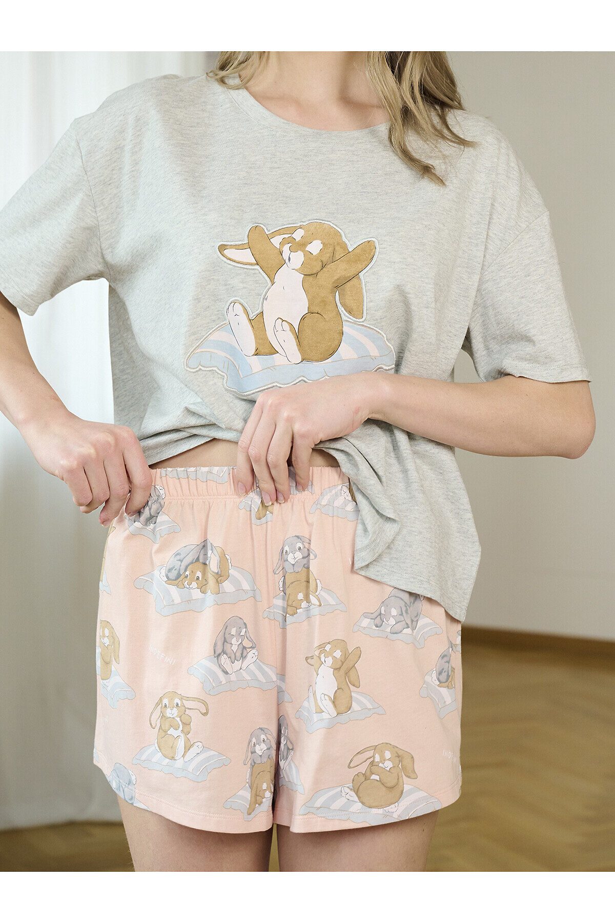 Пижама женская 5231TBD бренда Indefini изготовлена из 100% хлопка. Состоит из футболки и шорт. Выполнена в двухцветной комбинации: футболка — светло-серая меланж, шорты — нежно-розовые. Футболка свободного кроя с круглым вырезом горловины и короткими рукавами. На груди расположен принт с изображением милого кролика на подушке. Шорты на мягкой эластичной резинке с повторяющимся принтом кроликов на подушках по всему изделию.