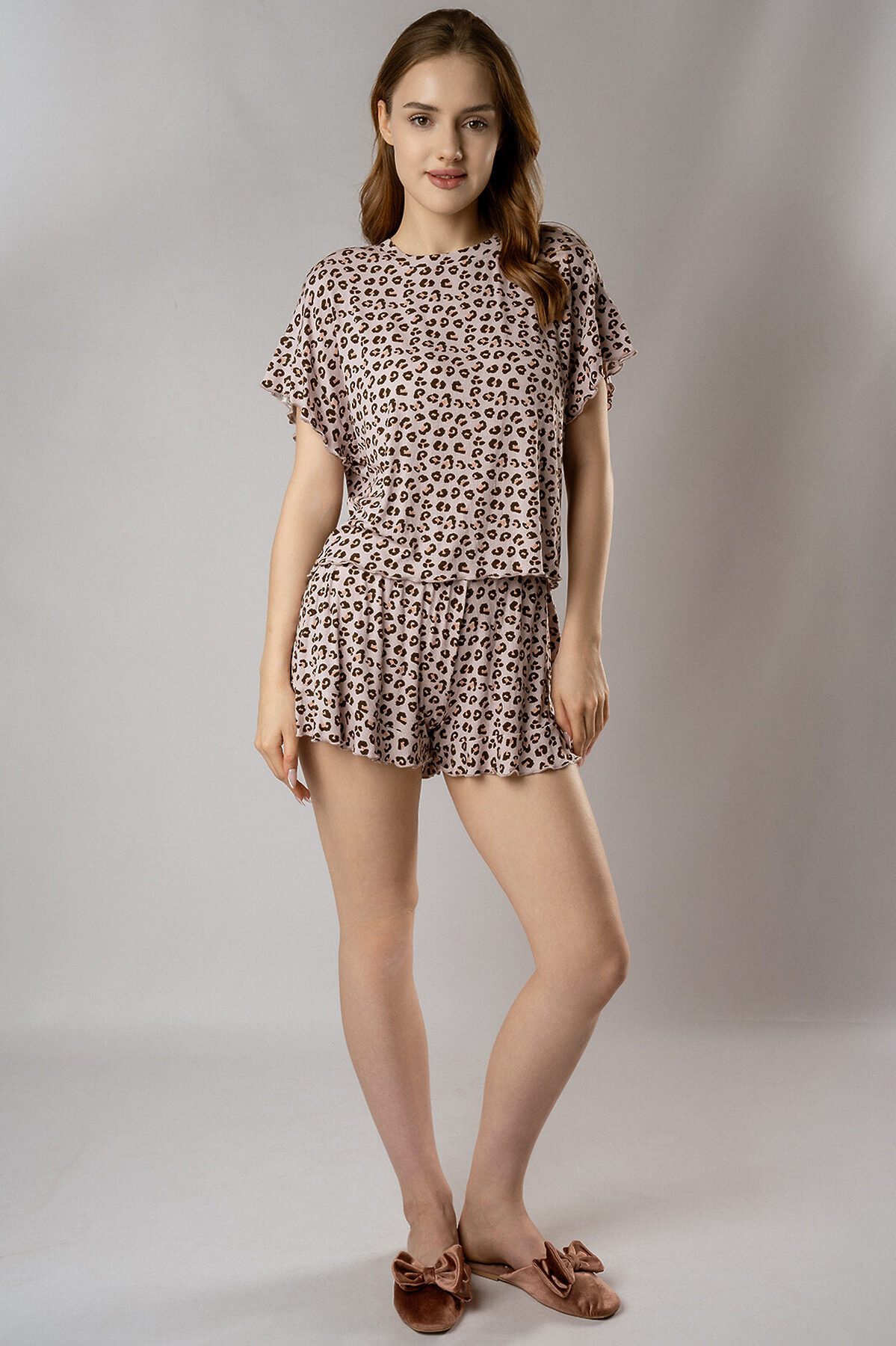 Пижама из нежной вискозы с фактурой в рубчик окутывает вас, как облако — настолько легкой и приятной кажется ткань. Футболка с выразительными плечами подчеркивает силуэт, а шорты идеально сидят на талии, даря полную свободу движений. Приглушенный леопардовый принт добавляет изюминку, не перегружая образ.