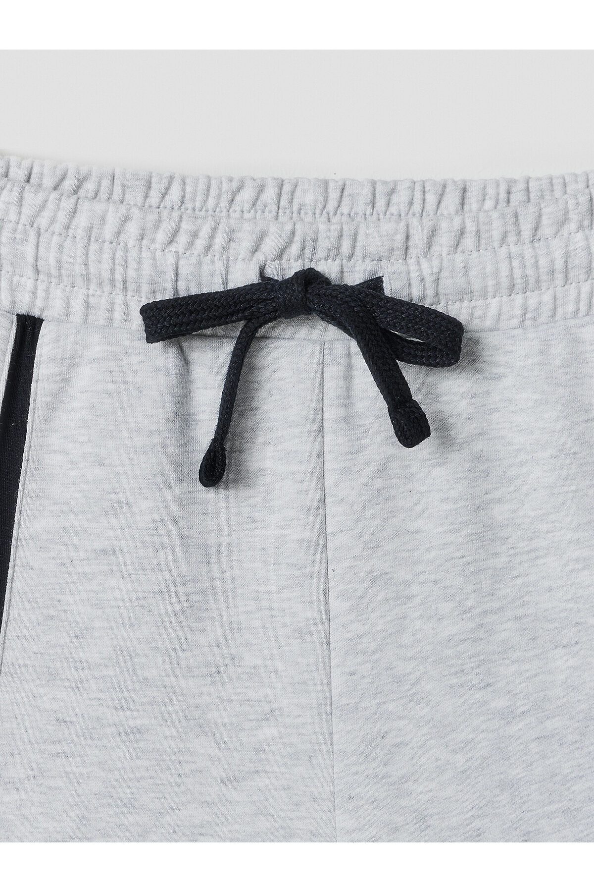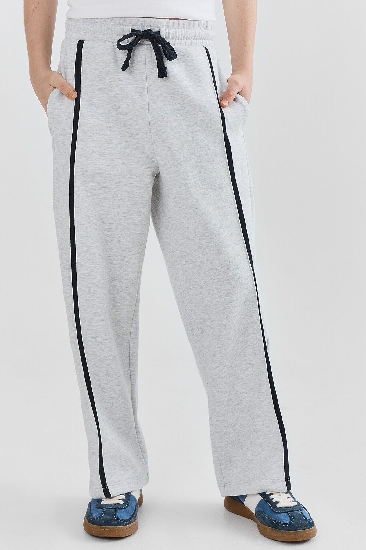 Брюки прямые свободные, посадка средняя. Пояс отрезной, с эластичной тесьмой внутри (внутренняя 50мм 50RV). С внешней стороны пробиты петли и вставлен шнур 10PX-2. В боковых швах обработаны карманы. По бокам лампасы из кулирки. Нижний срез брюк обработан швом вподгибку.