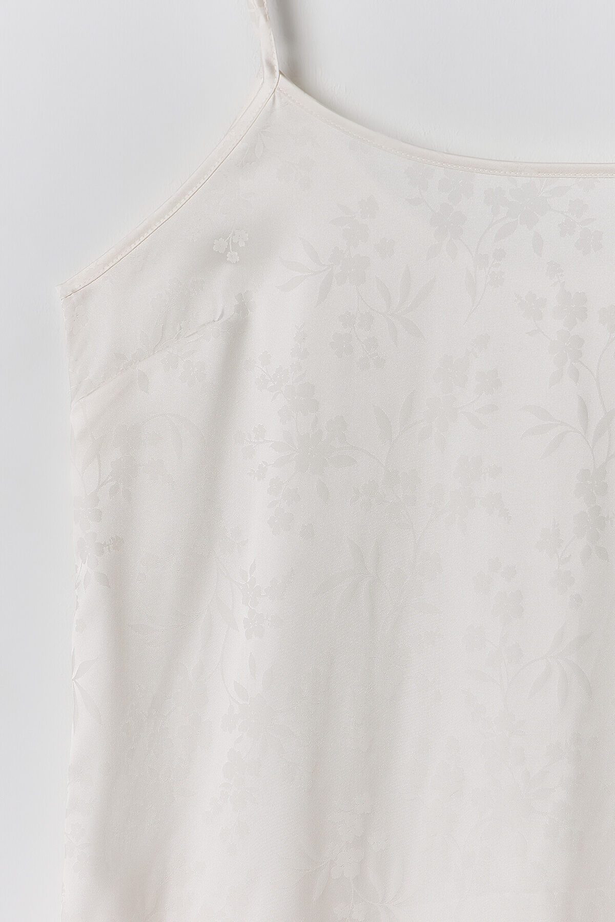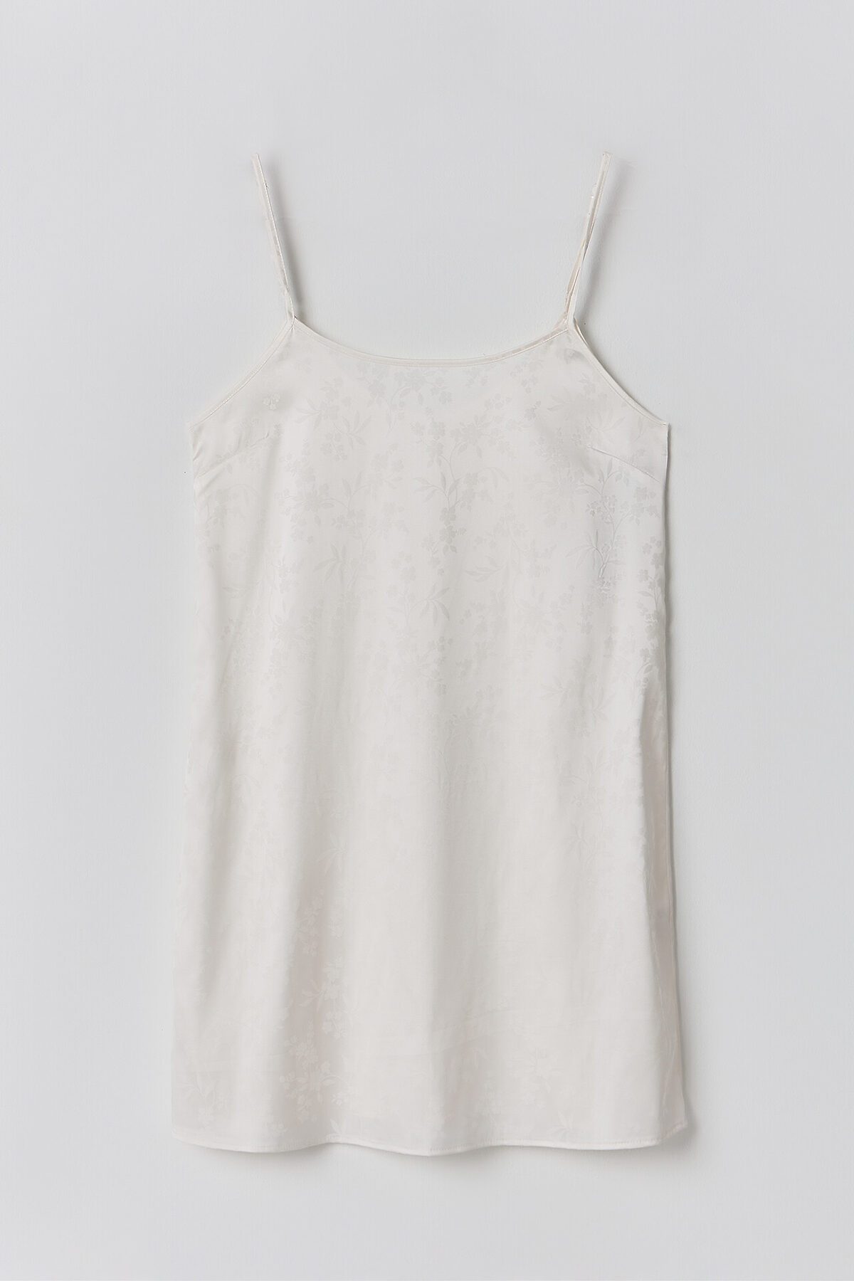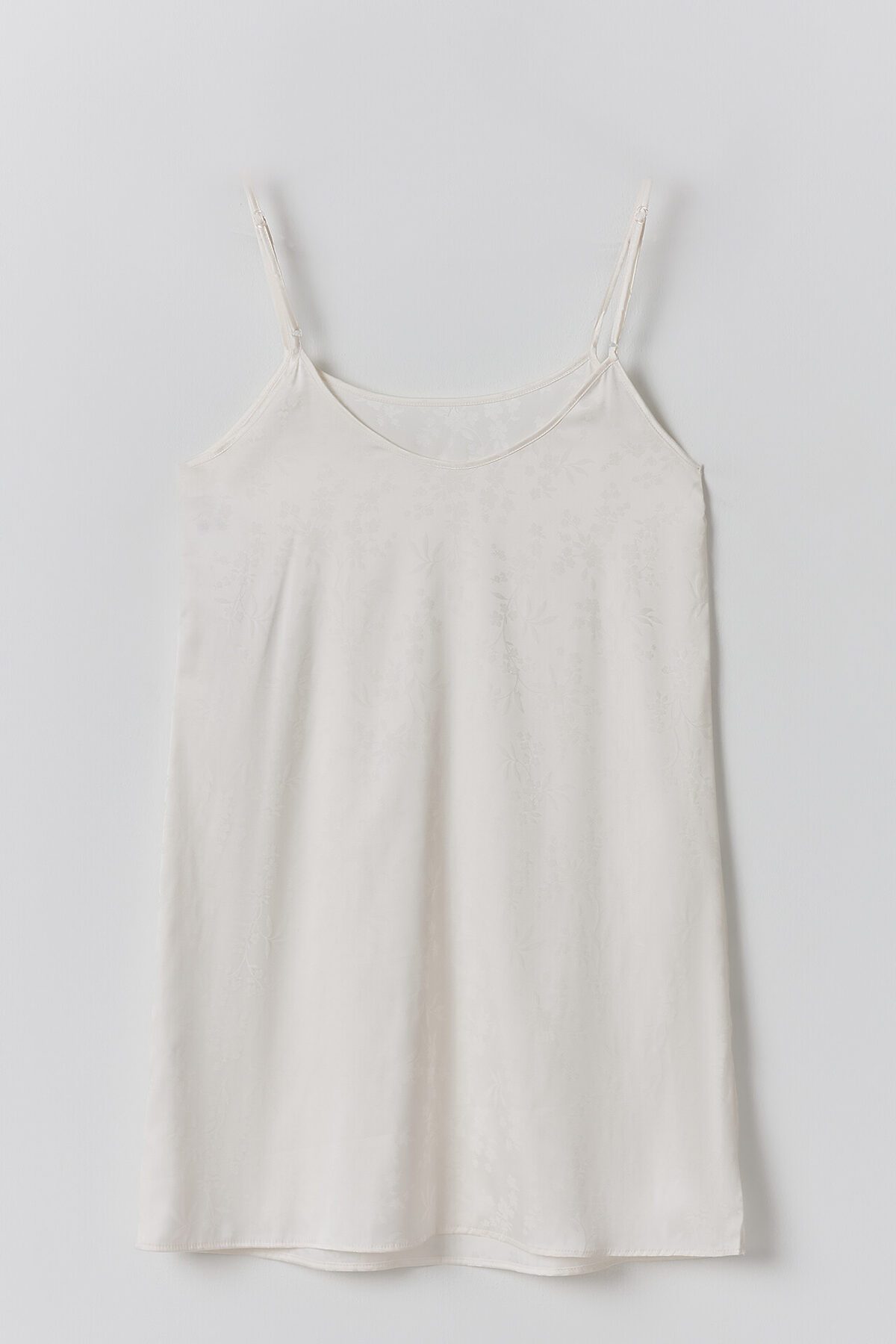 Комбинация свободного силуэта. Длина выше колена. Верхний край изделия обработан бейкой. Проймы обработаны бейкой из основного полотна, образуя бретели с регулировкой 6мм MPW606. Низ изделия обработан швом в подгибку.