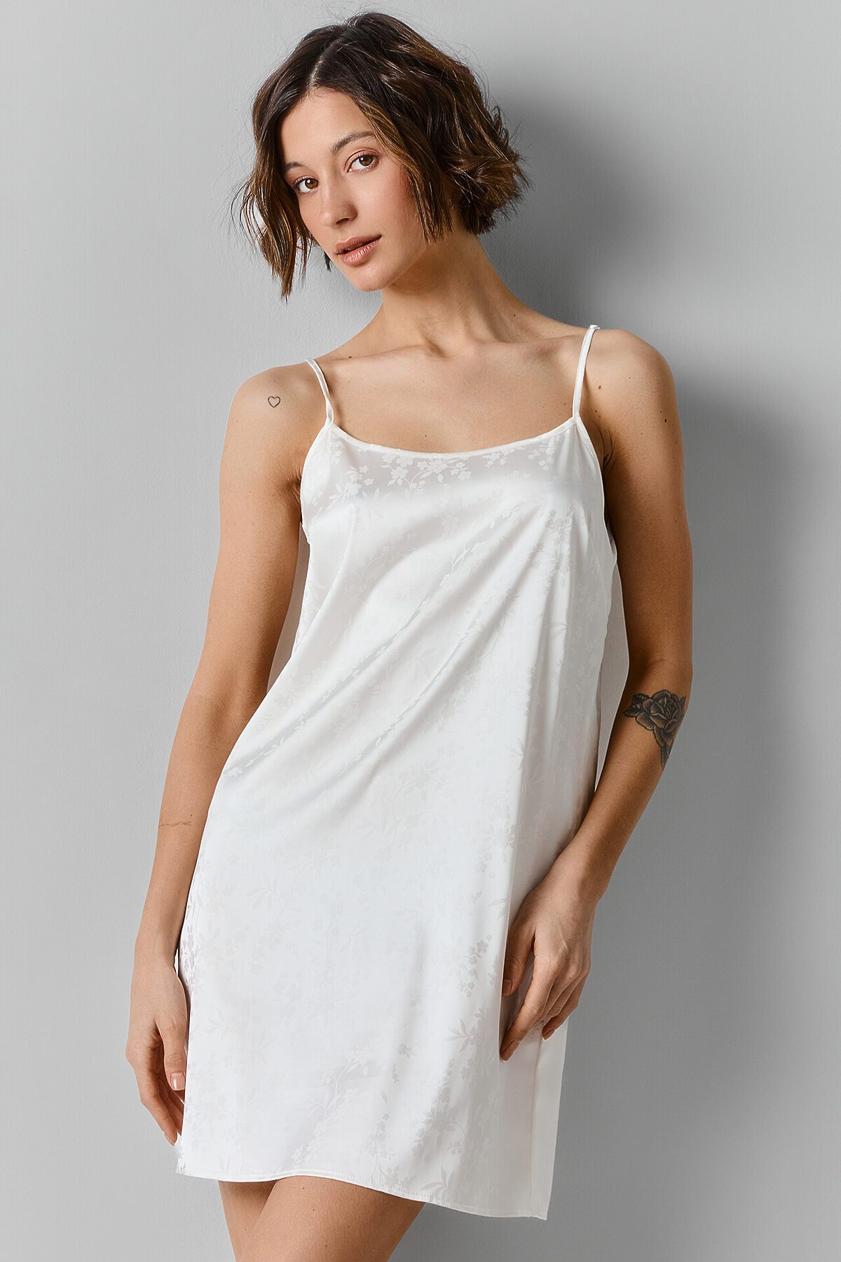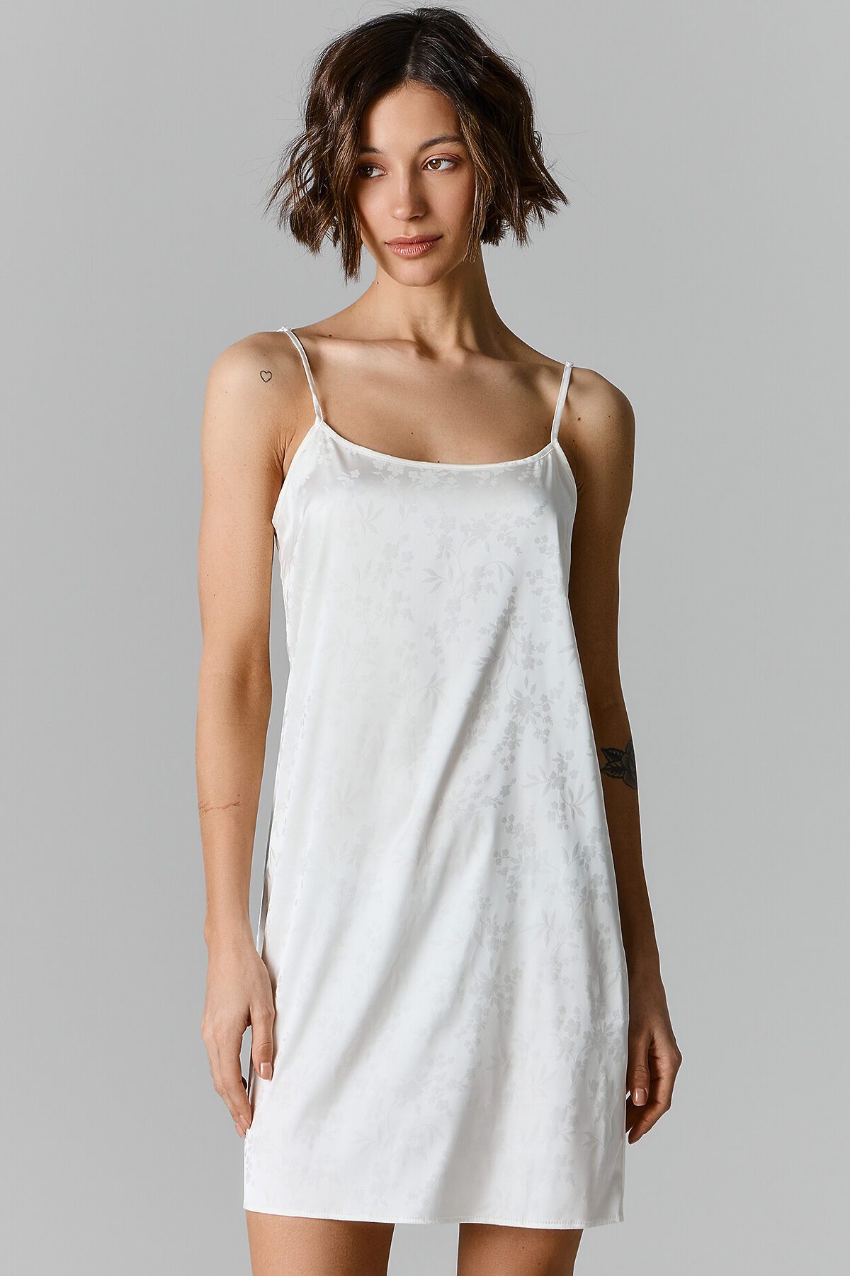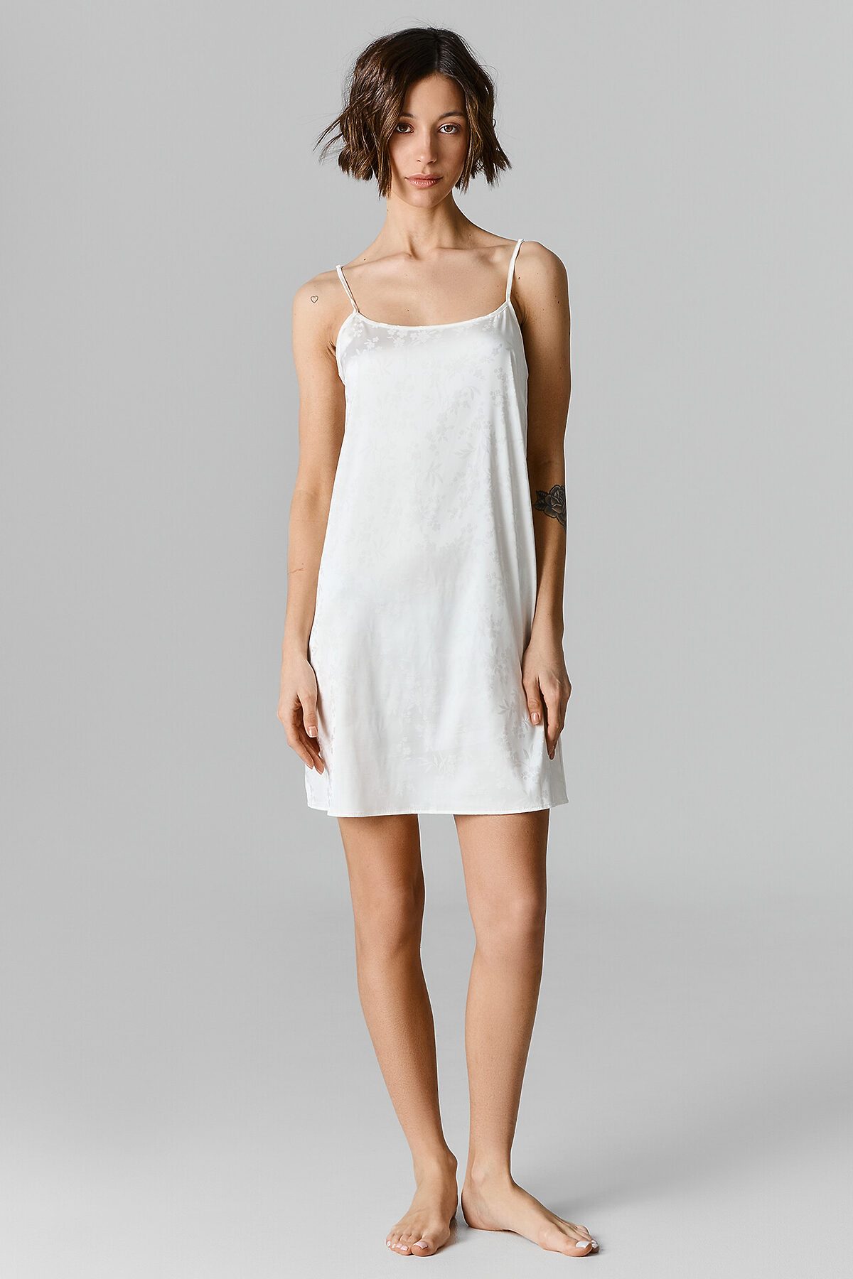 Комбинация свободного силуэта. Длина выше колена. Верхний край изделия обработан бейкой. Проймы обработаны бейкой из основного полотна, образуя бретели с регулировкой 6мм MPW606. Низ изделия обработан швом в подгибку.