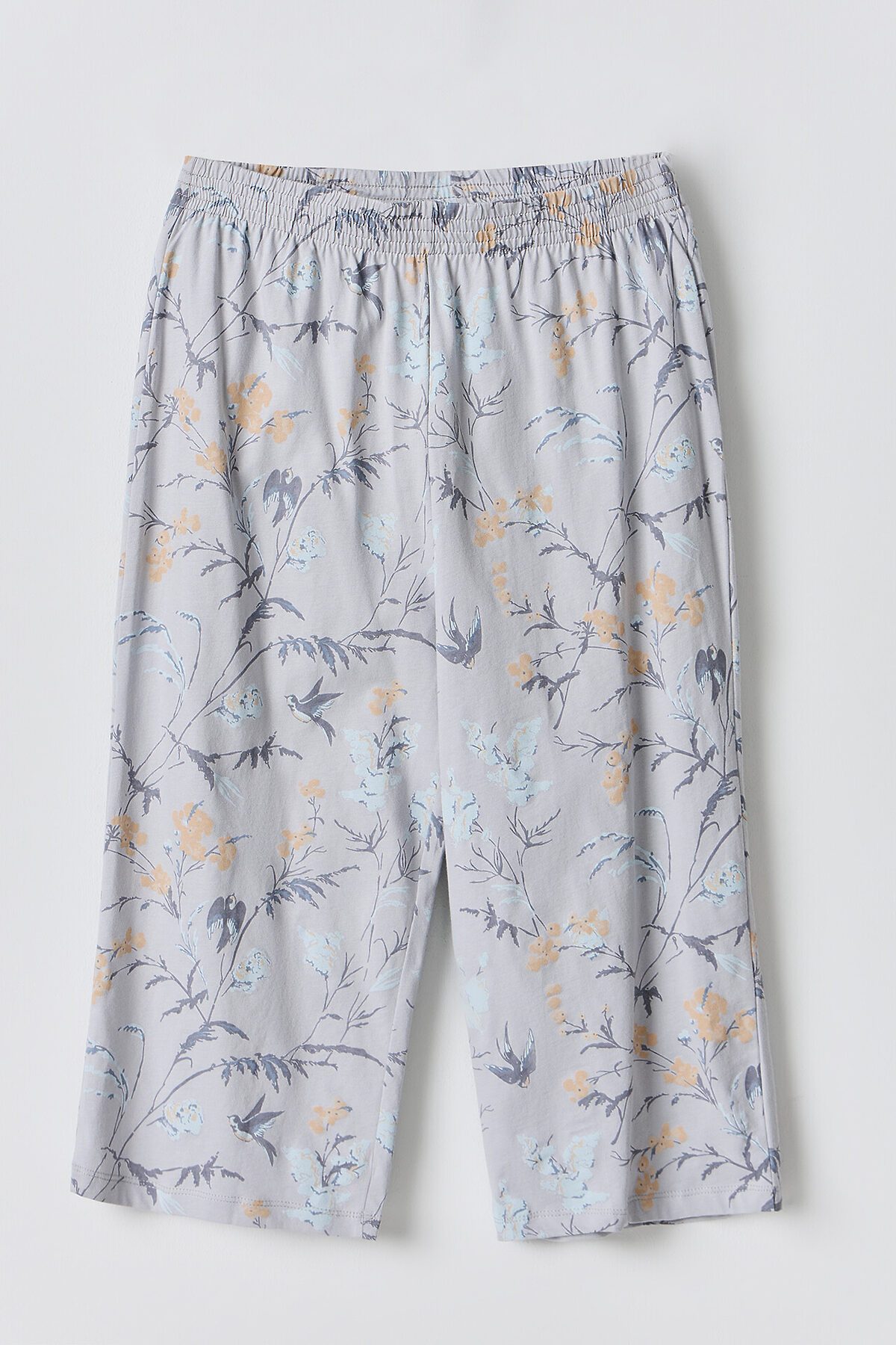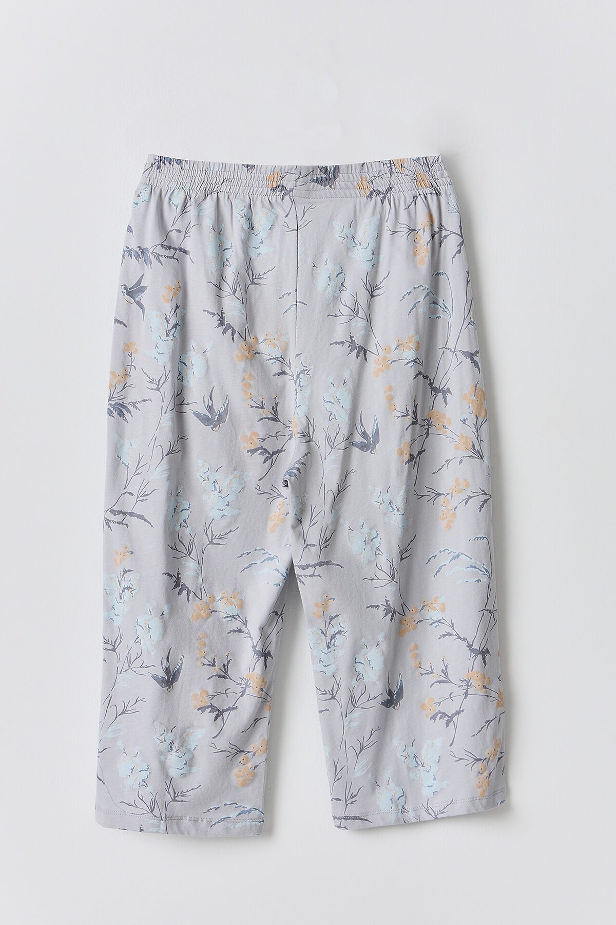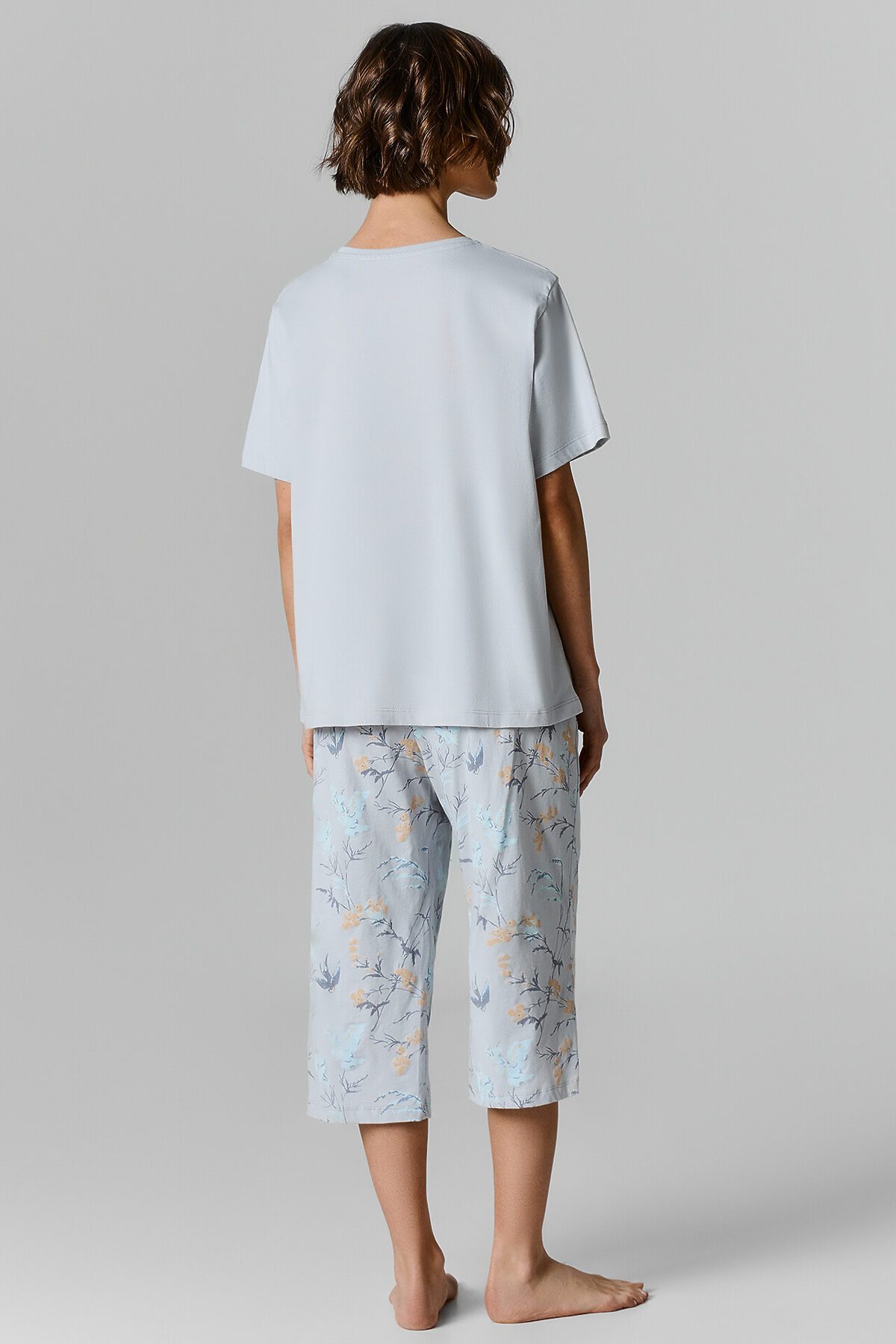Футболка свободного силуэта, перед и спинка цельнокроенные. Горловина обработана бейкой из основного полотна. Рукав втачной, короткий, одношовный. Низ изделия обработан швом в подгибку. Бриджи свободного силуэта, длиной до середины икры. Пояс цельнокроенный с эластичной тесьмой внутри 40RV. Низ изделия обработан швом в подгибку.