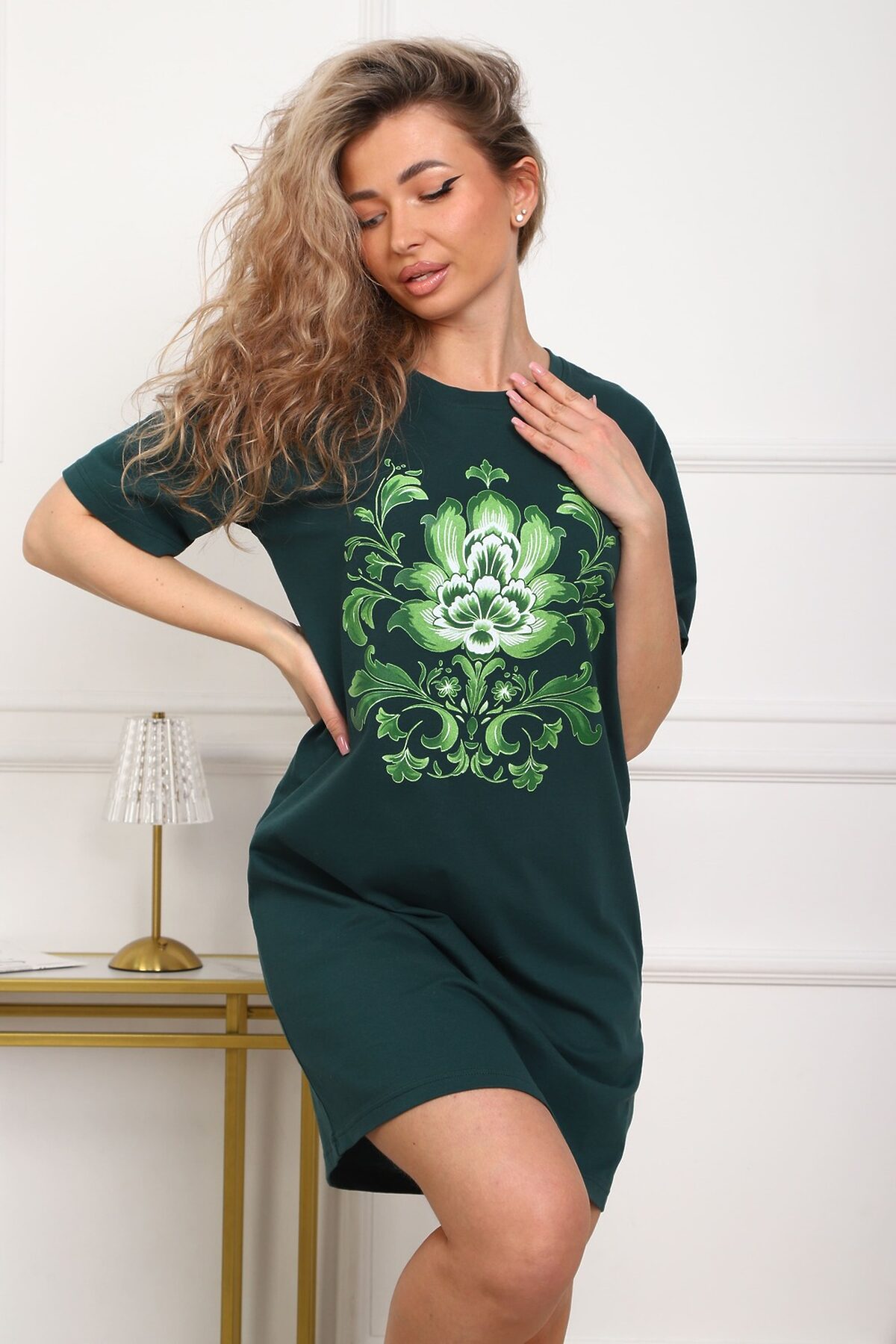 Туника женская прямого силуэта. Низ изделия прямой. Длинна выше колена, плечо спущенное, рукав короткий. Горловина круглой формы, обработана планкой с отделочной строчкой по шву притачивания. Принт (шелкография) располагается по центру переда.