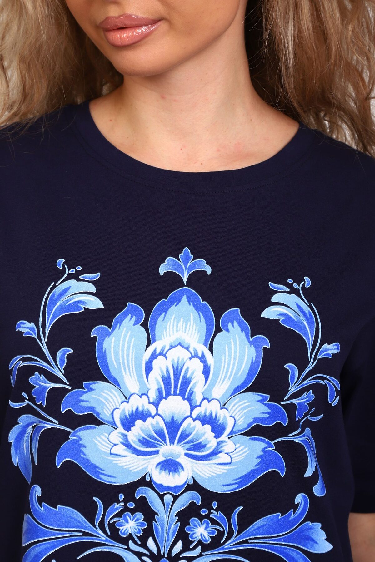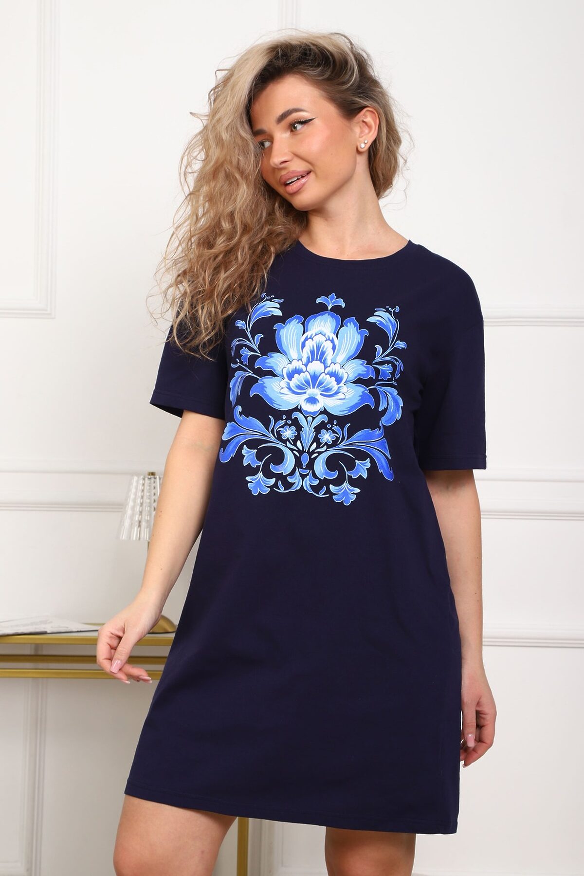 Туника женская прямого силуэта. Низ изделия прямой. Длинна выше колена, плечо спущенное, рукав короткий. Горловина круглой формы, обработана планкой с отделочной строчкой по шву притачивания. Принт (шелкография) располагается по центру переда.