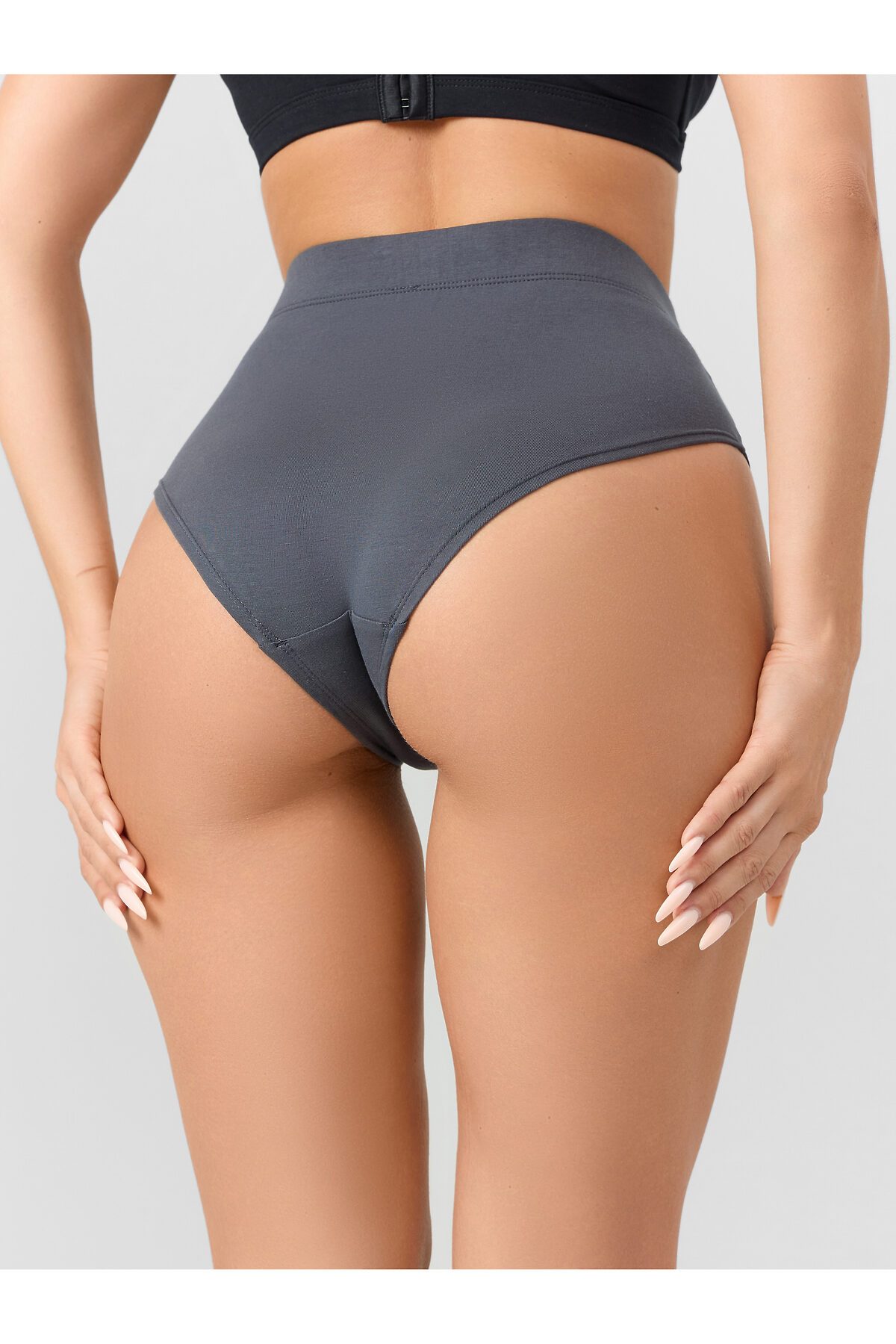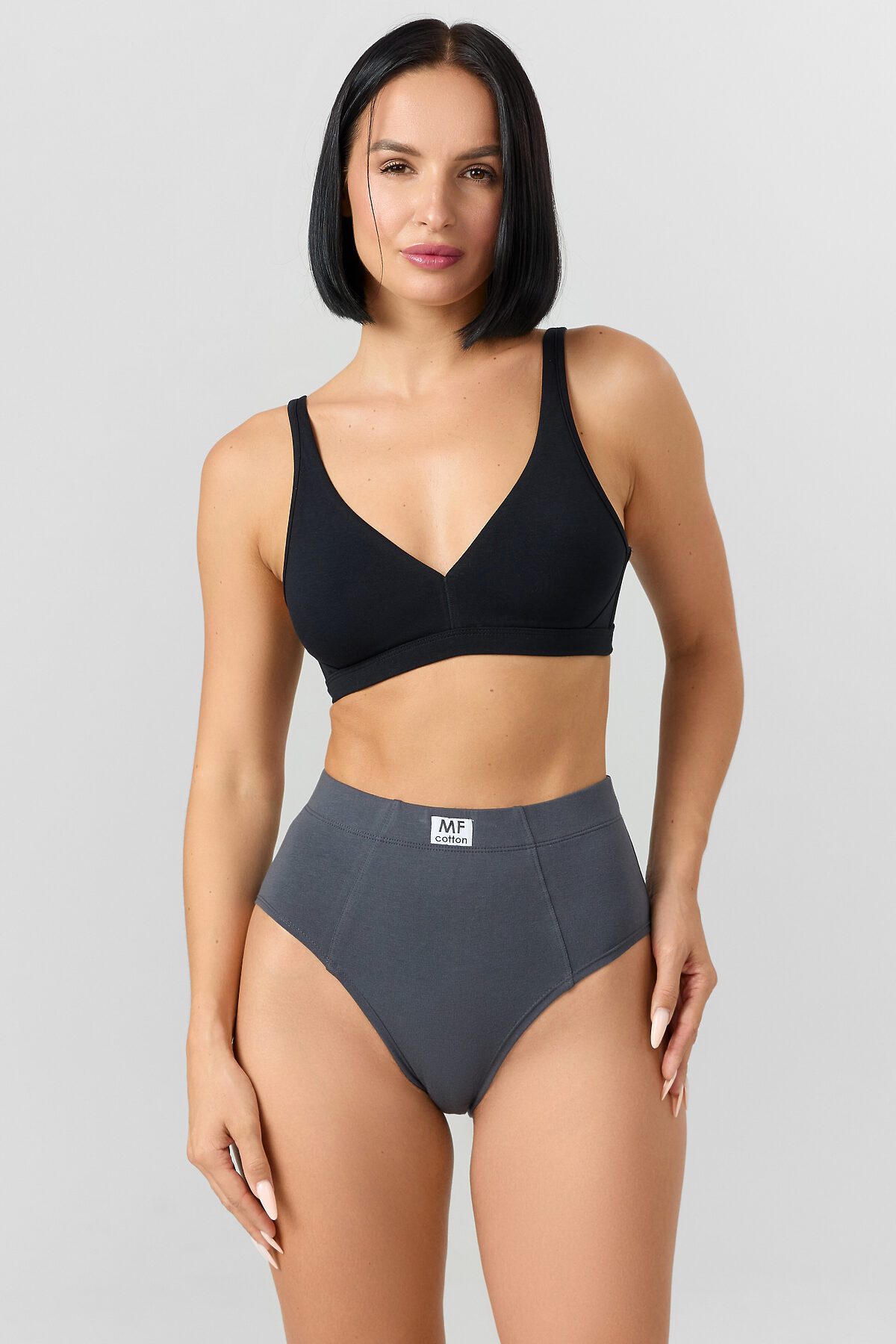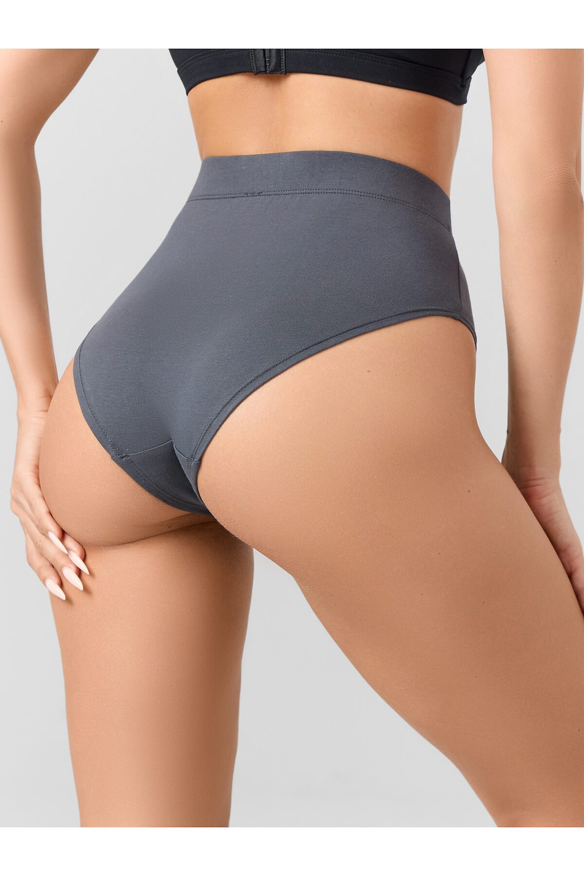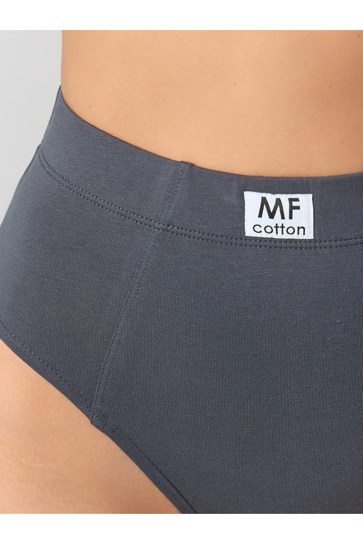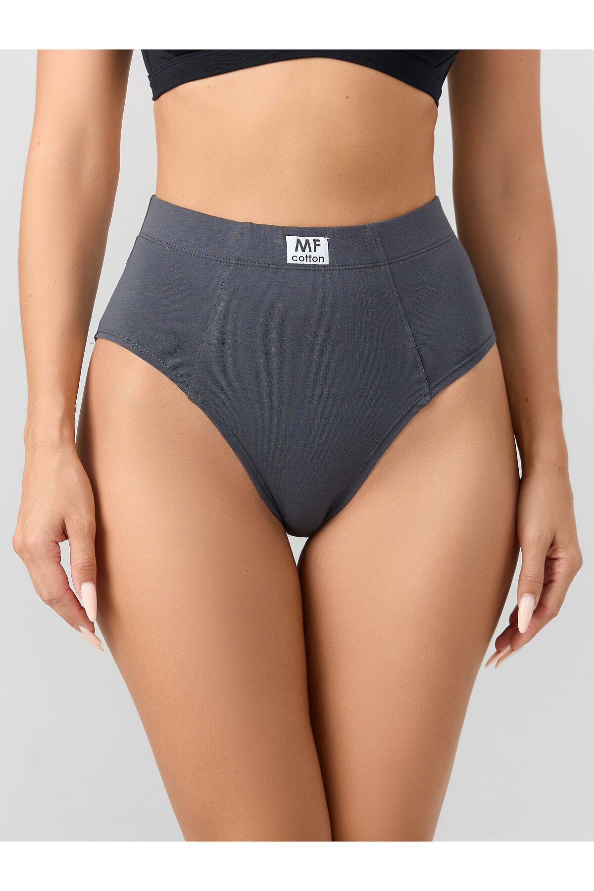 Трусы женские макси с высокой посадкой из кулирной глади. На передней детали рельефы с отделочными строчками. Ластовица отлетная по переднему краю. Задняя деталь цельная. Талия обработана швом подгибку с эластичной тесьмой внутри (внутренняя эл.тесьма). Ножки обработаны швом вподгибку на плоскошовной машине. По центру на передней детали на поясе декор - тканая этикетка.