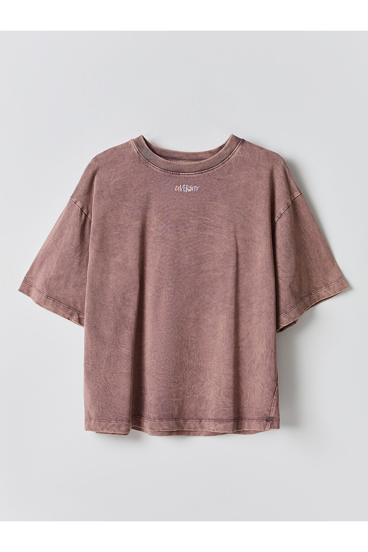 Футболка изготовлена из трикотажного полотна кулирка. Футболка свободная, оверсайз. Горловина округлой формы обработана обтачкой из рибаны. Шов втачивания обтачки по спинке закрыт тесьмой хб 10мм.Рукава втачные, корткие. Линия плеча спущена. Нижние срезы футболки и рукавов обработаны швом вподгибку.