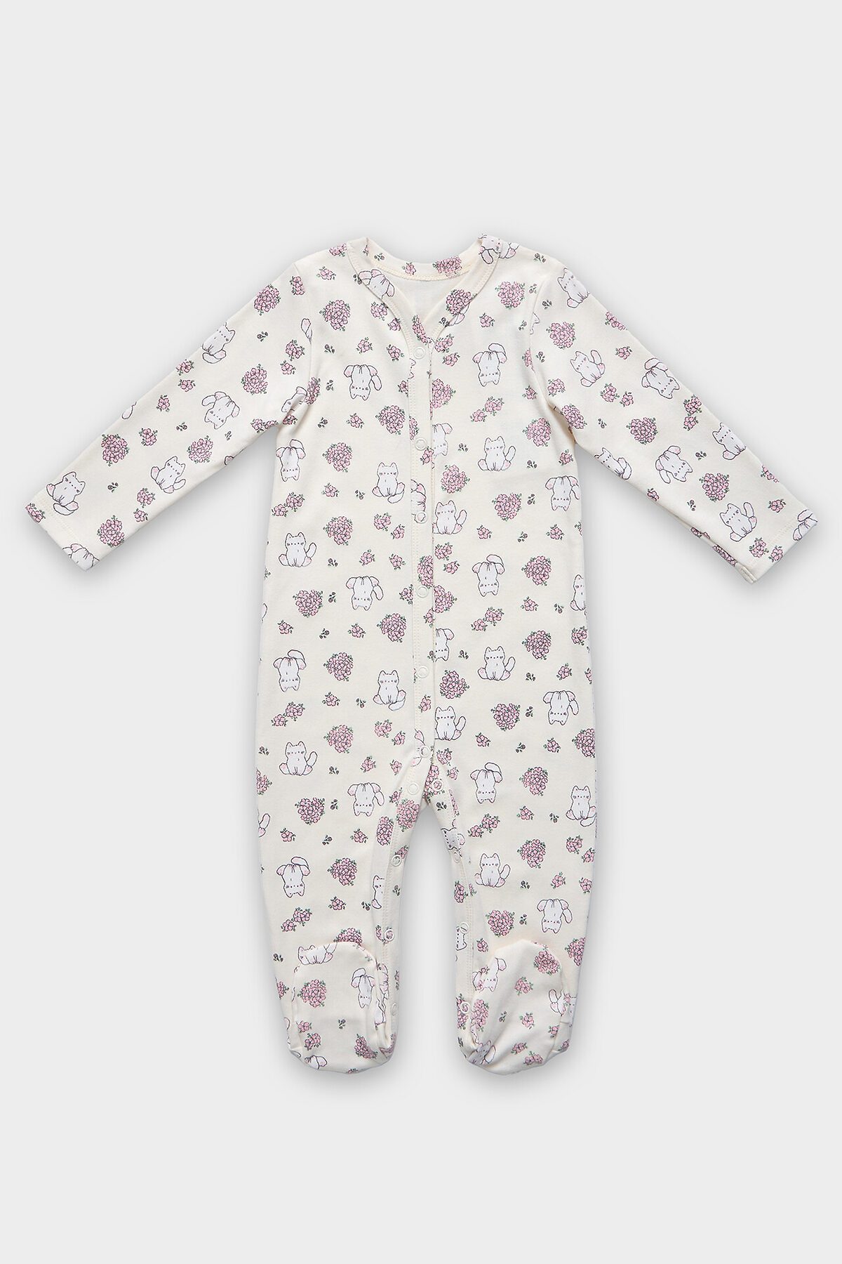 Удобная застежка-кнопки проходит от горловины до низа и переходит на левую ножку, что значительно упрощает процесс переодевания и смену подгузника. Длинные рукава и штанины-следки надежно защищают ручки и ножки от прохлады, сохраняя оптимальную температуру тела. Горловина аккуратно обработана для комфорта нежной кожи, исключая раздражение. Наличие ластовицы в шаговом шве добавляет свободы движений во время сна или активных игр.