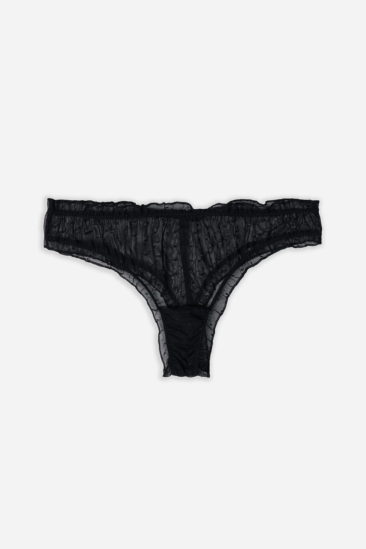 Трусы женские, средняя линия талии, силуэт - бразилиано. Передняя и задние детали выполнены из сетки. Подкладка ластовицы из хлопка, верхний срез подкладки ластовицы отлетной. По верхнему срезу трусов и по ножкам рюша из сборки, под низом жилка.