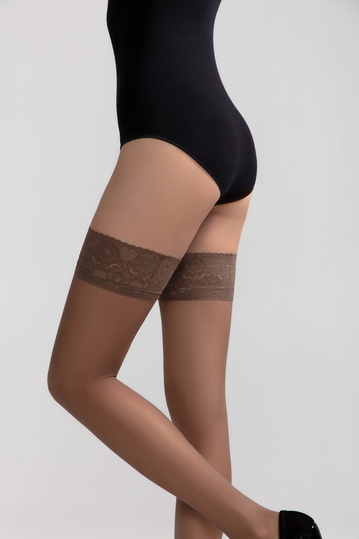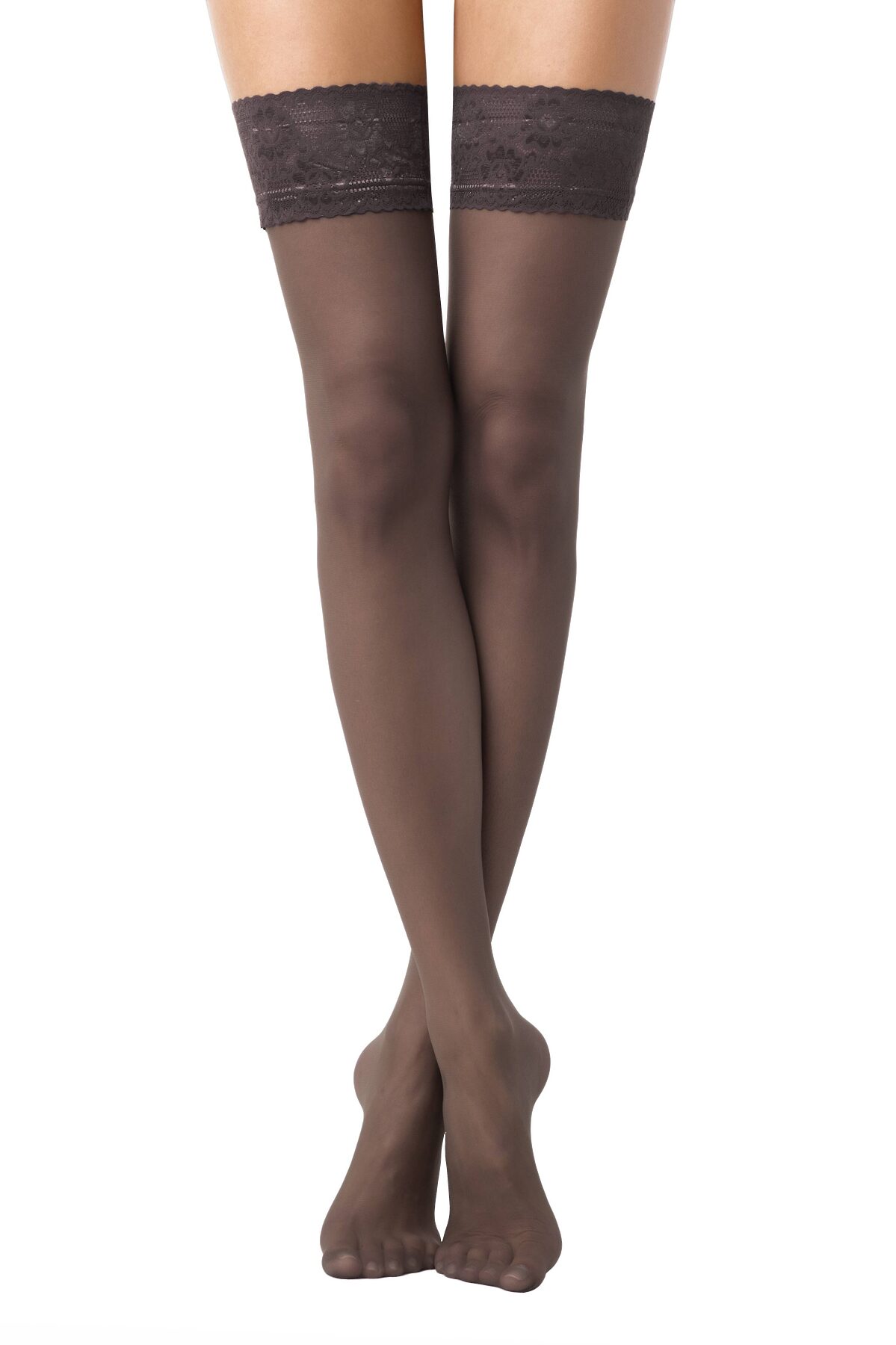 Плотные чулки из мультифиламентных нитей с ажурной самоподдерживающейся эластичной резинкой