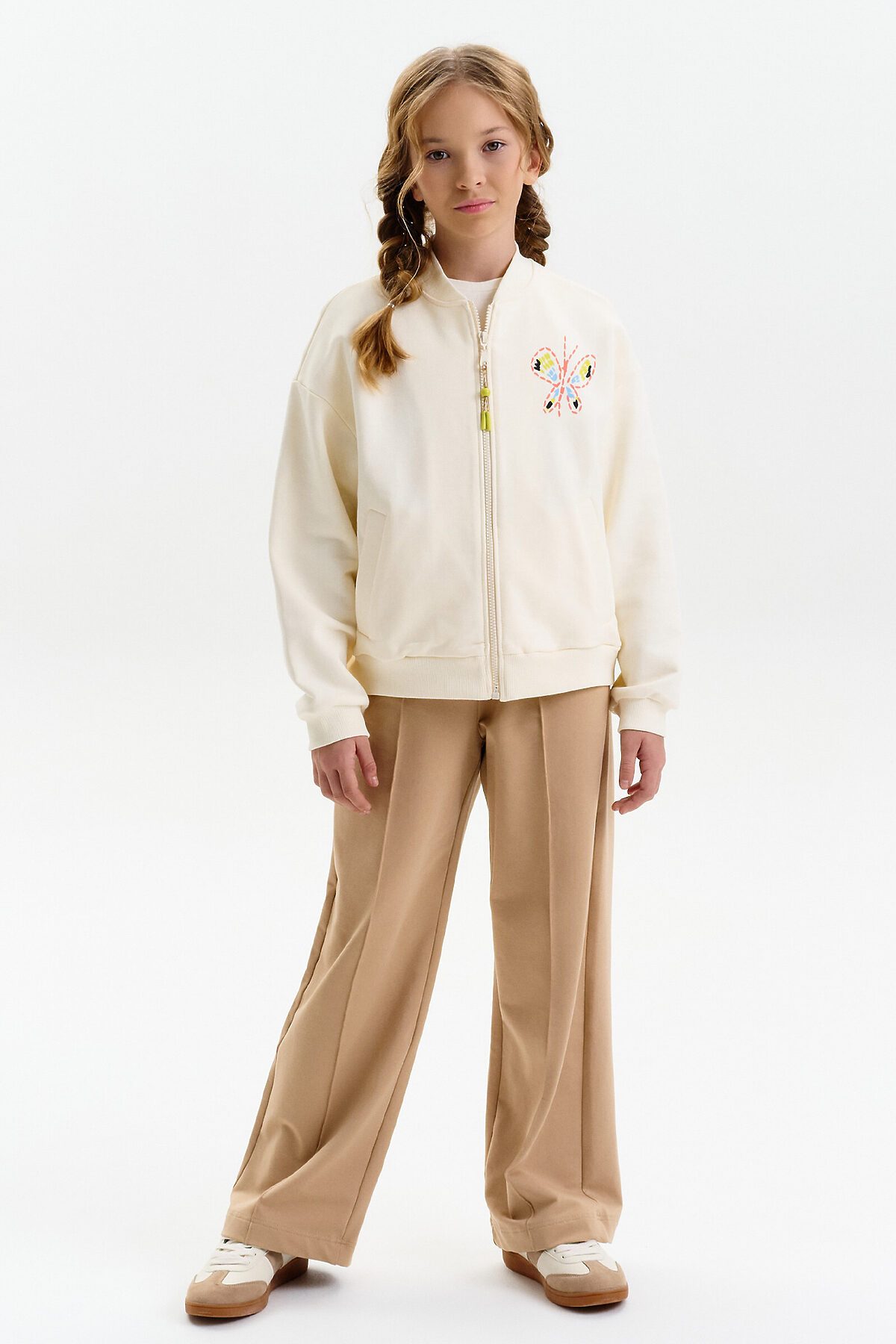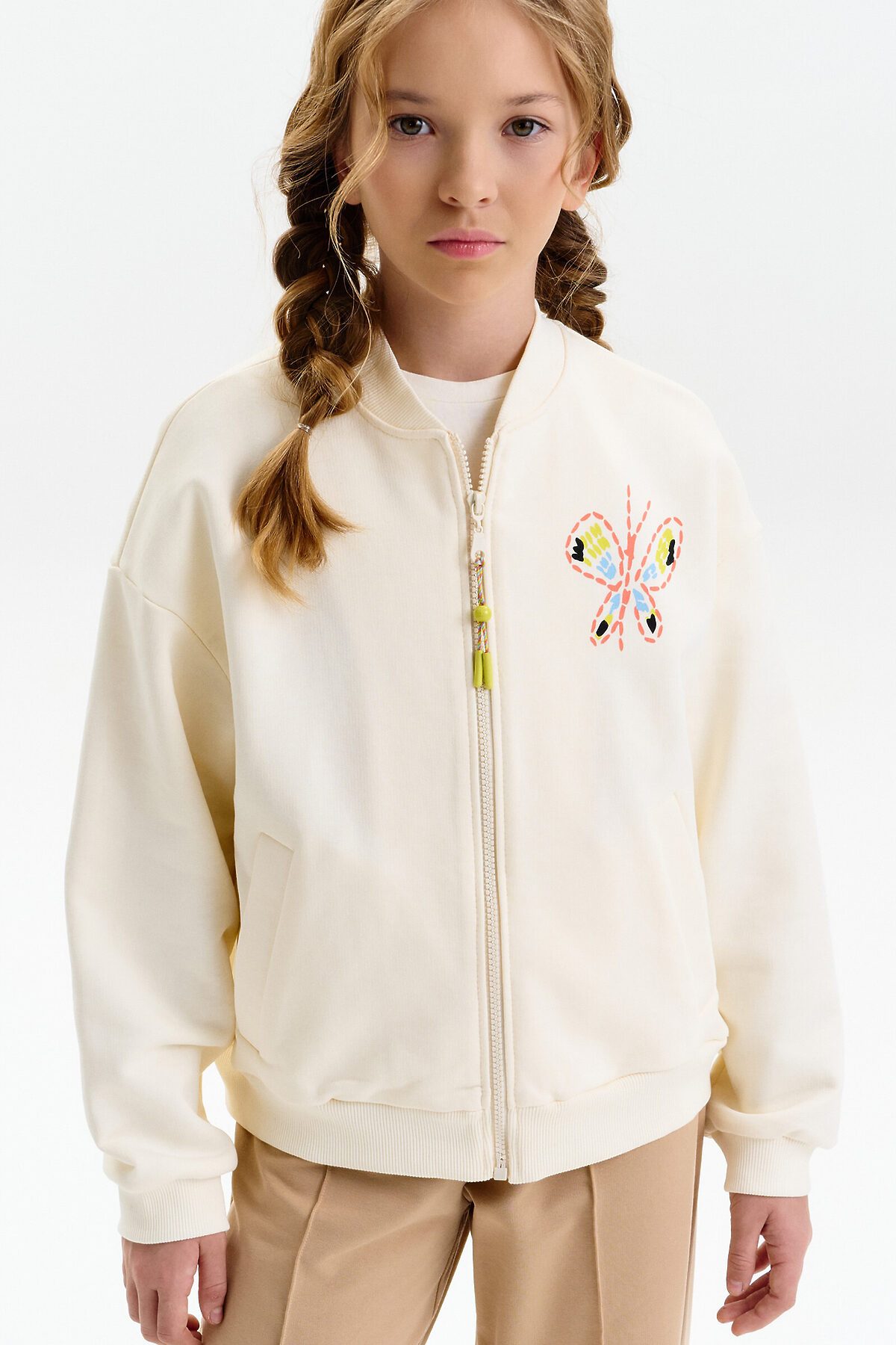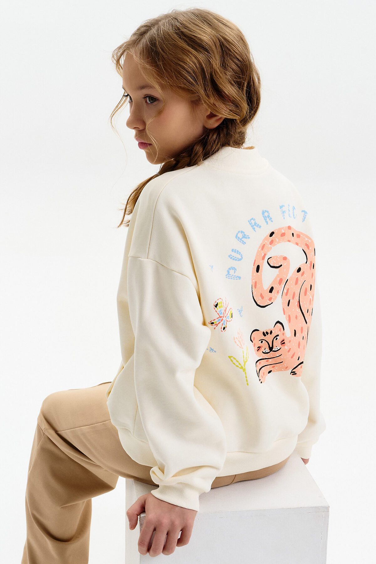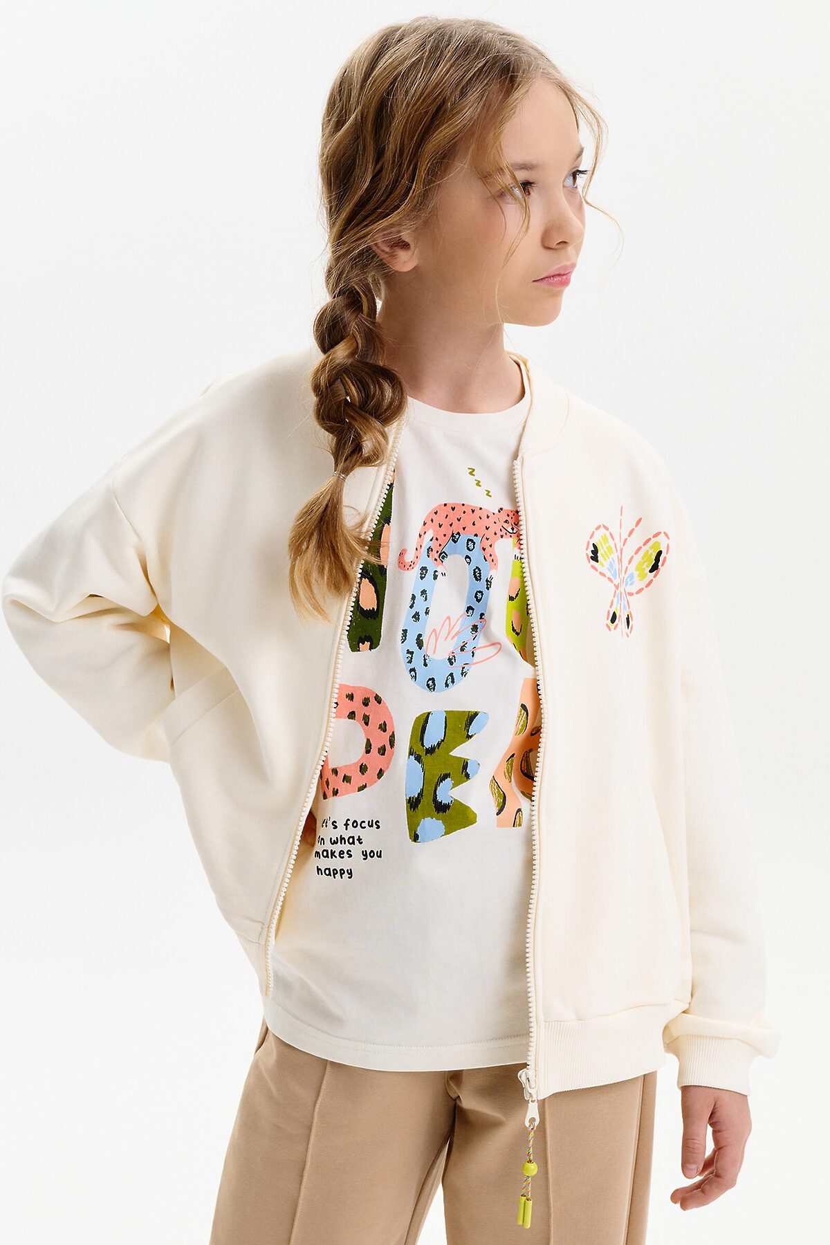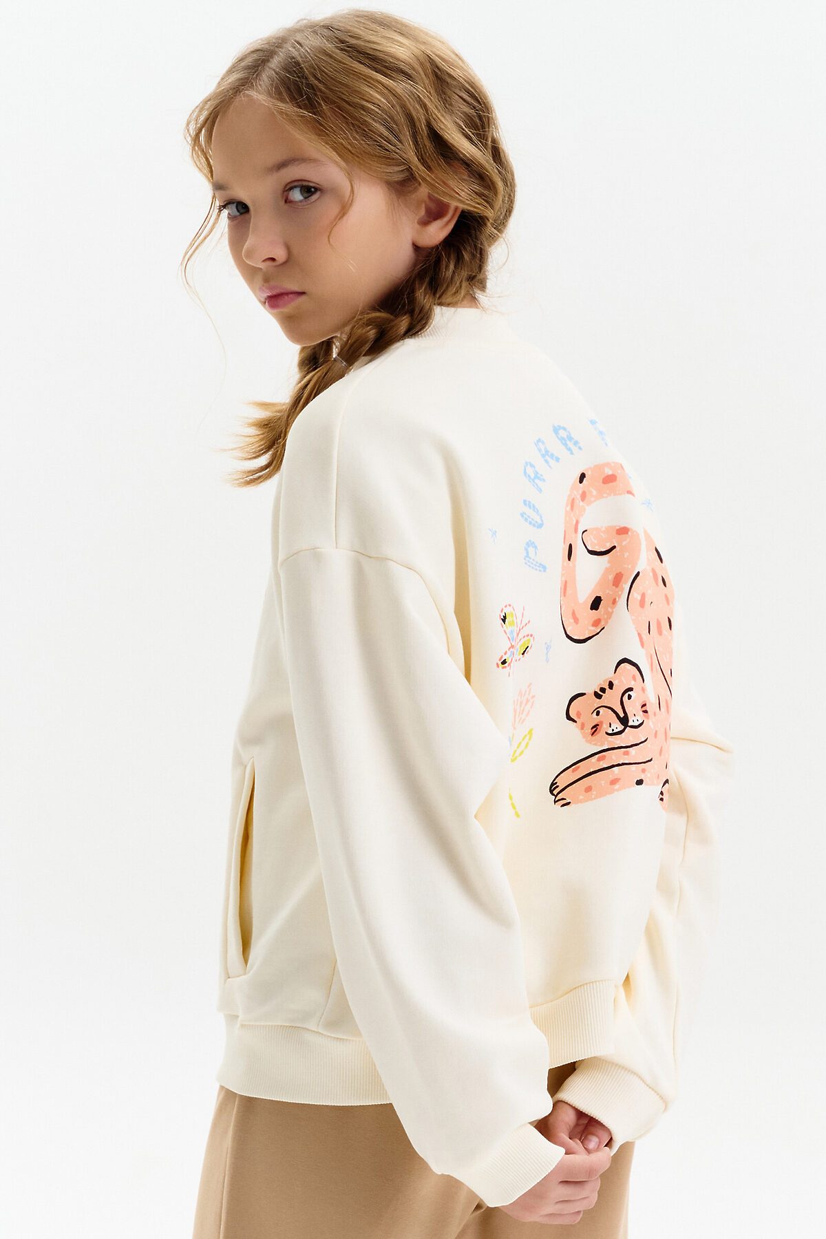 Толстовка oversize для девочки. Модель средней длины из мягкого хлопкового футера, плотностью 342 гр/кв м. Свободный крой с объёмом по линии груди и низа, мягкое спущенное плечо. Застёжка на центральную молнию. Узкий воротник-стойка и плотные манжеты на рукавах и по низу изделия из эластичной рибаны создают стильную имитацию бомбера. По бокам — удобные прорезные карманы с листочки. Перевод: ПУРРР ФЕКТ(ПЕРФЕКТ)