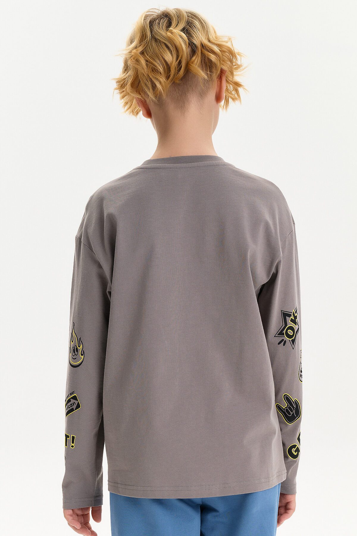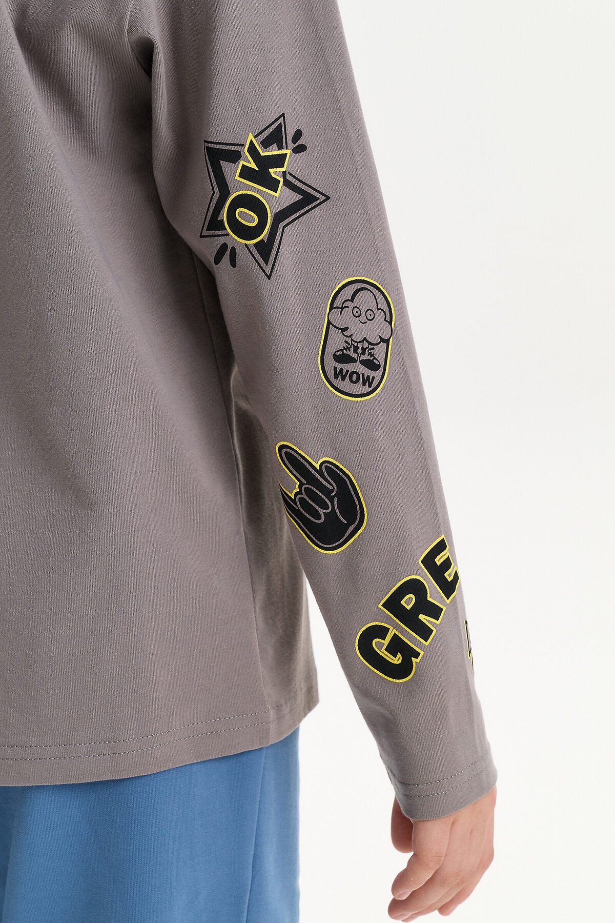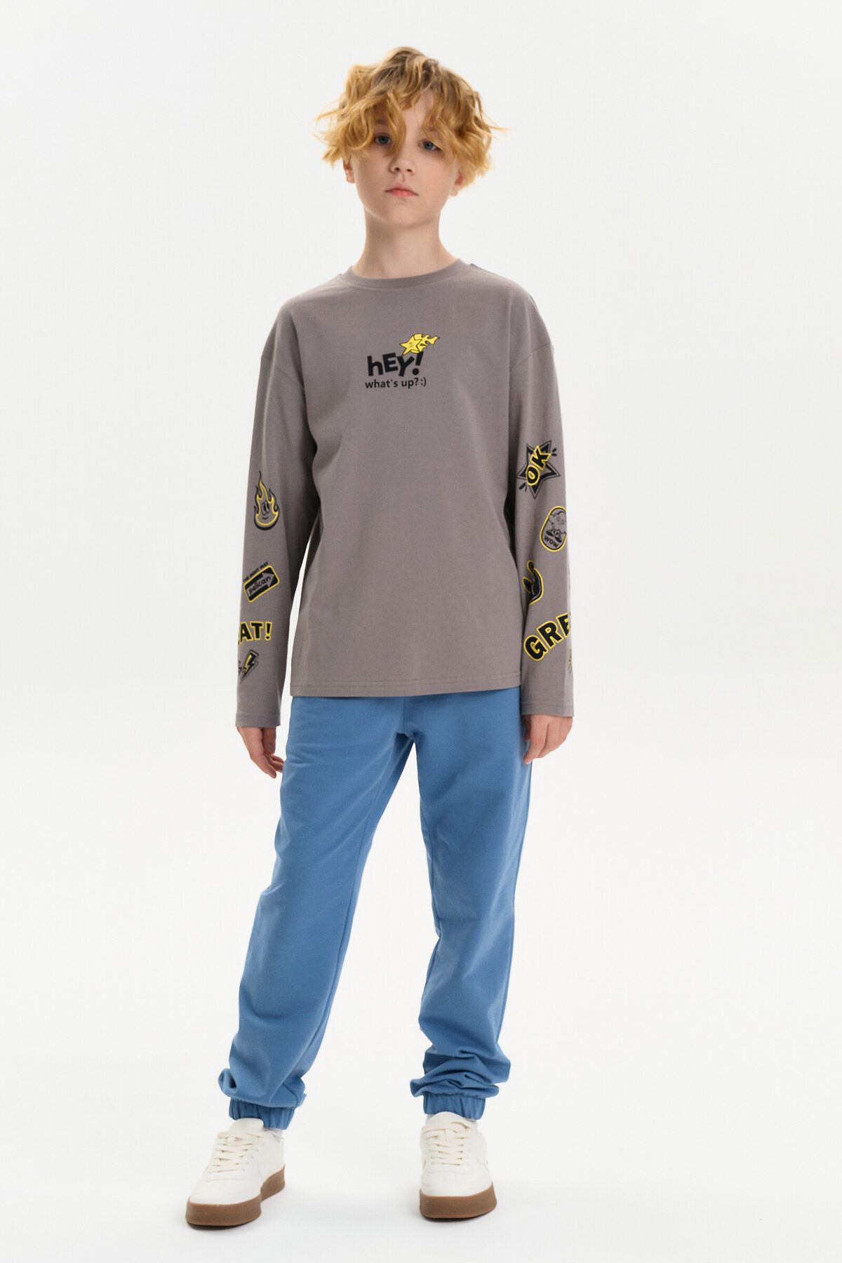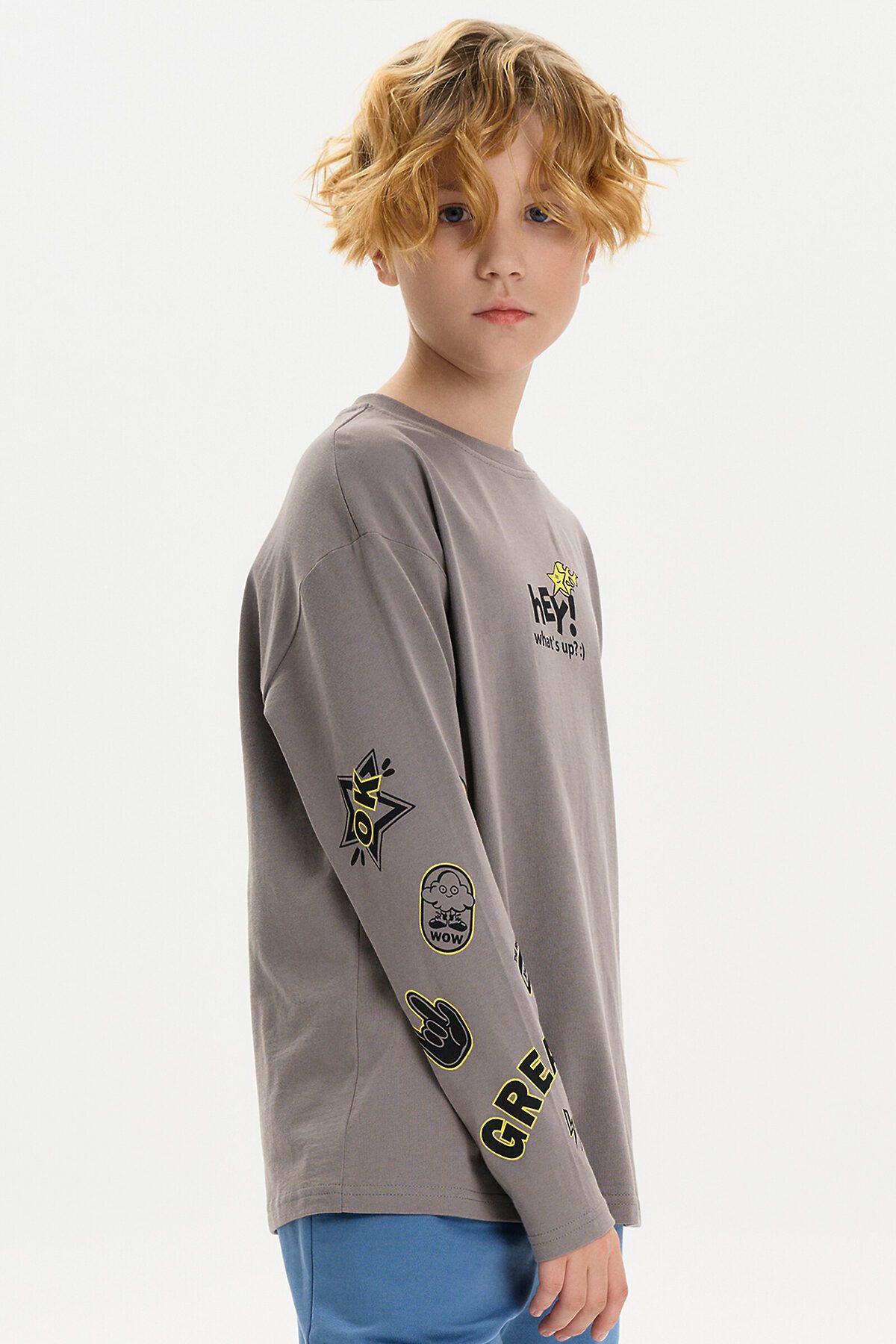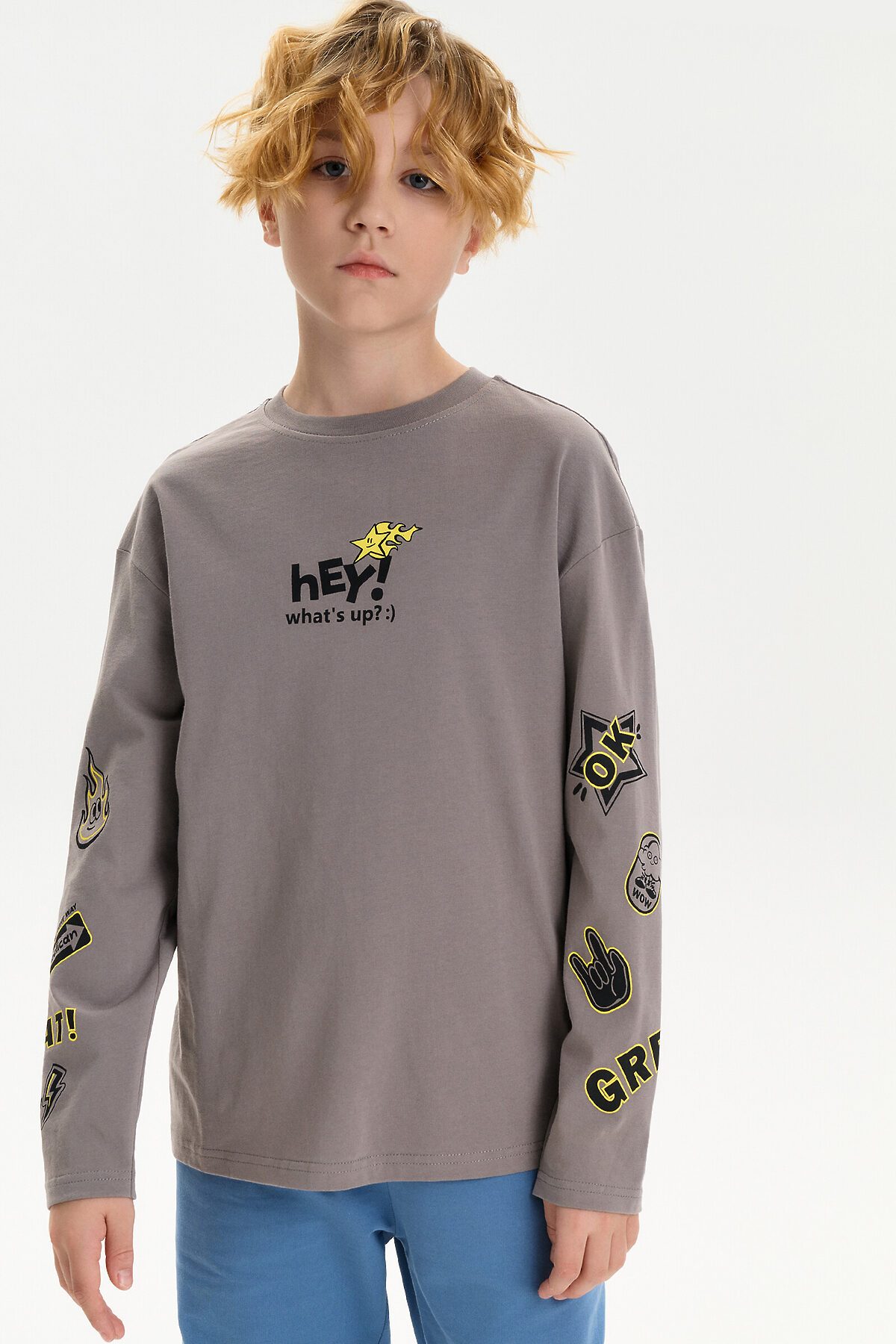Лонгслив для мальчика умеренного объема. Чуть укорочена сдлина в сравнении с Осень 25. Горловина обработана эластичной рибаной - голова не застрянет. Лонгслив украшен молодежным принтом, перевод надписей: Эй! Как дела?: Ok: Вау: Правильный путь: Отлично! Принт эластичный и прочный, без проблем переносит частые стирки.