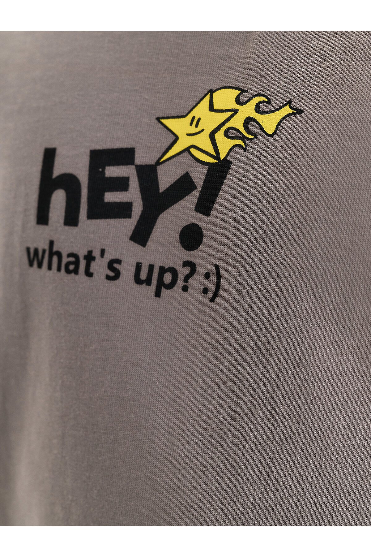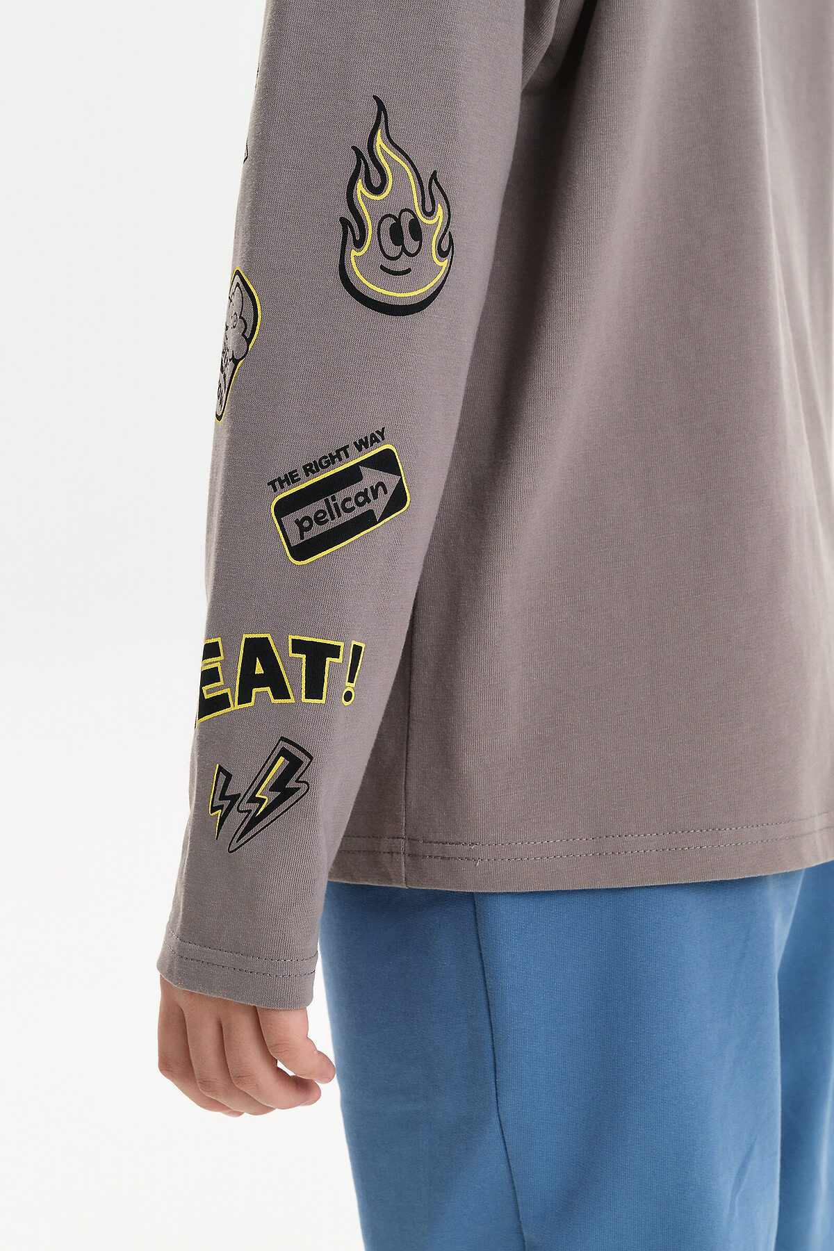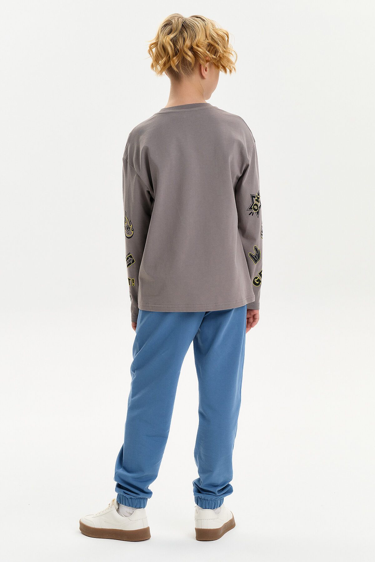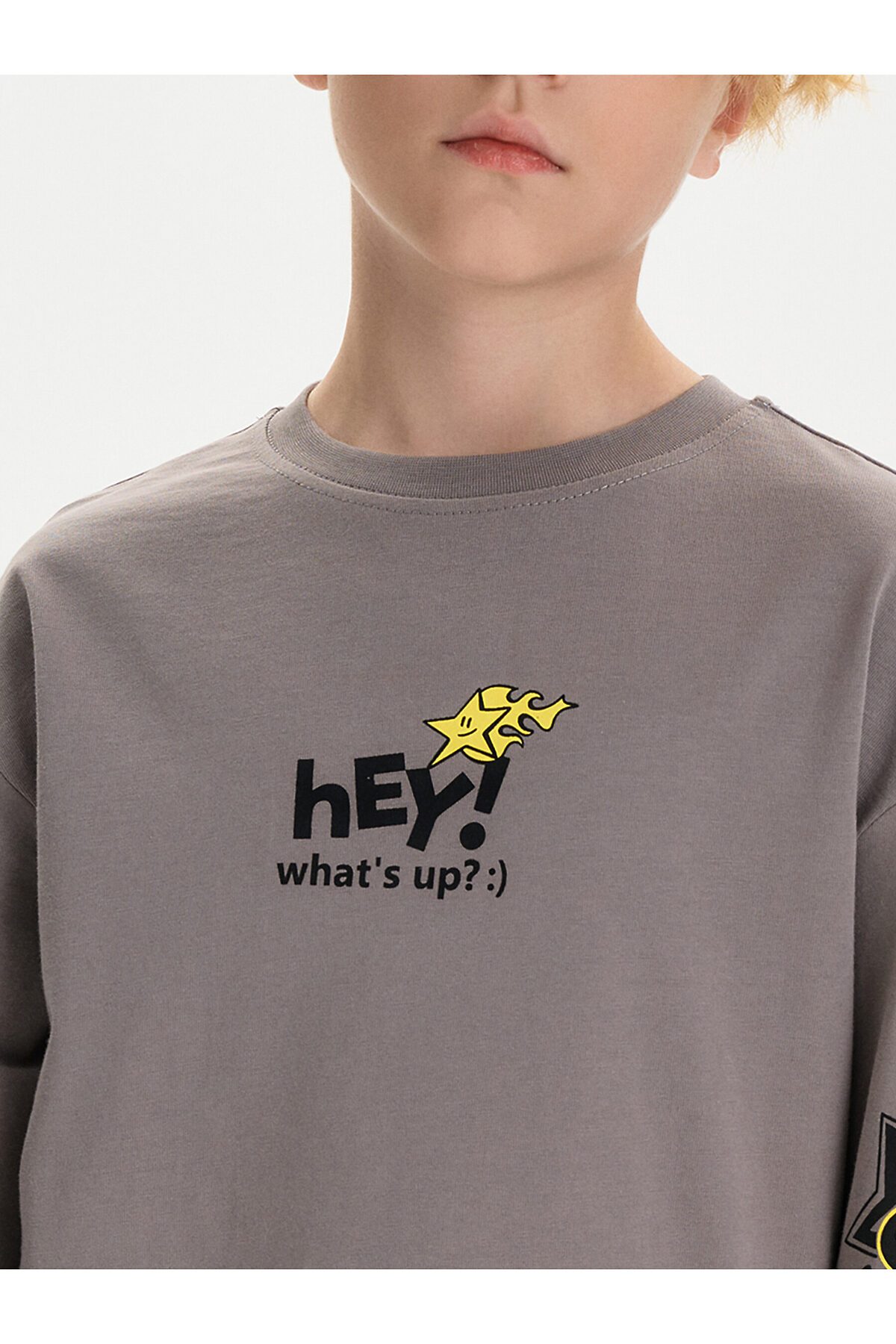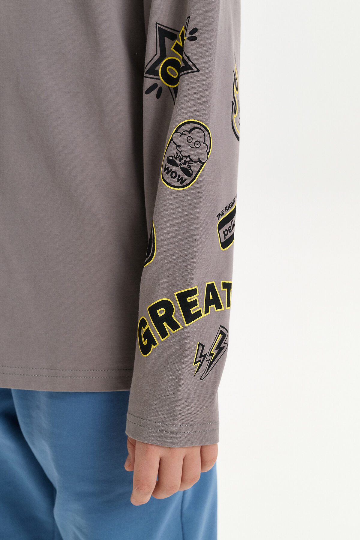 Лонгслив для мальчика умеренного объема. Чуть укорочена сдлина в сравнении с Осень 25. Горловина обработана эластичной рибаной - голова не застрянет. Лонгслив украшен молодежным принтом, перевод надписей: Эй! Как дела?: Ok: Вау: Правильный путь: Отлично! Принт эластичный и прочный, без проблем переносит частые стирки.