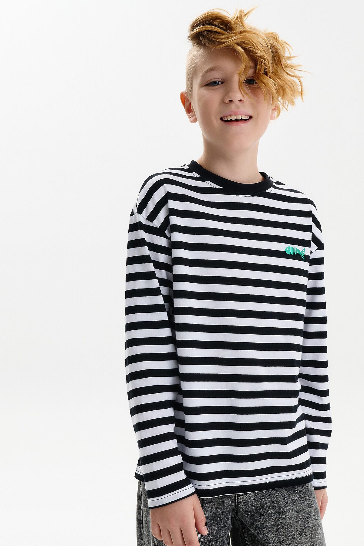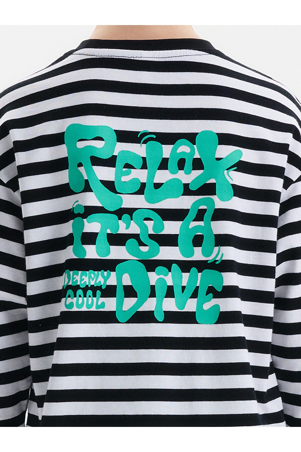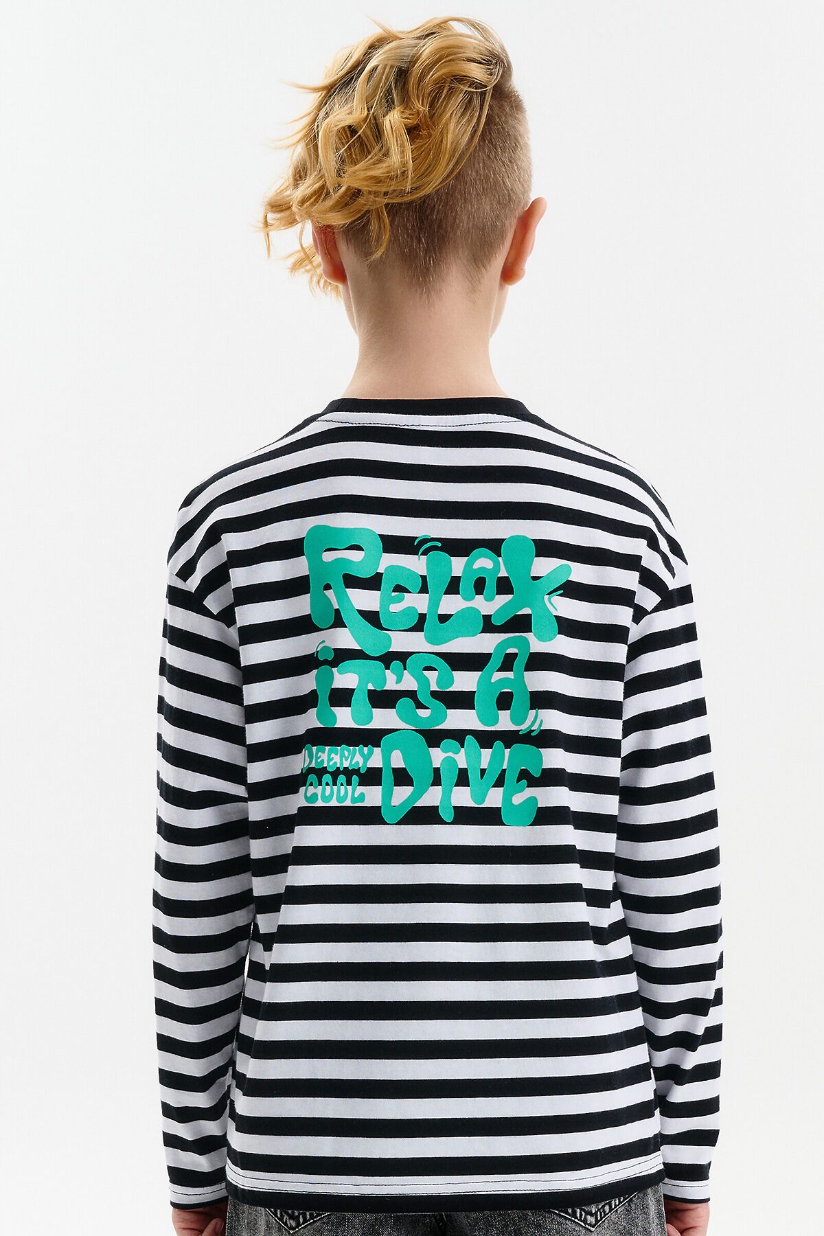 Лонгслив для мальчика с принтом. Тельняшка свободного силуэта со спущенным плечом выполнена в морском стиле. Горловина обработана эластичной рибаной - голова не застрянет. Изделие украшено ярким принтом с надписью. Перевод надписи: расслабьтесь, это очень крутое погружение.