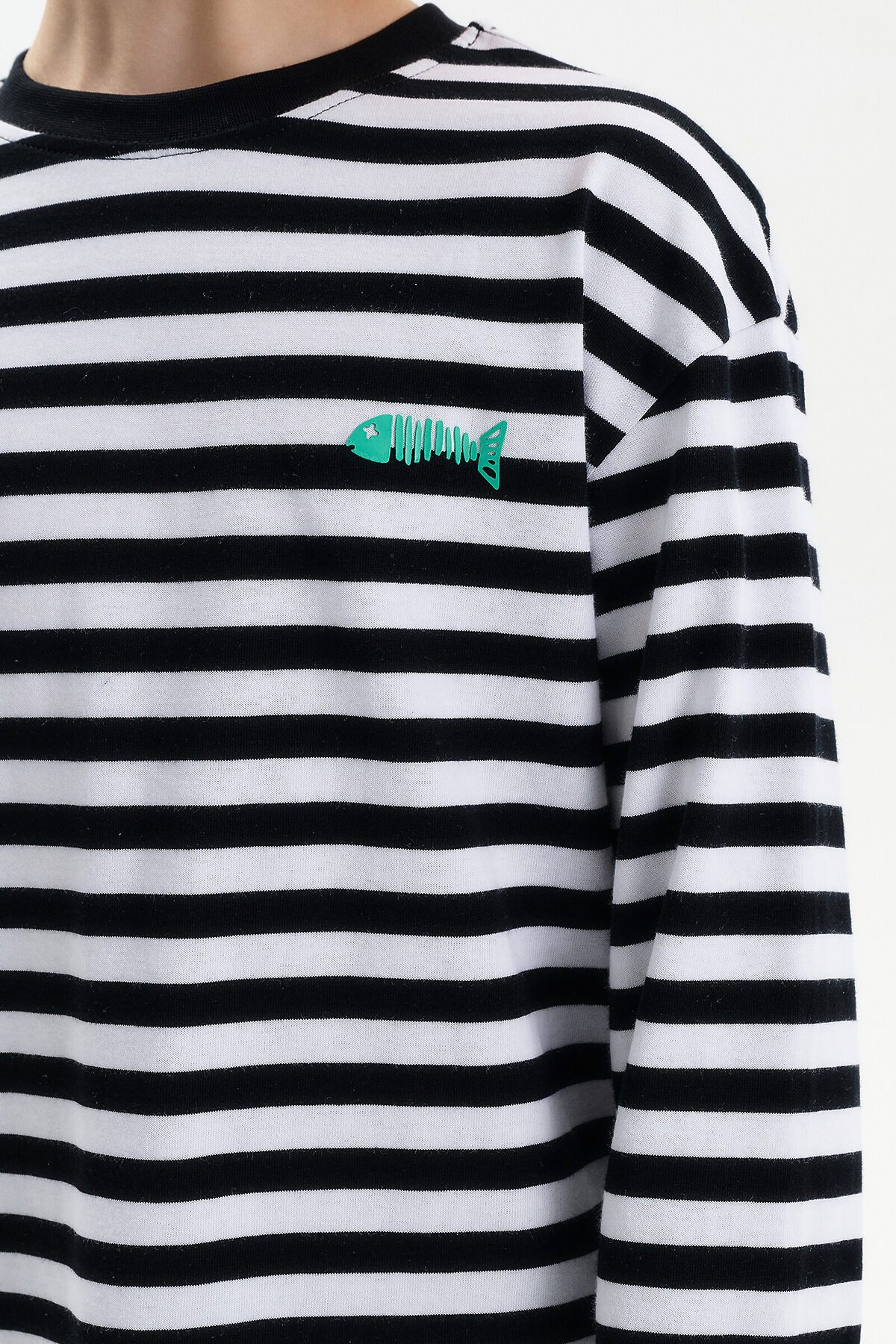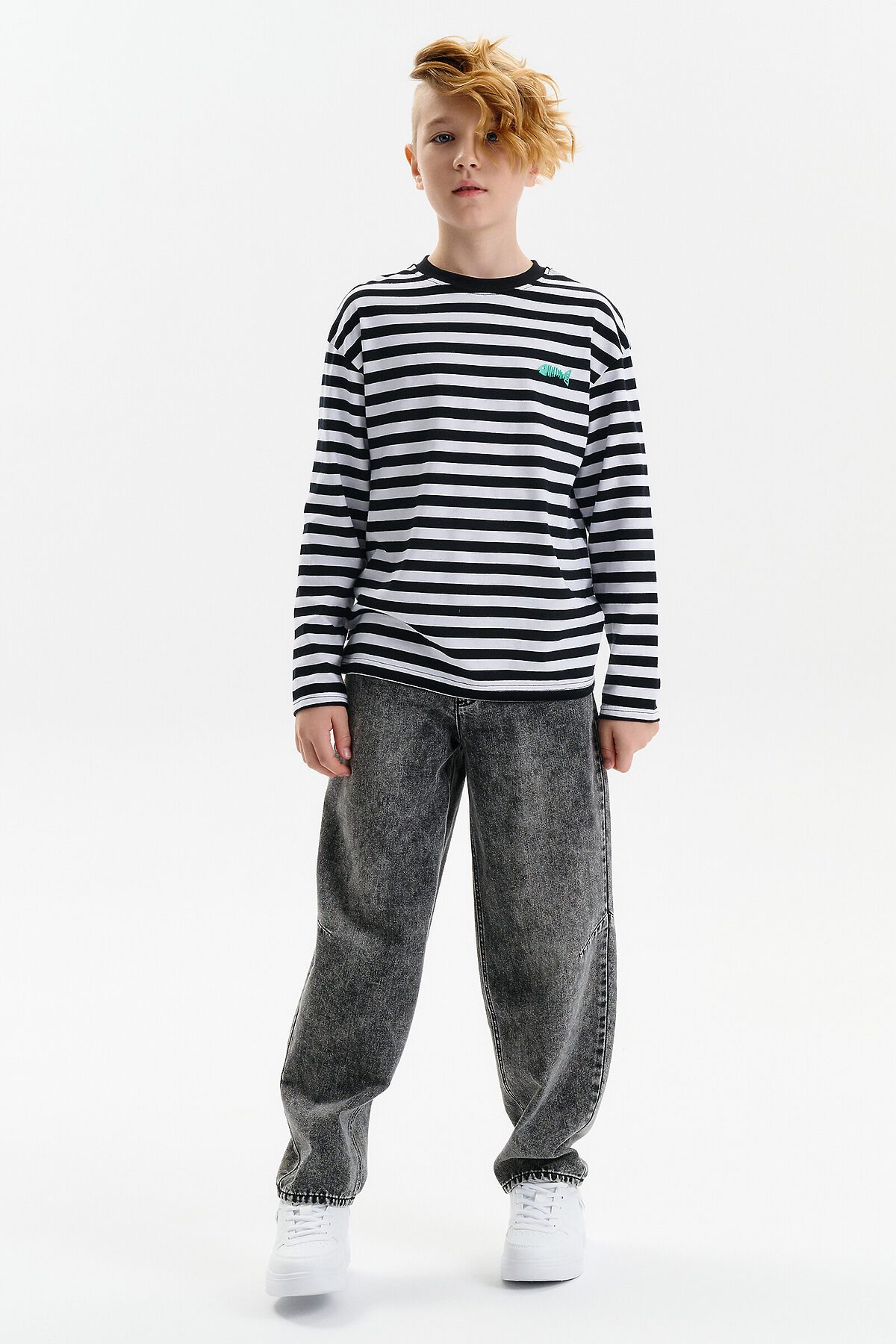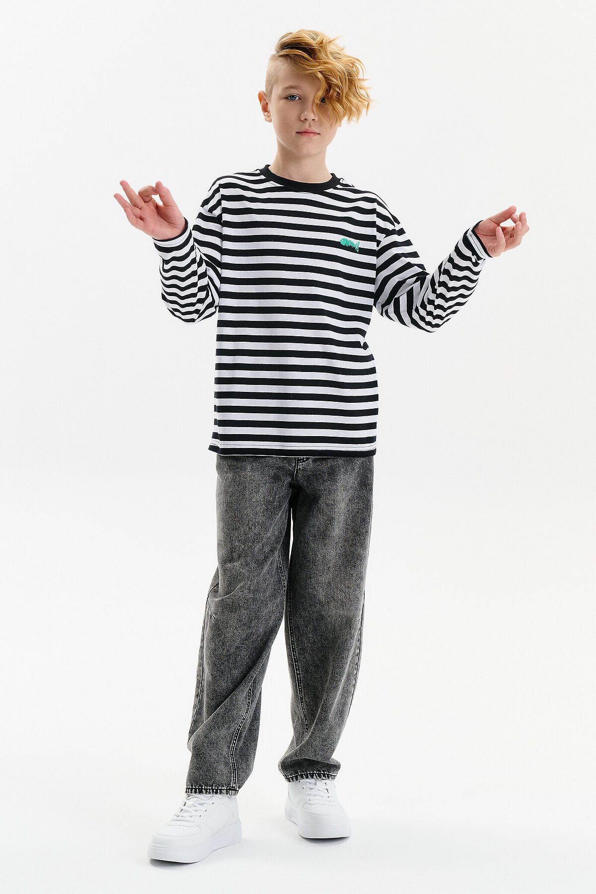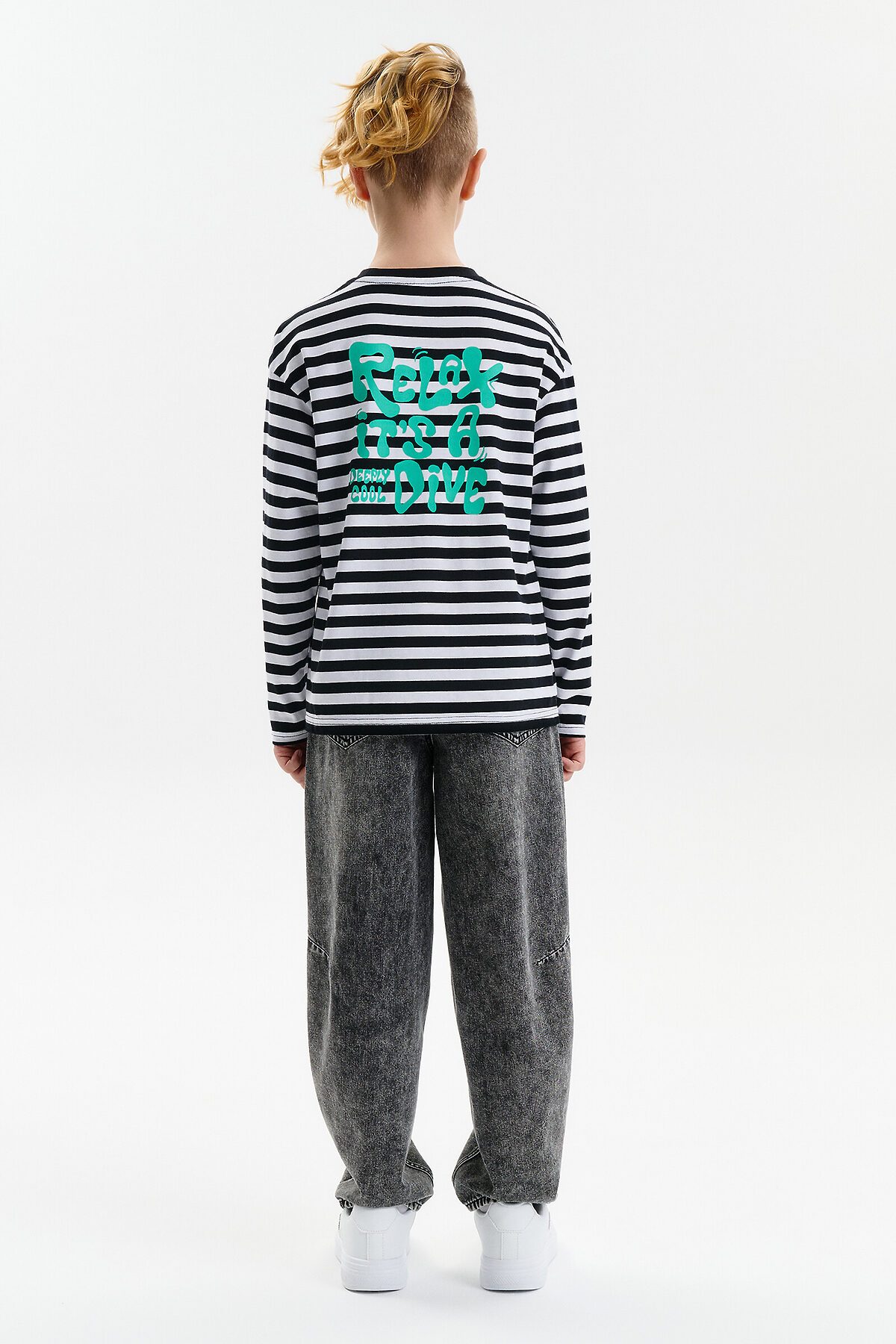 Лонгслив для мальчика с принтом. Тельняшка свободного силуэта со спущенным плечом выполнена в морском стиле. Горловина обработана эластичной рибаной - голова не застрянет. Изделие украшено ярким принтом с надписью. Перевод надписи: расслабьтесь, это очень крутое погружение.