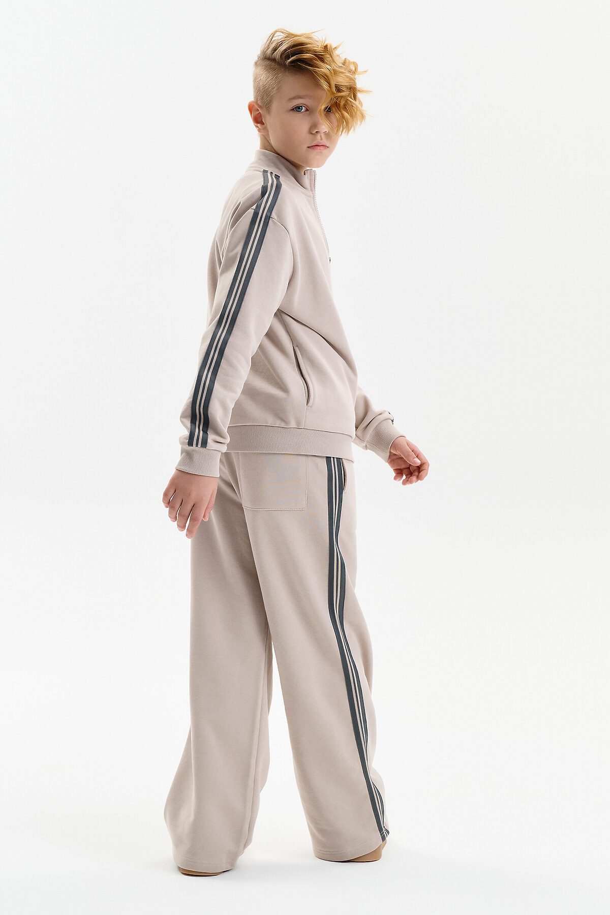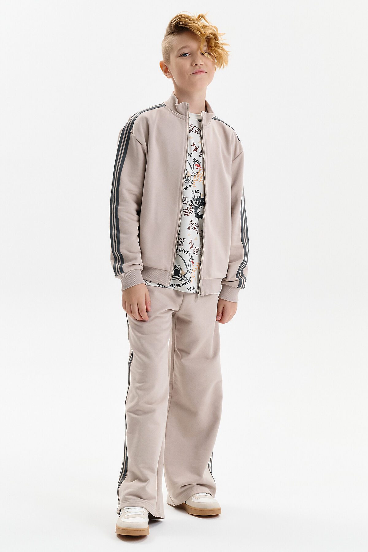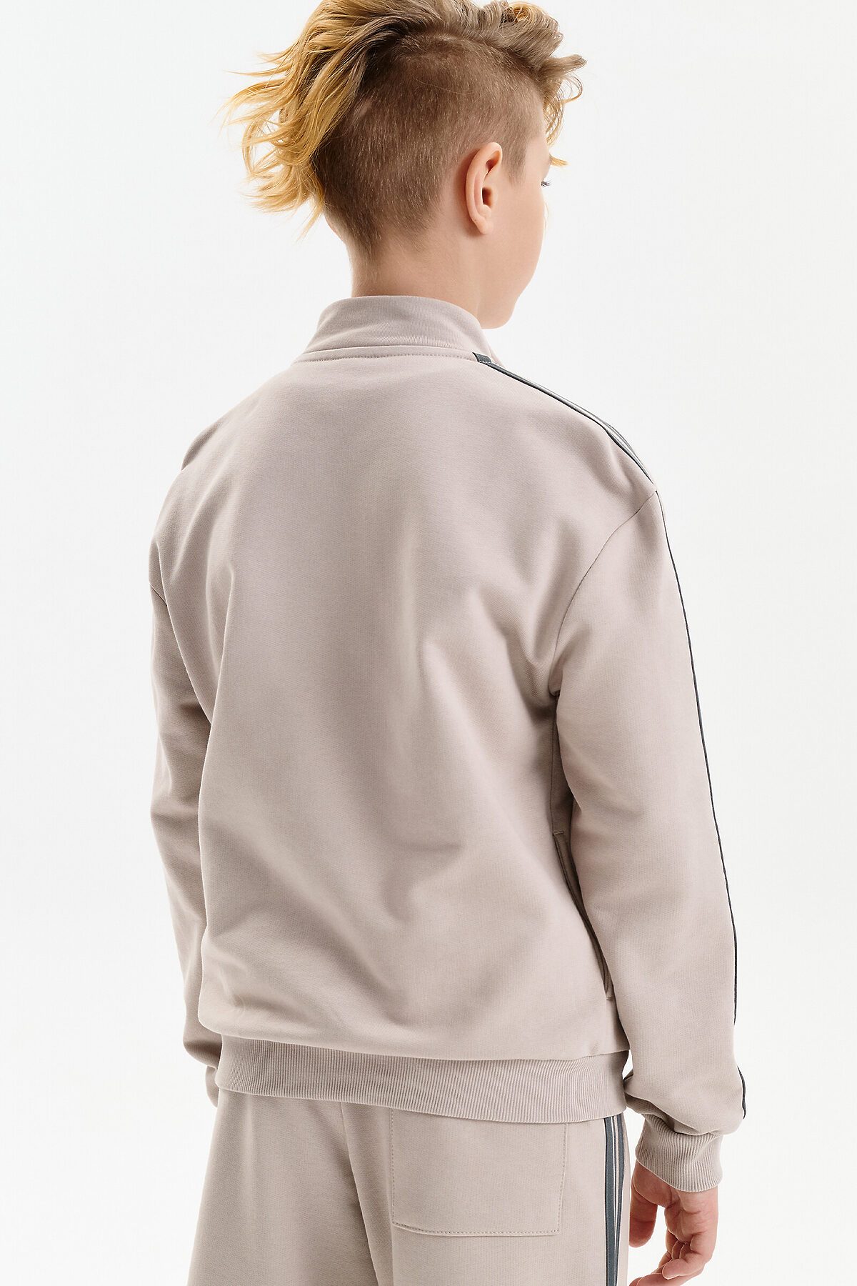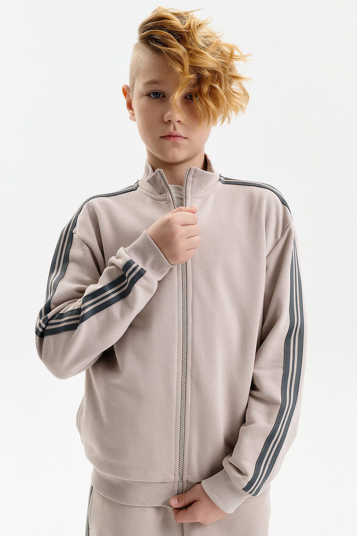 Толстовка для мальчика выполнена из плотного футера плотностью 335 г/м². Модель прямого силуэта со средним объёмом обеспечивает комфортную посадку и свободу движений. Удобная застёжка на молнии делает толстовку практичной для повседневной носки. Широкая линия плеч подчёркивает современный характер модели. Манжеты рукавов и низ изделия обработаны эластичной рибаной, благодаря чему толстовка хорошо держит форму. Вдоль рукавов расположены декоративные лампасы, придающие образу динамичный и стильный акцент.