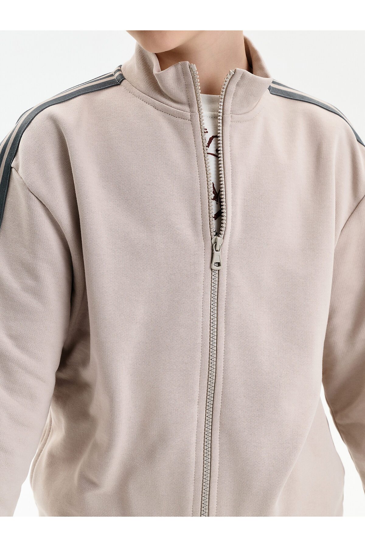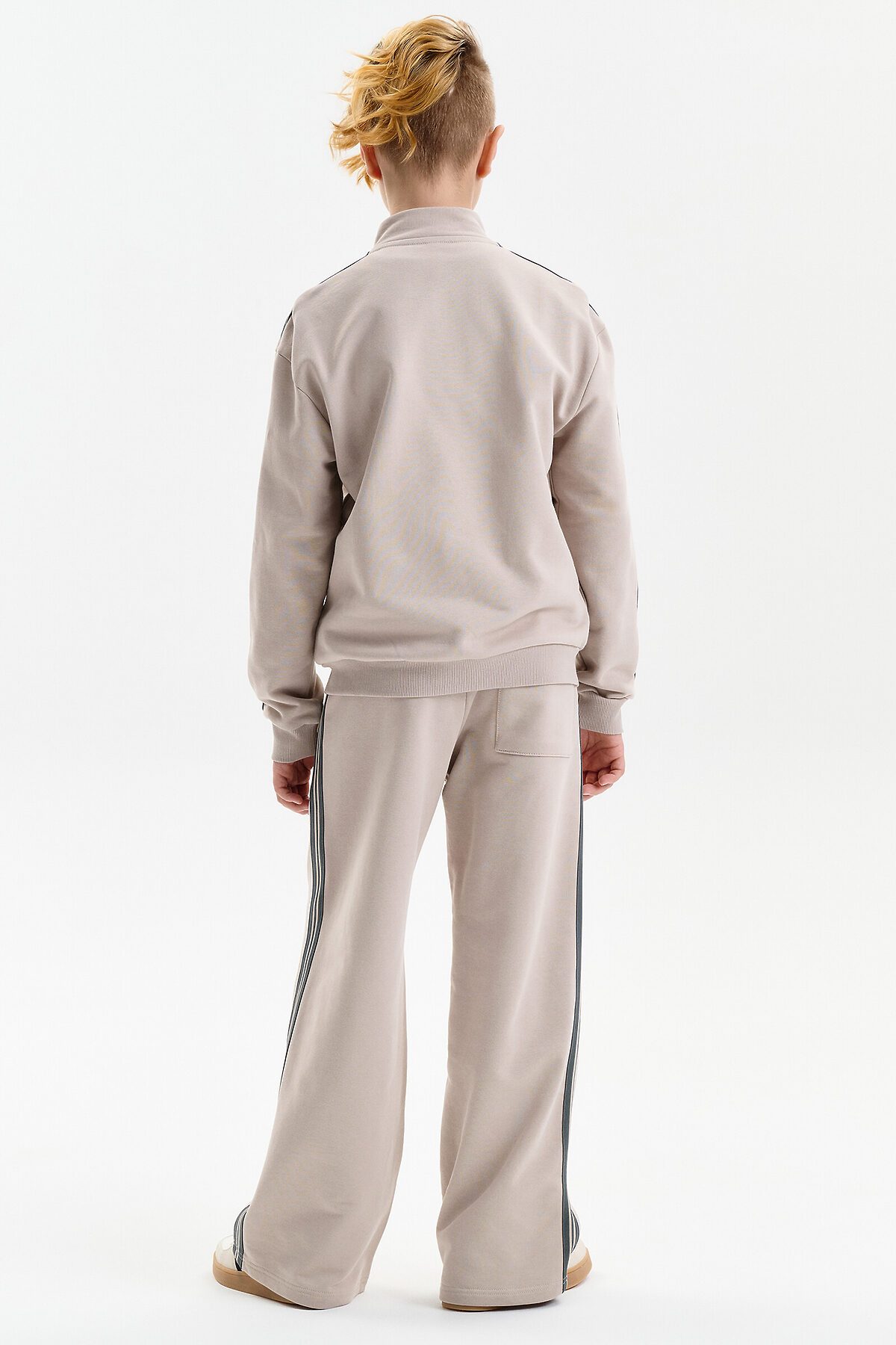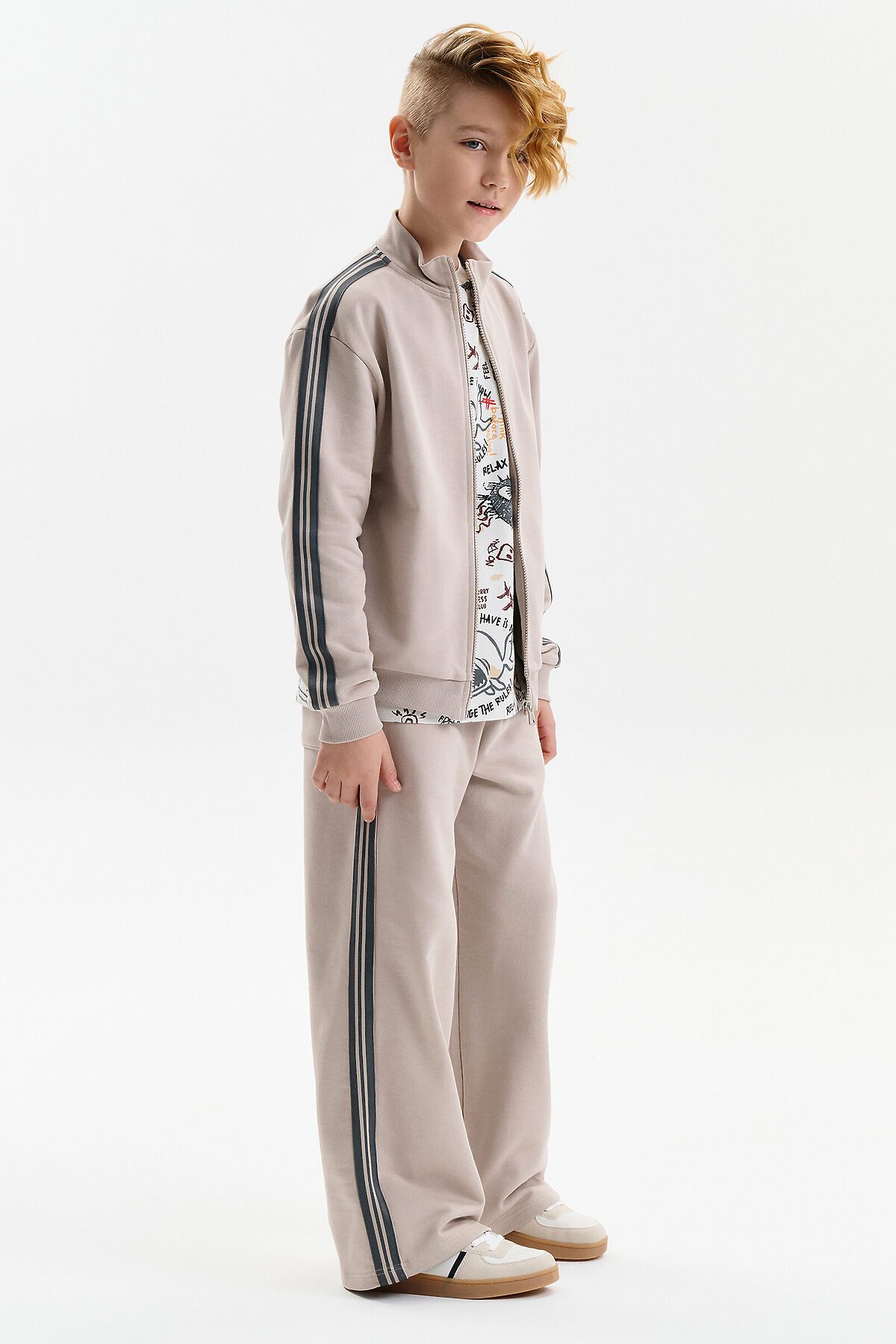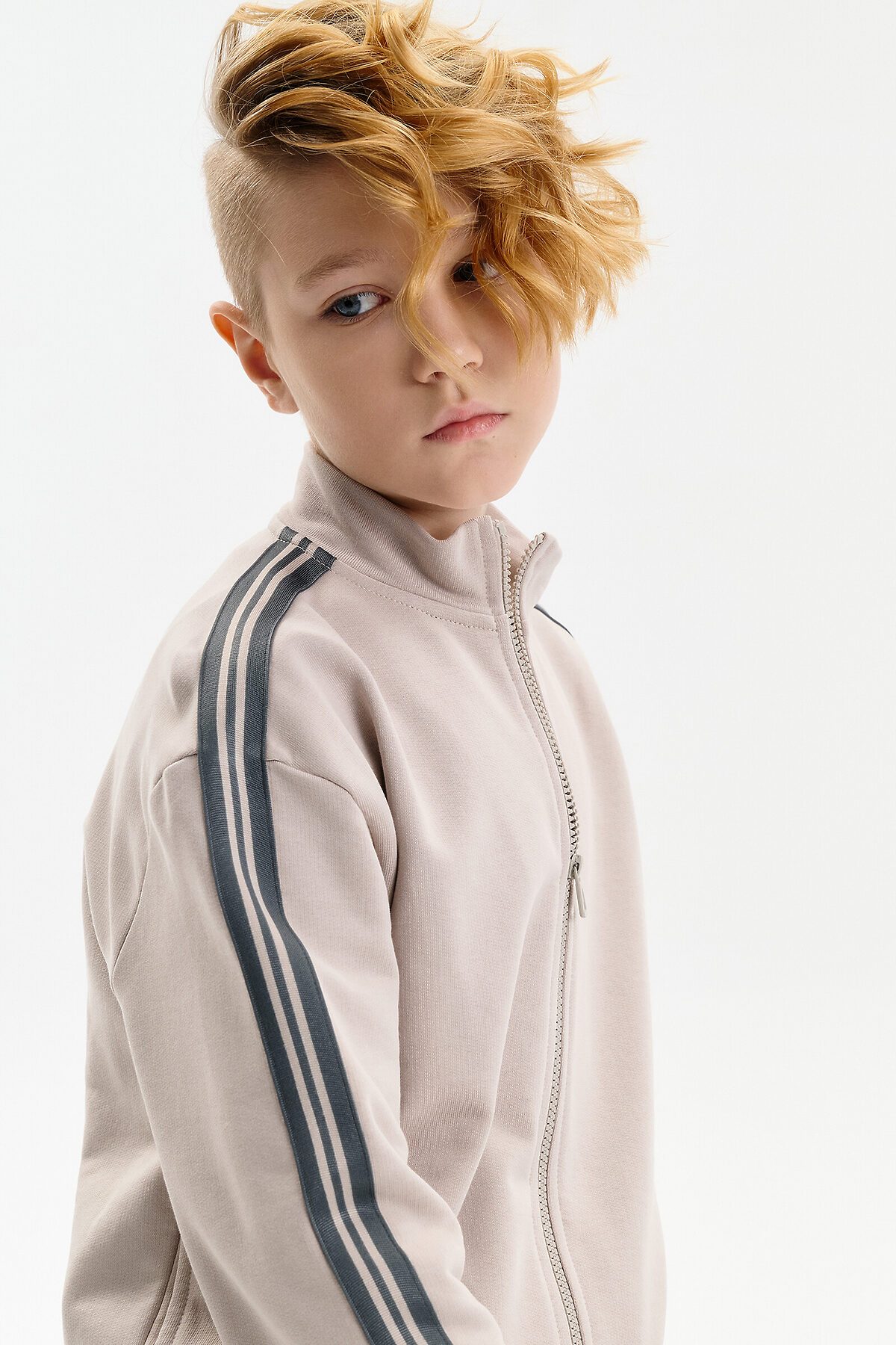 Толстовка для мальчика выполнена из плотного футера плотностью 335 г/м². Модель прямого силуэта со средним объёмом обеспечивает комфортную посадку и свободу движений. Удобная застёжка на молнии делает толстовку практичной для повседневной носки. Широкая линия плеч подчёркивает современный характер модели. Манжеты рукавов и низ изделия обработаны эластичной рибаной, благодаря чему толстовка хорошо держит форму. Вдоль рукавов расположены декоративные лампасы, придающие образу динамичный и стильный акцент.