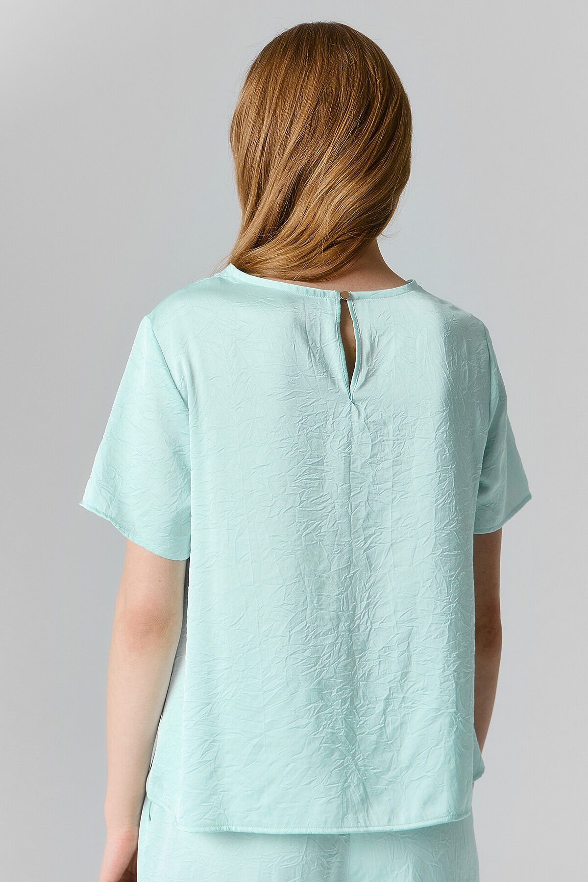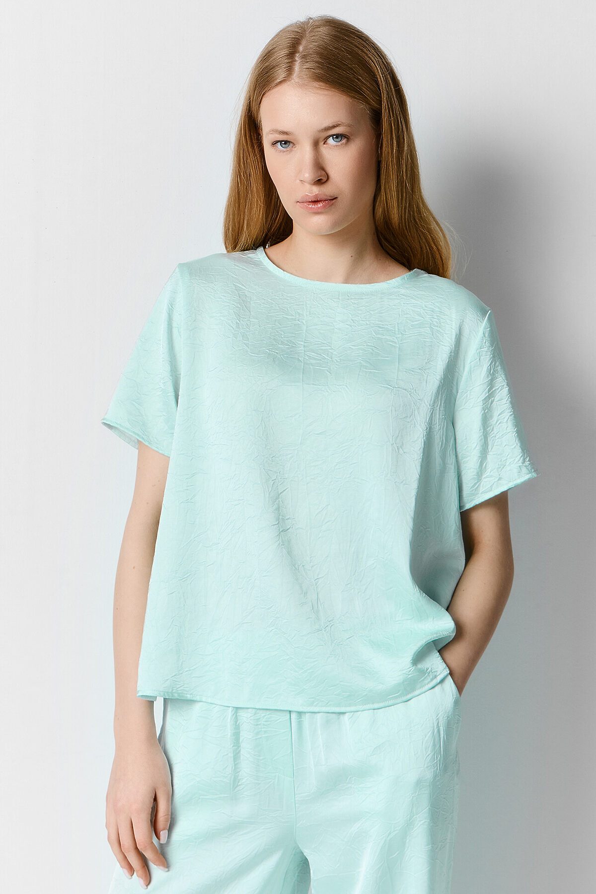 Женская блузка прямого силуэта станет стильным дополнением вашего гардероба. Круглая горловина придает ей классический и элегантный вид. Застежка на пуговицу на спинке добавляет удобство и изысканность. Короткие рукава делают эту блузку идеальной для теплой погоды. Изготовленная из смесовой вискозы, блузка обладает рядом преимуществ. Материал сочетает в себе мягкость и легкость натуральной вискозы с прочностью и износостойкостью синтетических волокон. Это позволяет изделию сохранять форму, не теряя при этом своей приятной текстуры и дышащих свойств. Такая блузка станет отличным выбором как для повседневного ношения, так и для создания элегантных образов на особые случаи.