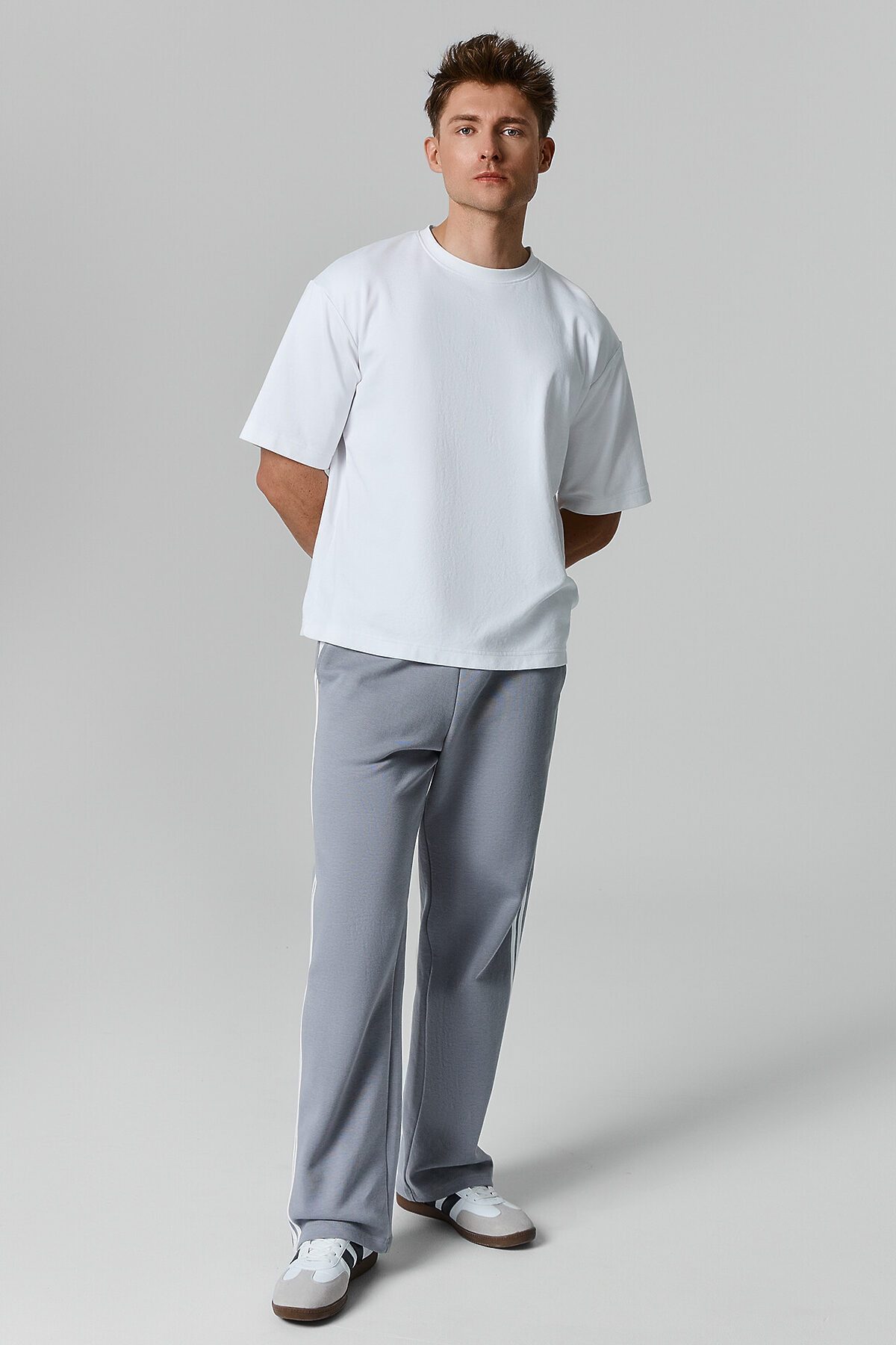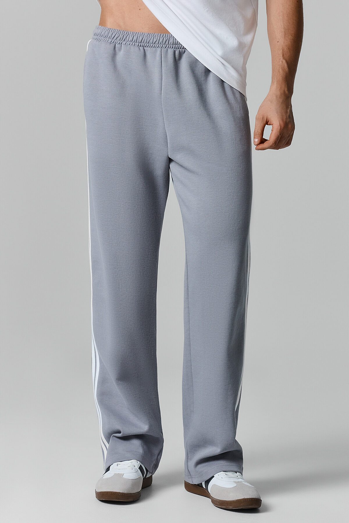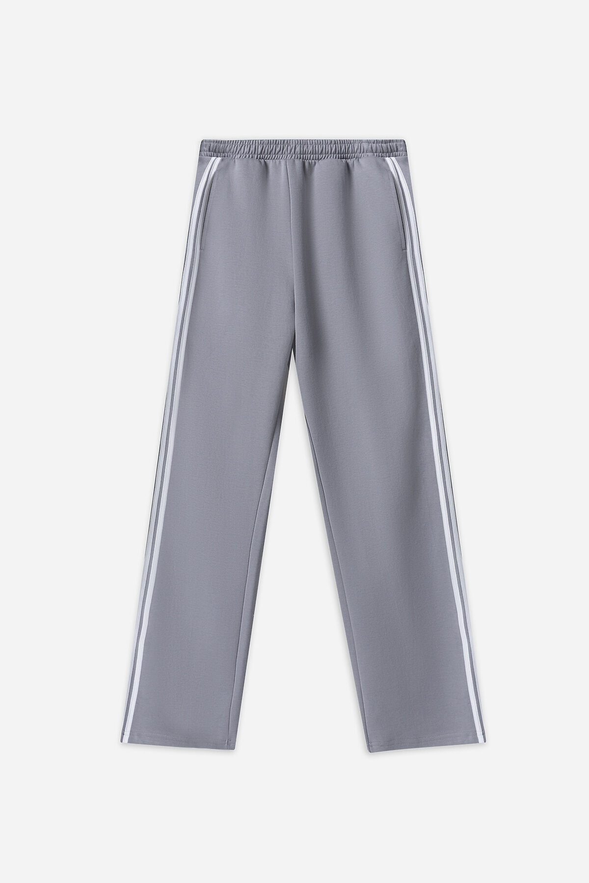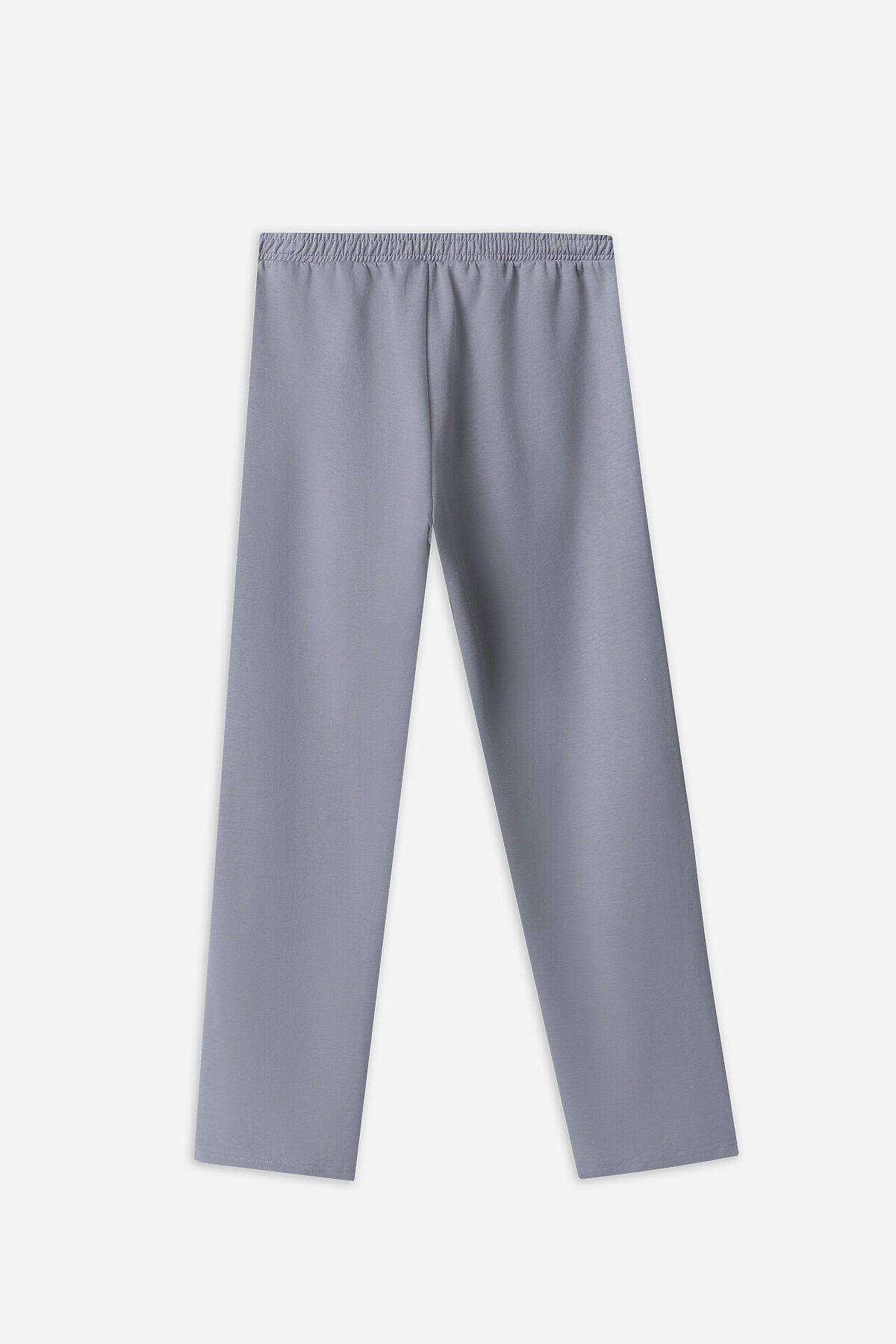 Брюки прямые. Боковые карманы в боковом шве. Пояс с эластичной тесьмой внутри. Шнур 10 PXC-1 с застроченными концами выводится через петли на внутренней части пояса.В области бокового шва лампасы.Нижние срезы брюк обработаны швом вподгибку на 2х игольной плоскошовной машине.