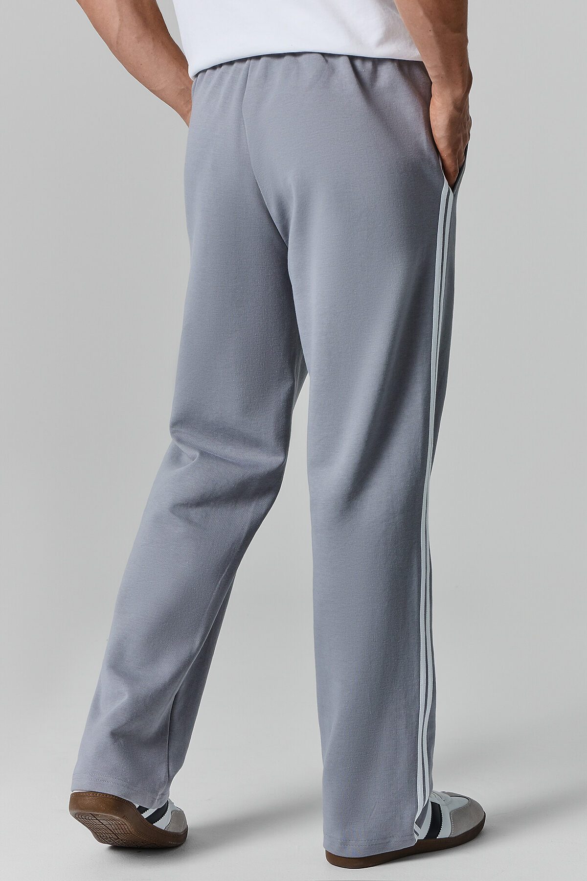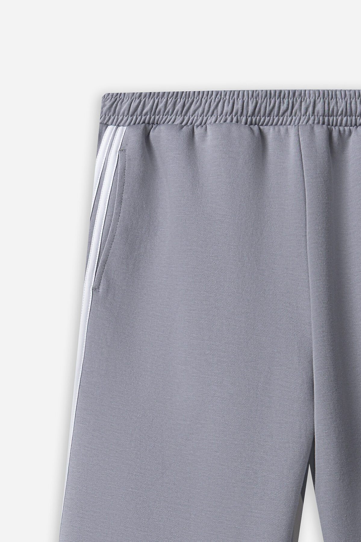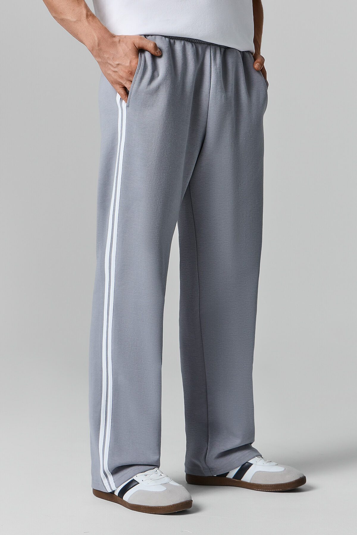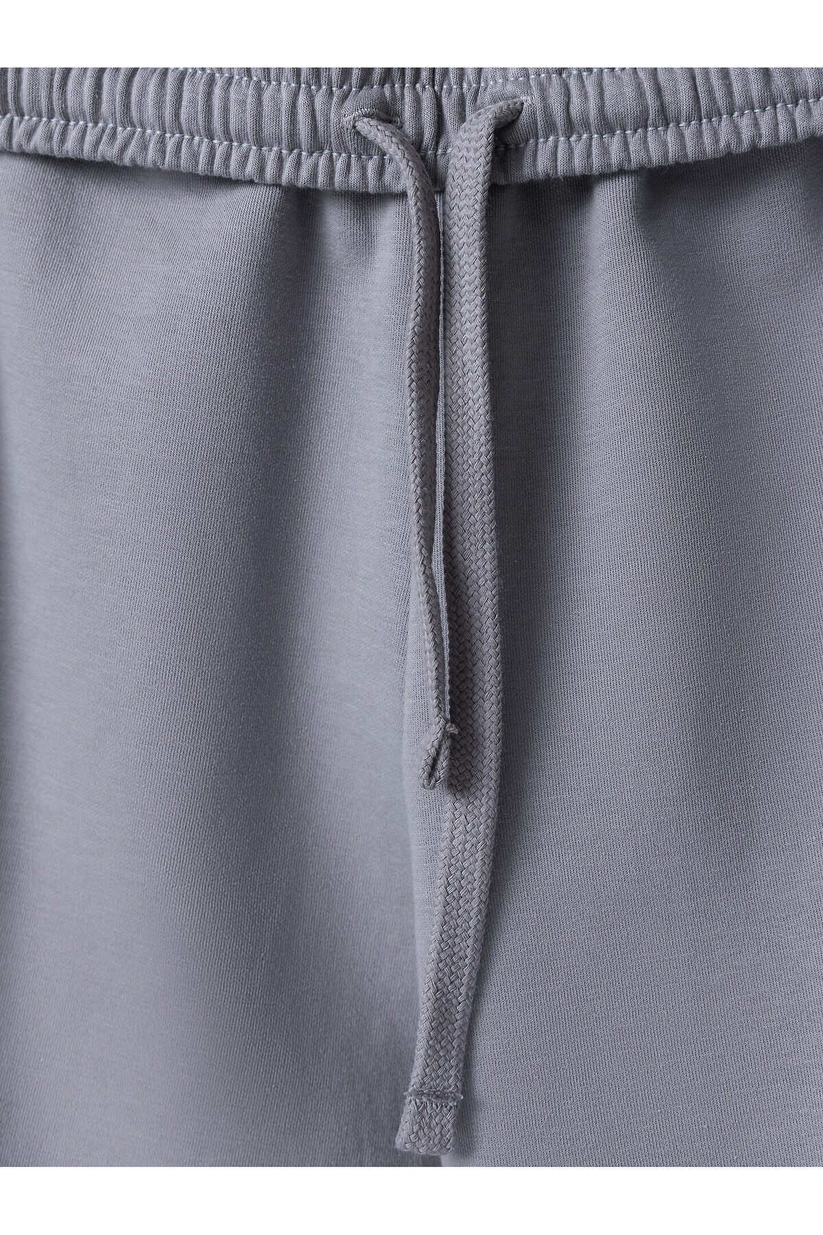 Брюки прямые. Боковые карманы в боковом шве. Пояс с эластичной тесьмой внутри. Шнур 10 PXC-1 с застроченными концами выводится через петли на внутренней части пояса.В области бокового шва лампасы.Нижние срезы брюк обработаны швом вподгибку на 2х игольной плоскошовной машине.