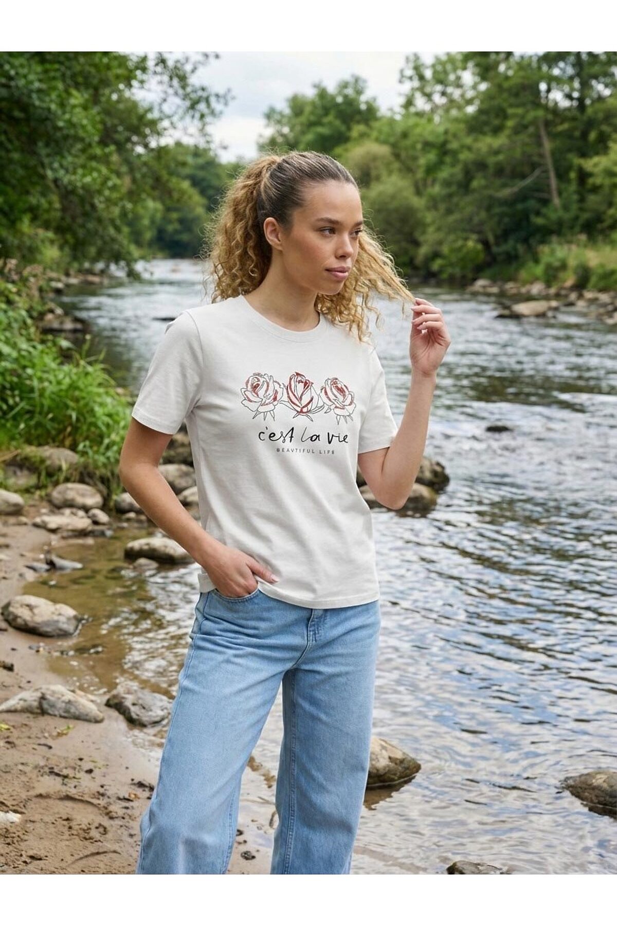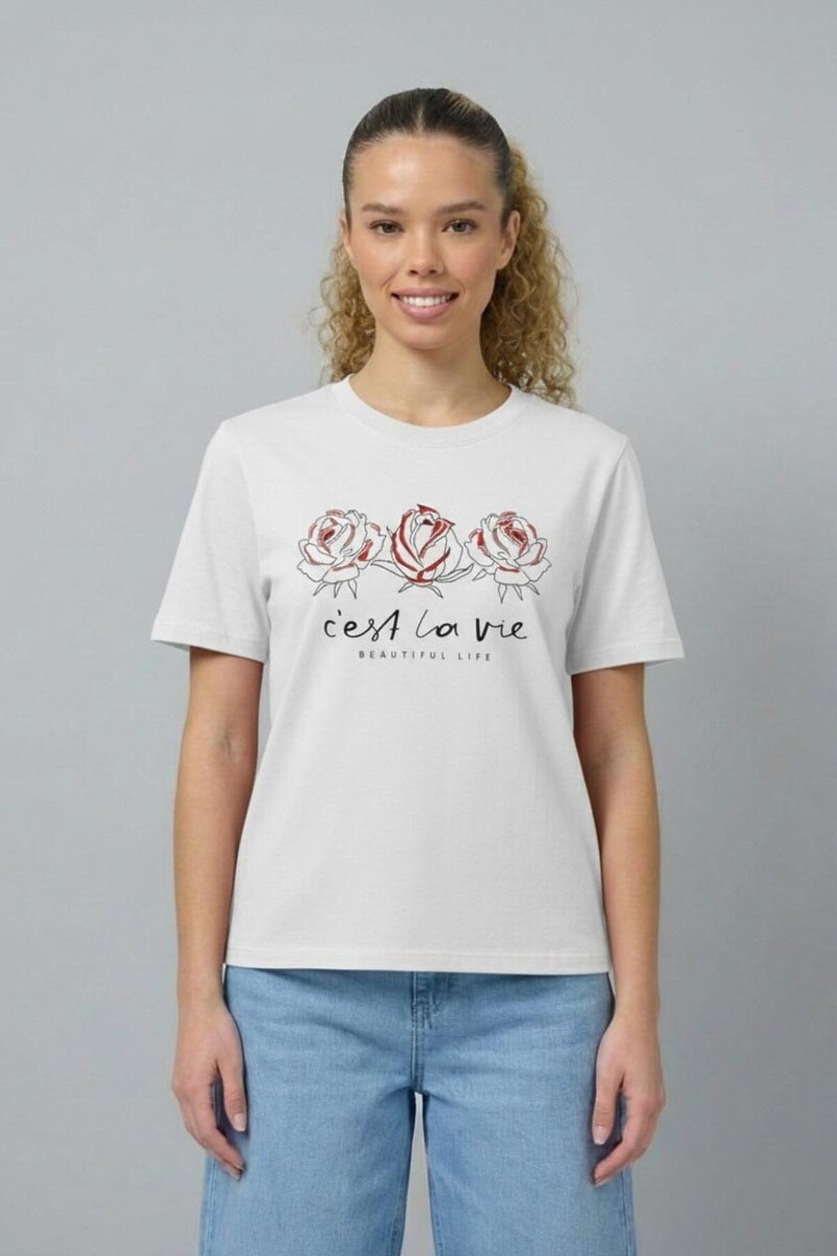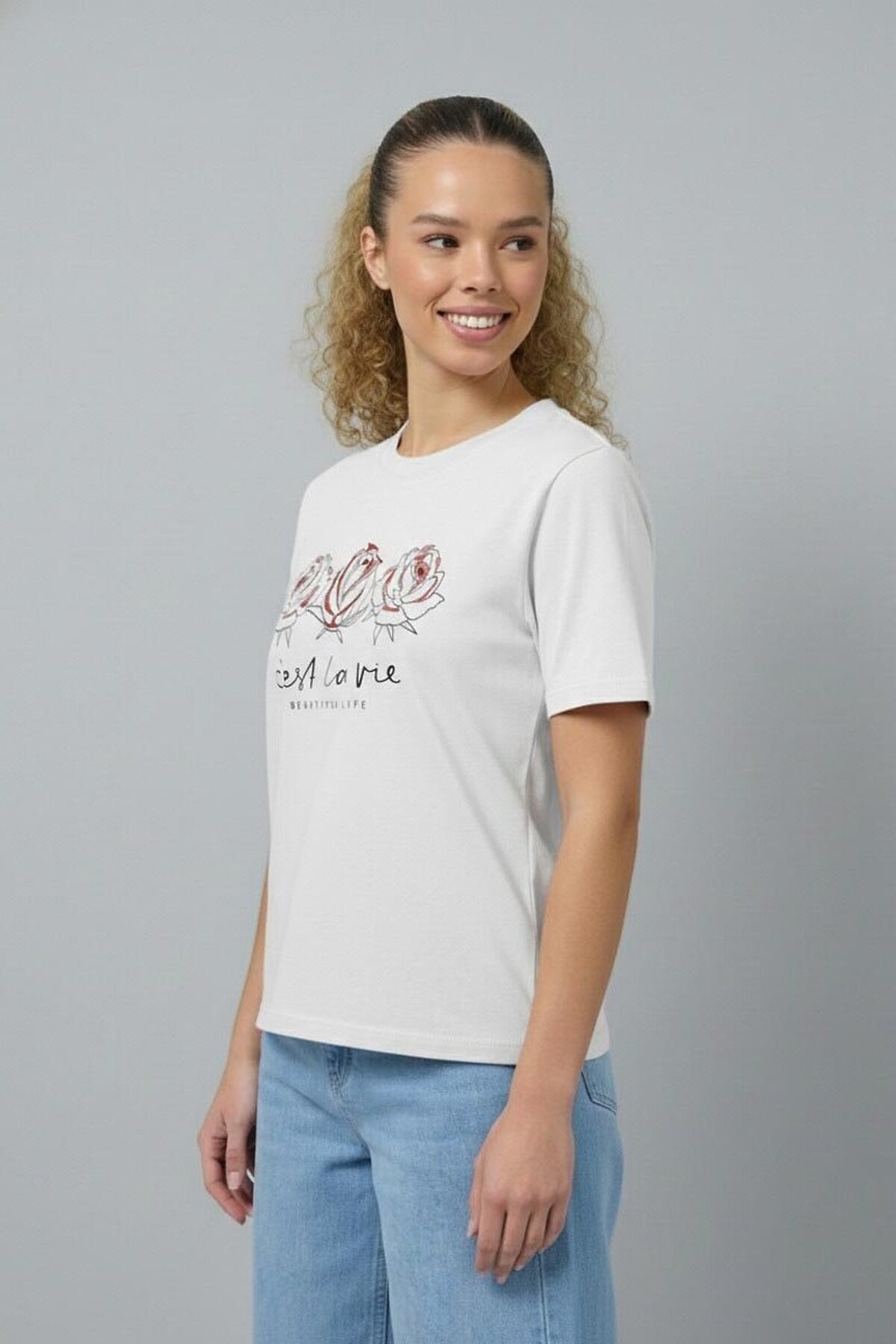 Женская футболка F5, Comfort fit (свободный силуэт), круглый вырез горловины, короткий рукав. Выполнена из классического трикотажного полотна.