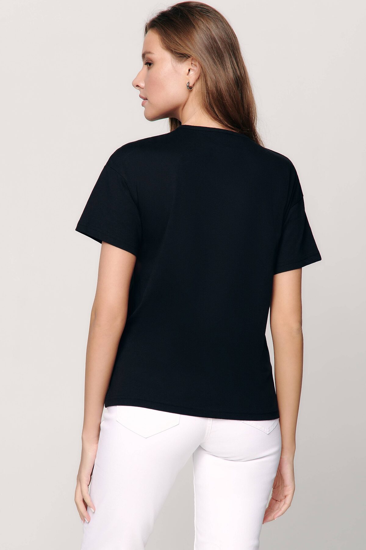 Черная футболка прямого силуэта LD 1234 из мягкого хлопка сочетает в себе минимализм и оригинальные тенденции уличной моды. · прямой силуэт· круглый вырез горловины· спущенная линия плеча· короткий рукав с отложным цельнокроеным манжетом· рисунок «Kiss»· мягкий 100% хлопок· устойчивый цвет и сохранение формы при соблюдении рекомендаций по уходу· прекрасный вариант на каждый день.