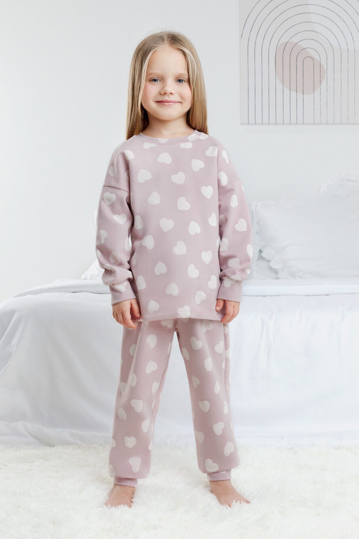 Трикотажная пижама с начёсом из натурального хлопка. Джемпер с длинными спущенными рукавами и брюки с эластичной резинкой в поясе. Мягкие манжеты на рукавах и по низу брюк. Оригинальная набивка выполнена из стойких гипоаллергенных текстильных гипоаллергенных красителей. Изделие сохраняет цвет и форму после многократных стирок. Все трикотажные полотна производятся в соответсвии с нормами швейцарского сертификата ЭкоТекс.