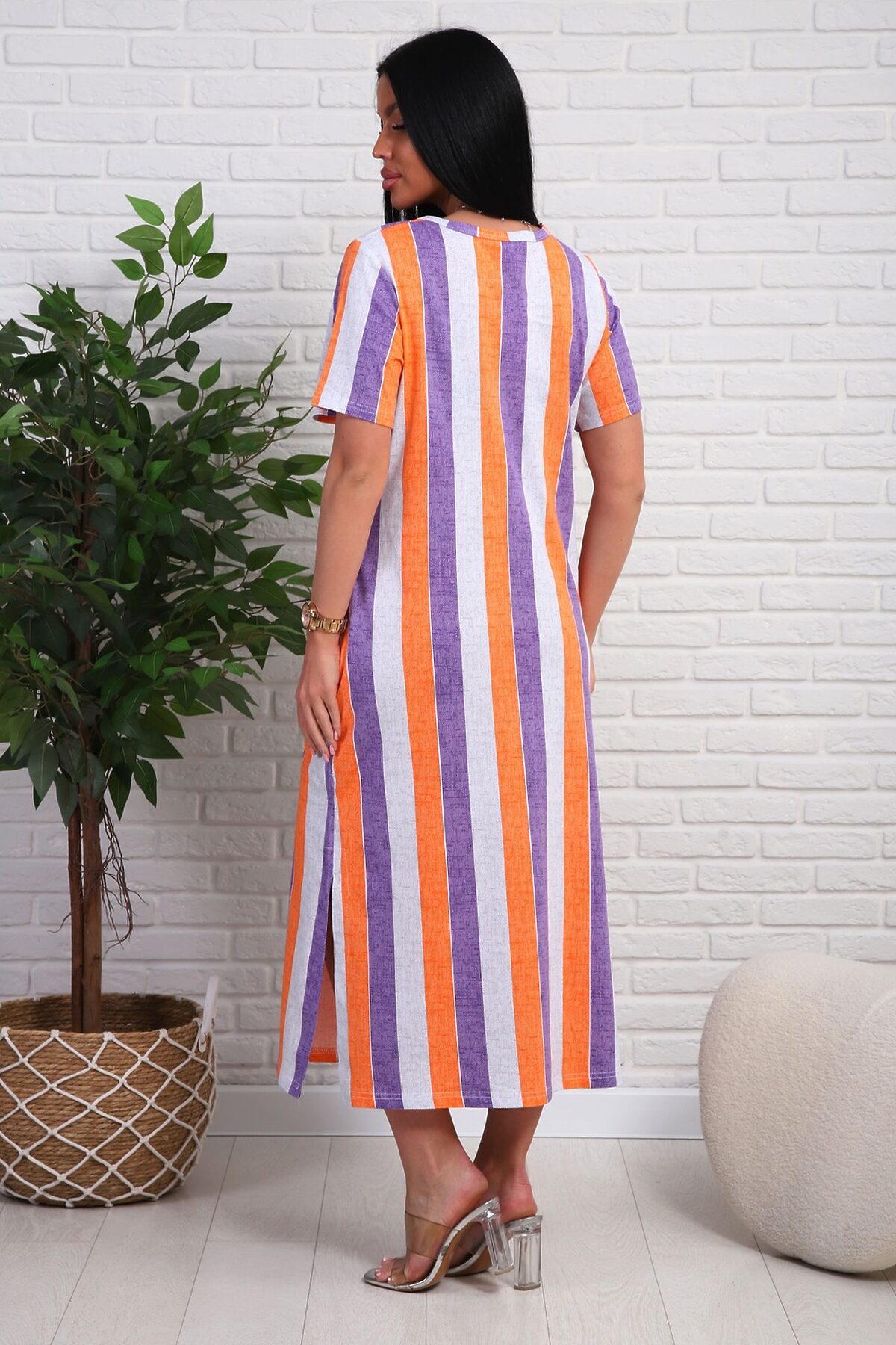 Платье из натурального набивного трикотажа. Силуэт прямой. Длина миди. Рукав короткий. Горловина круглая. На полочке фигурные подрезы. Карманы и разрезы в боковых швах.