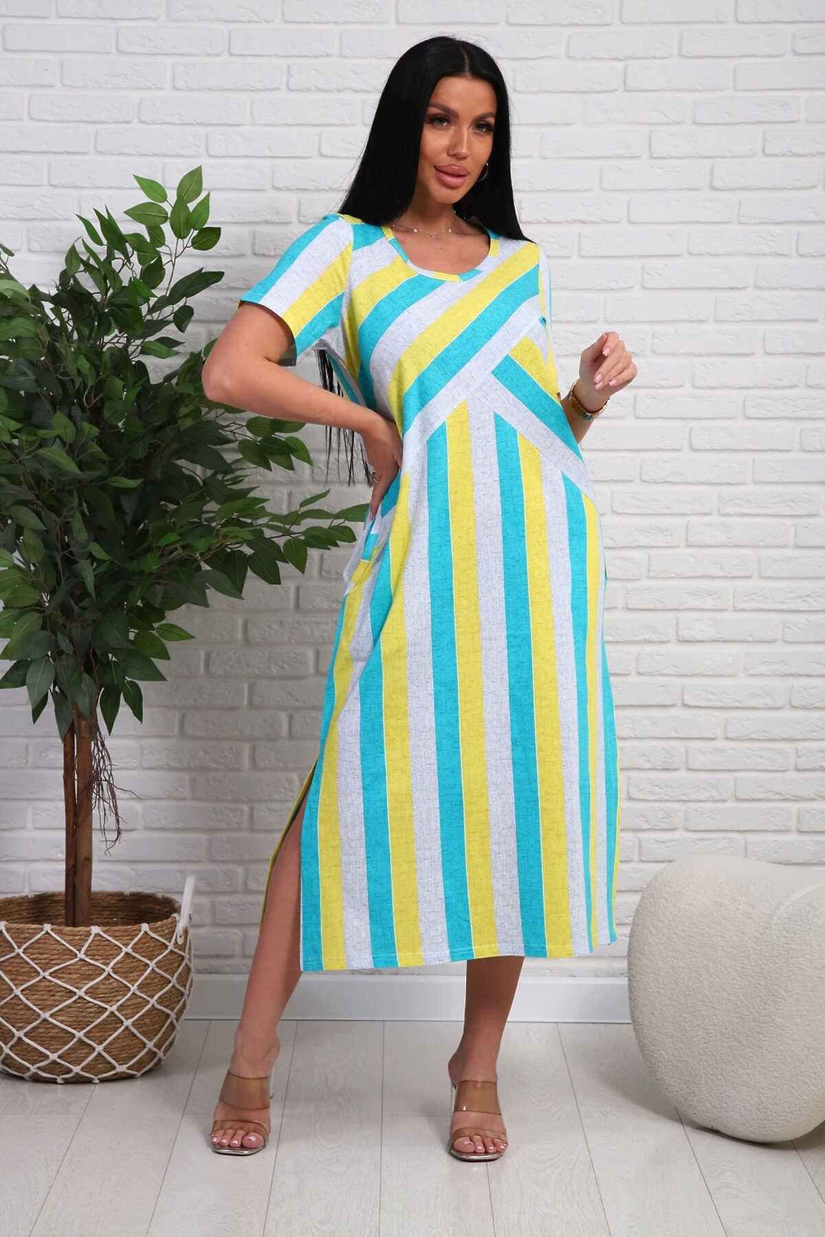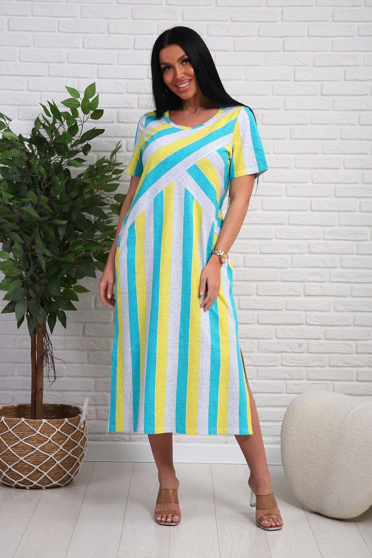 Платье из натурального набивного трикотажа. Силуэт прямой. Длина миди. Рукав короткий. Горловина круглая. На полочке фигурные подрезы. Карманы и разрезы в боковых швах.