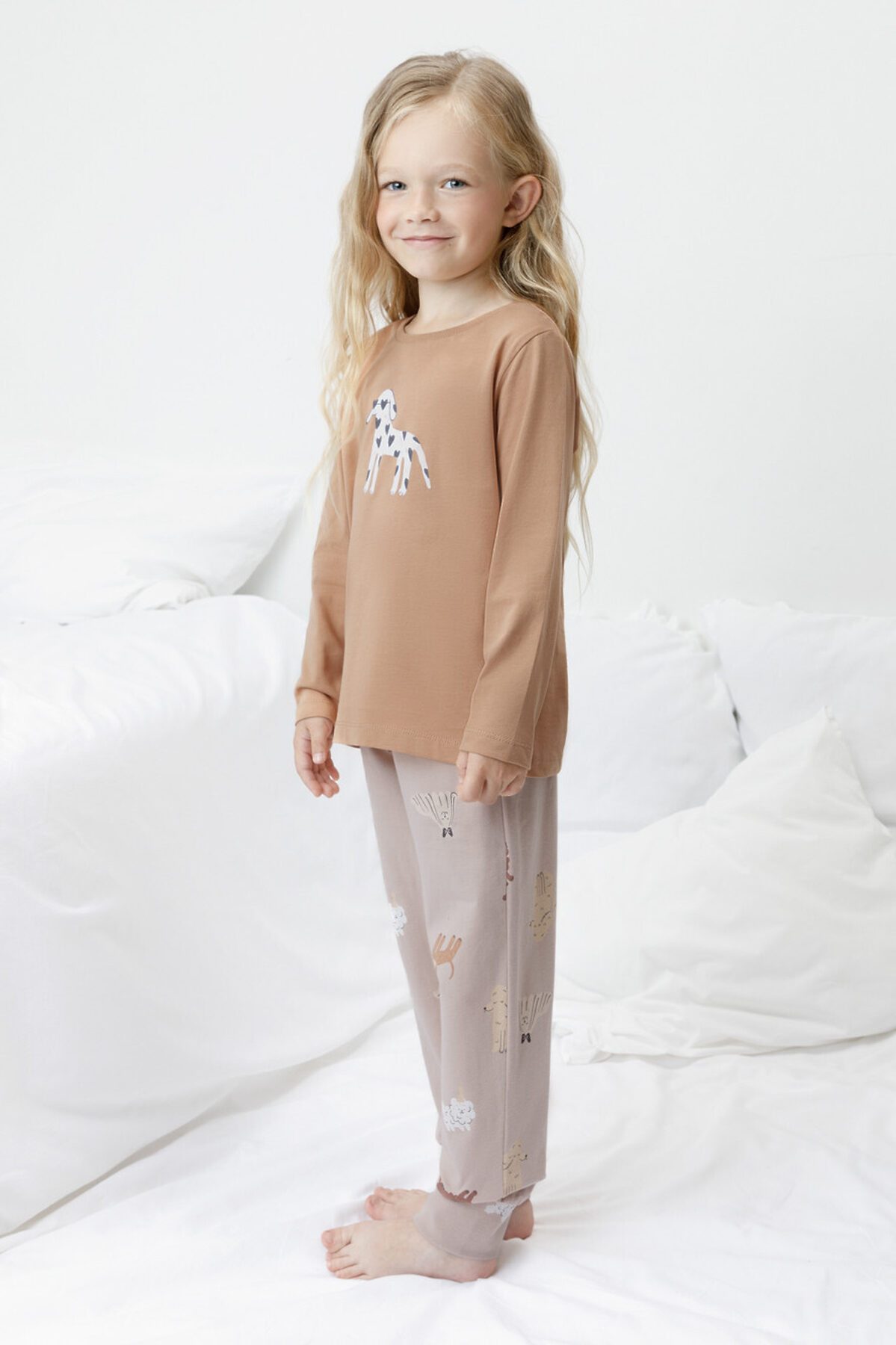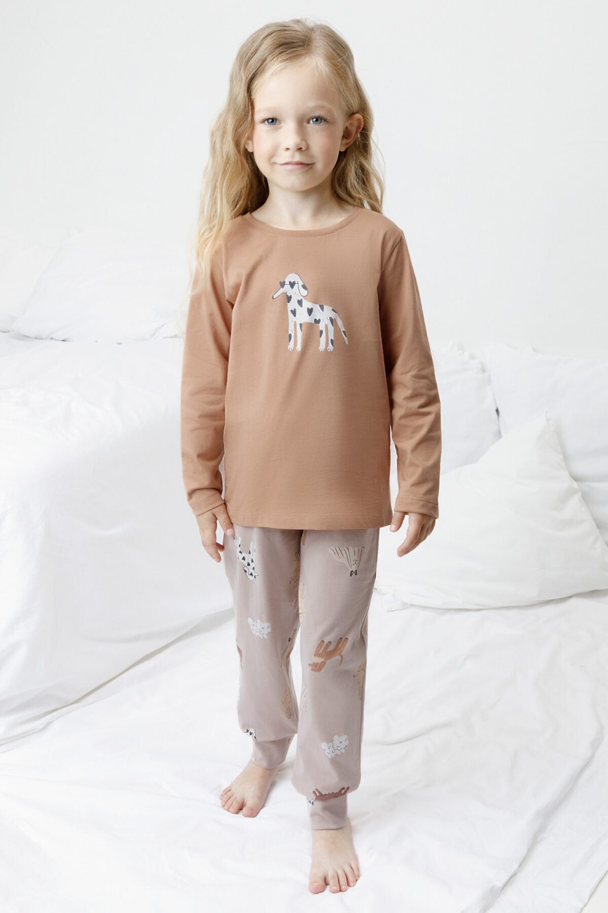 Трикотажная пижама из натурального хлопка. Джемпер с длинными втачными рукавами и брюки с эластичной резинкой в поясе. Мягкие манжеты по низу брюк. Оригинальные набивка и принт выполнены из стойких гипоаллергенных текстильных гипоаллергенных красителей. Изделие сохраняет цвет и форму после многократных стирок. Все трикотажные полотна производятся в соответсвии с нормами швейцарского сертификата ЭкоТекс.