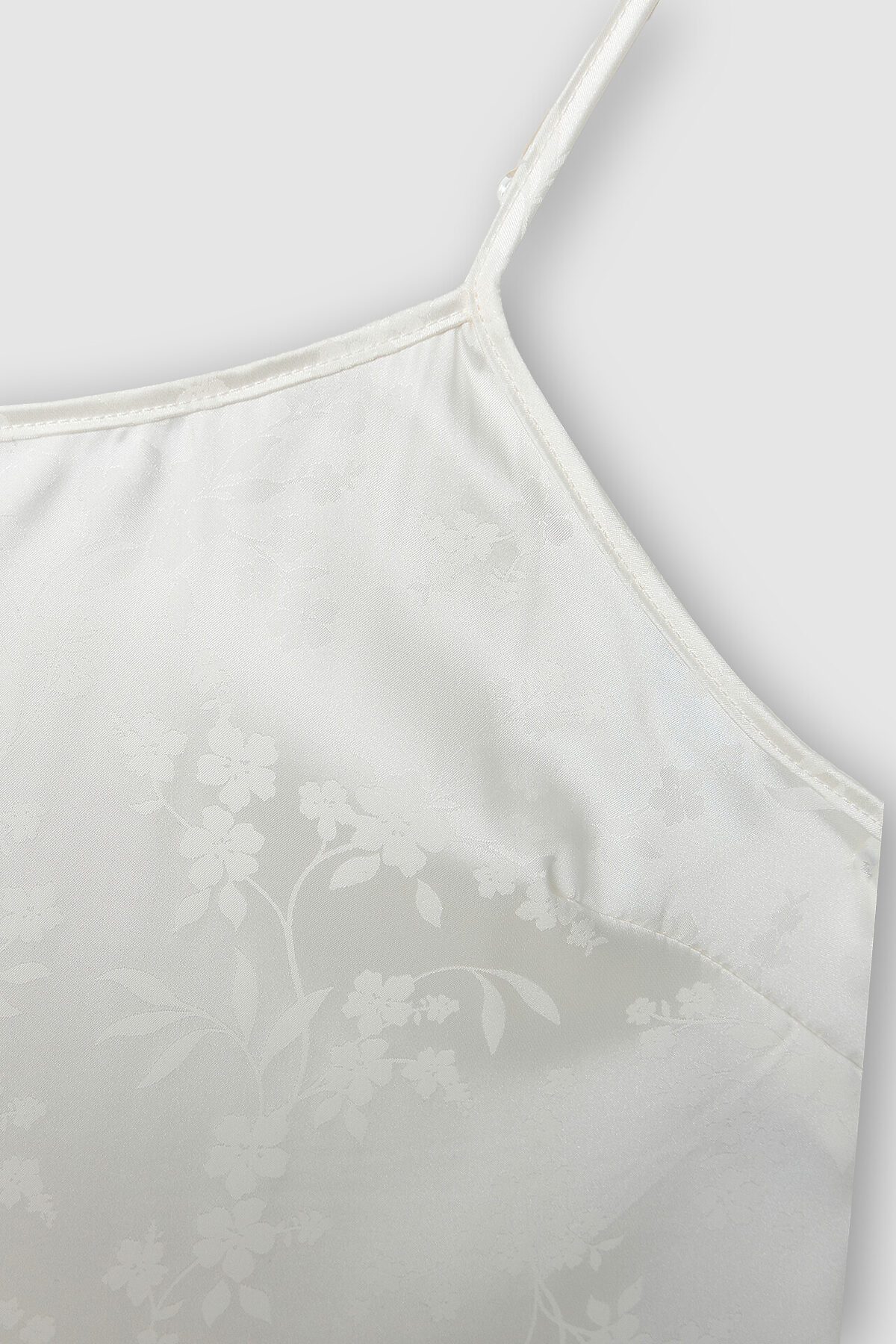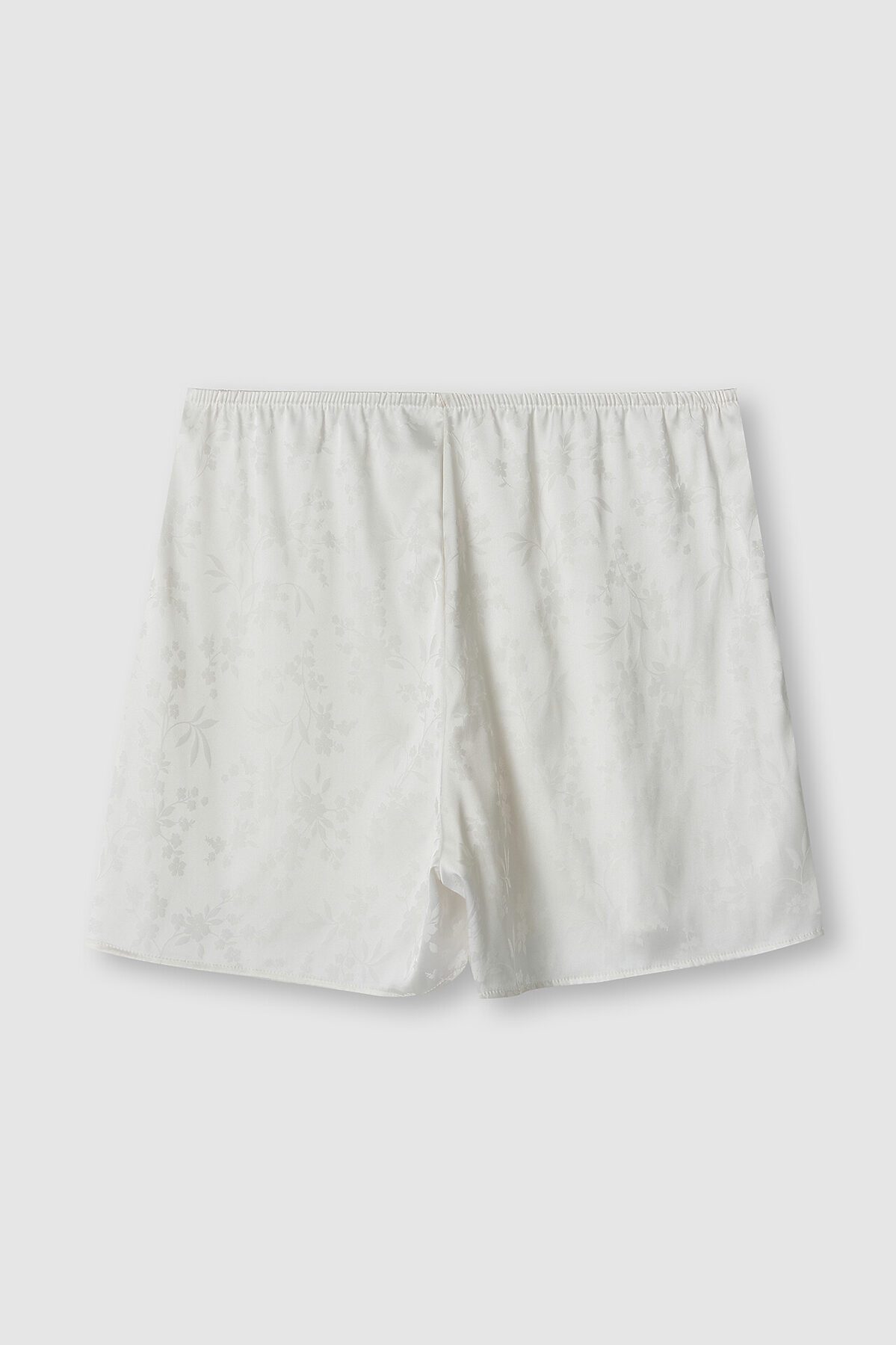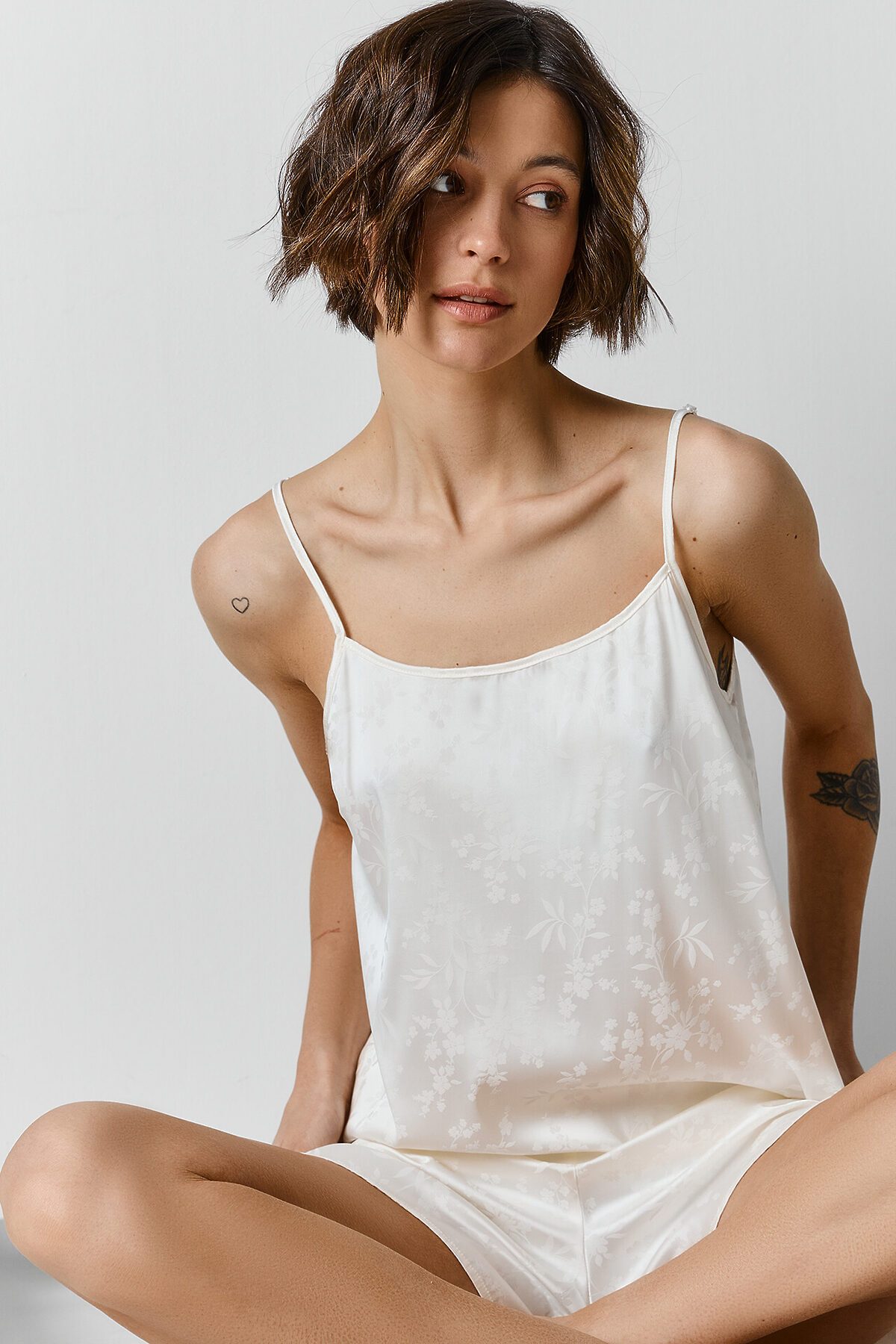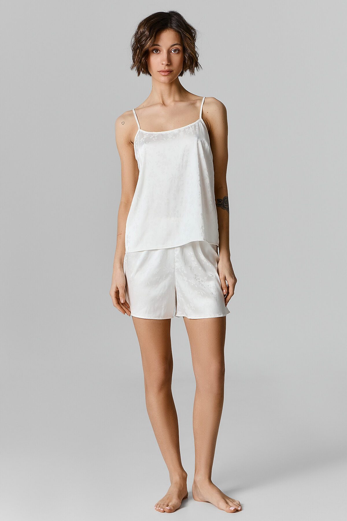 Блуза свободного силуэта. Верхний край изделия обработан бейкой. Проймы обработаны бейкой из основного полотна, образуя бретели с регулировкой. Низ изделия обработан швом вподгибку. Шорты свободного силуэта, короткие. Пояс цельнокроеный, с втачной эластичной тесьмой 10RV. Низ шорт обработан в подгибку.