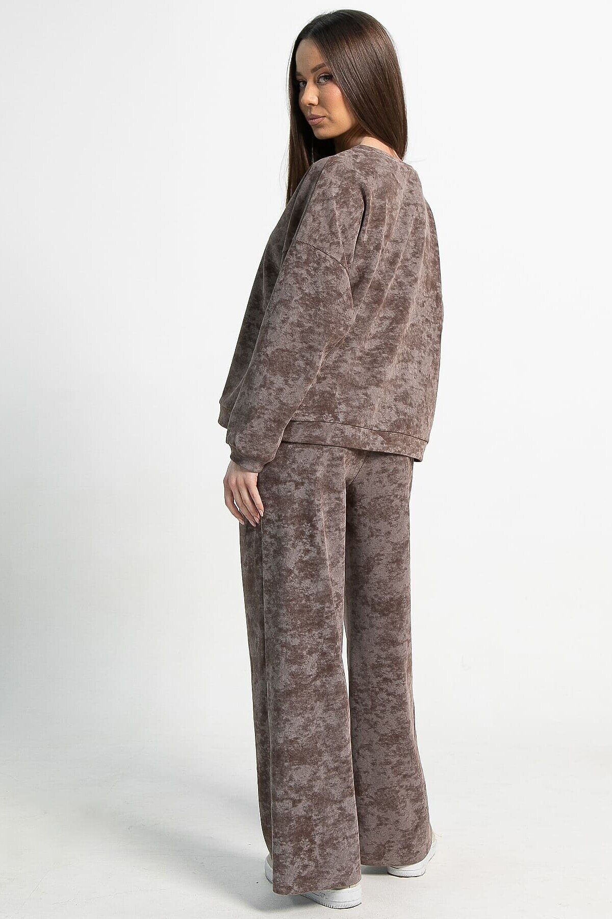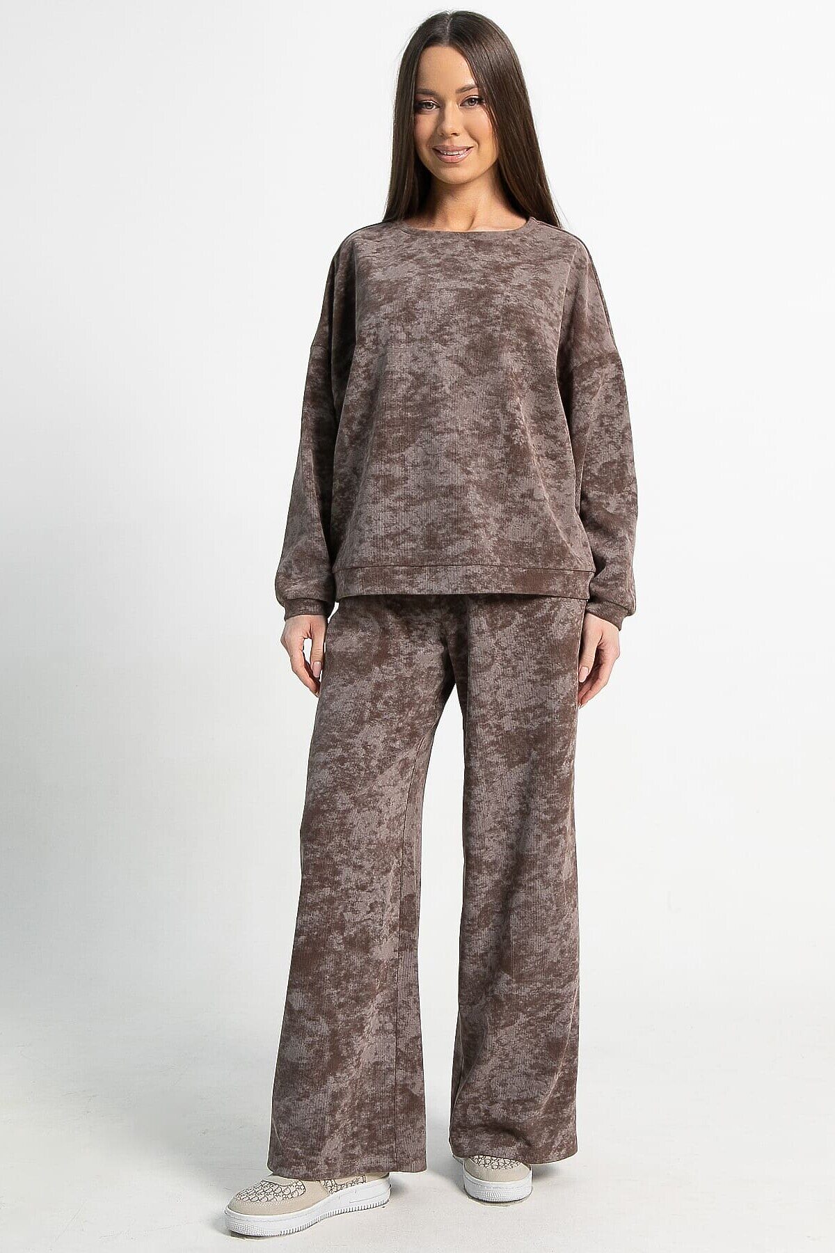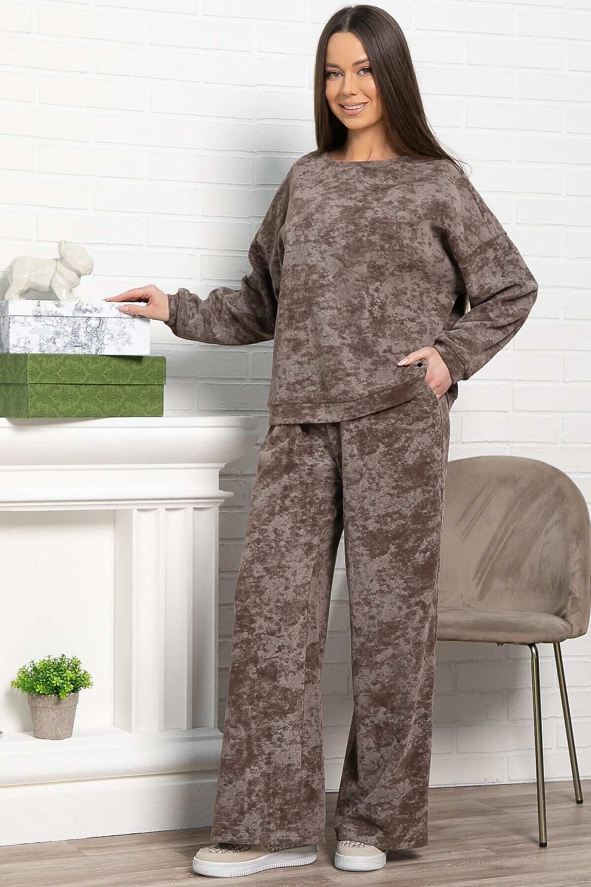 Ваш идеальный выбор для комфортных образов — костюм в кофейном цвете с принтом «варенка». Отличительная особенность этой модели — широкие брюки палаццо. Свободный крой верха и спущенный рукав создают ощущение комфорта, что особенно актуально в прохладную погоду. Брюки по талии на резинке обеспечивают дополнительный комфорт. По боковым швам расположены карманы. Этот комплект идеально подойдет тем, кто ценит свободу движений и уют без лишних деталей.