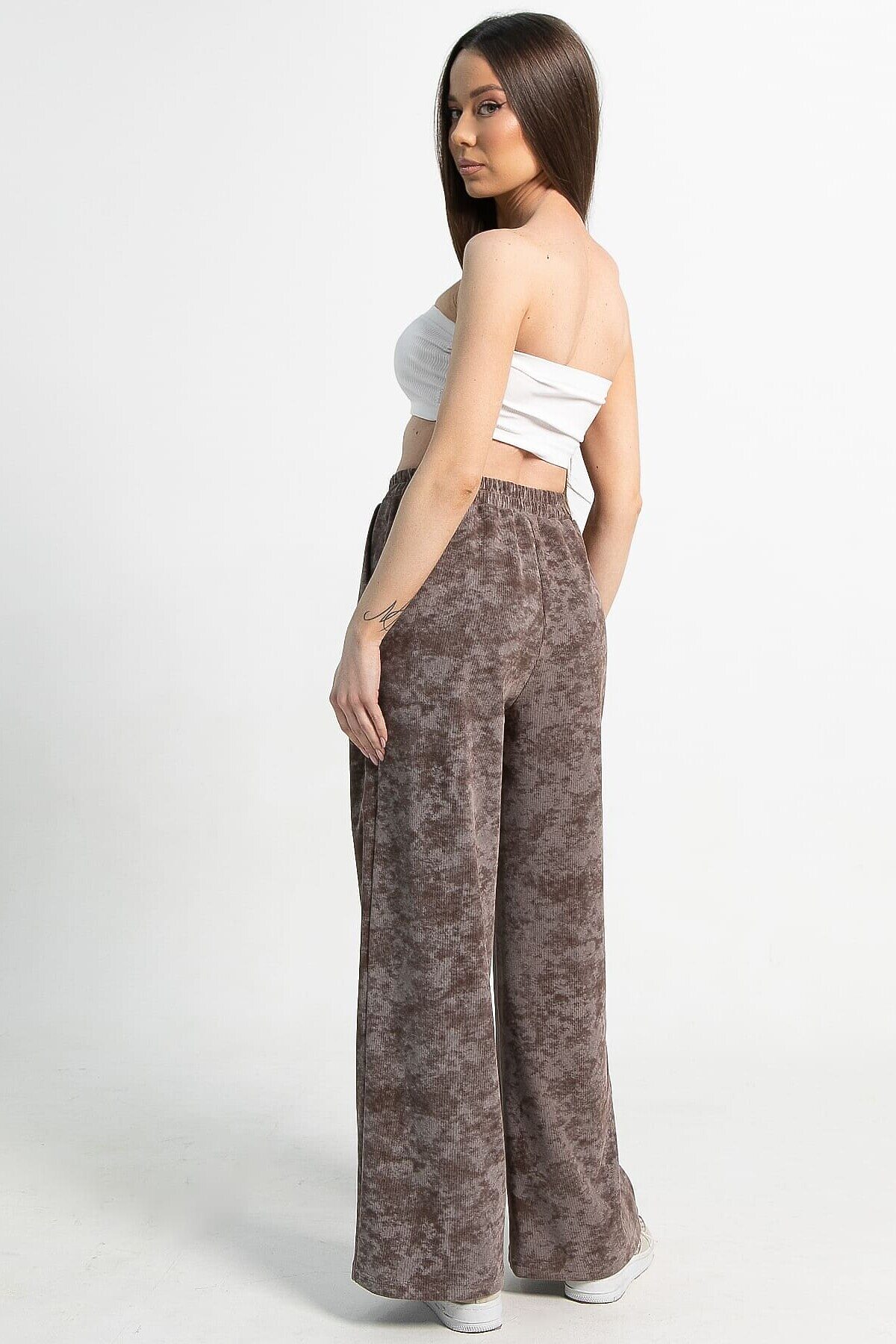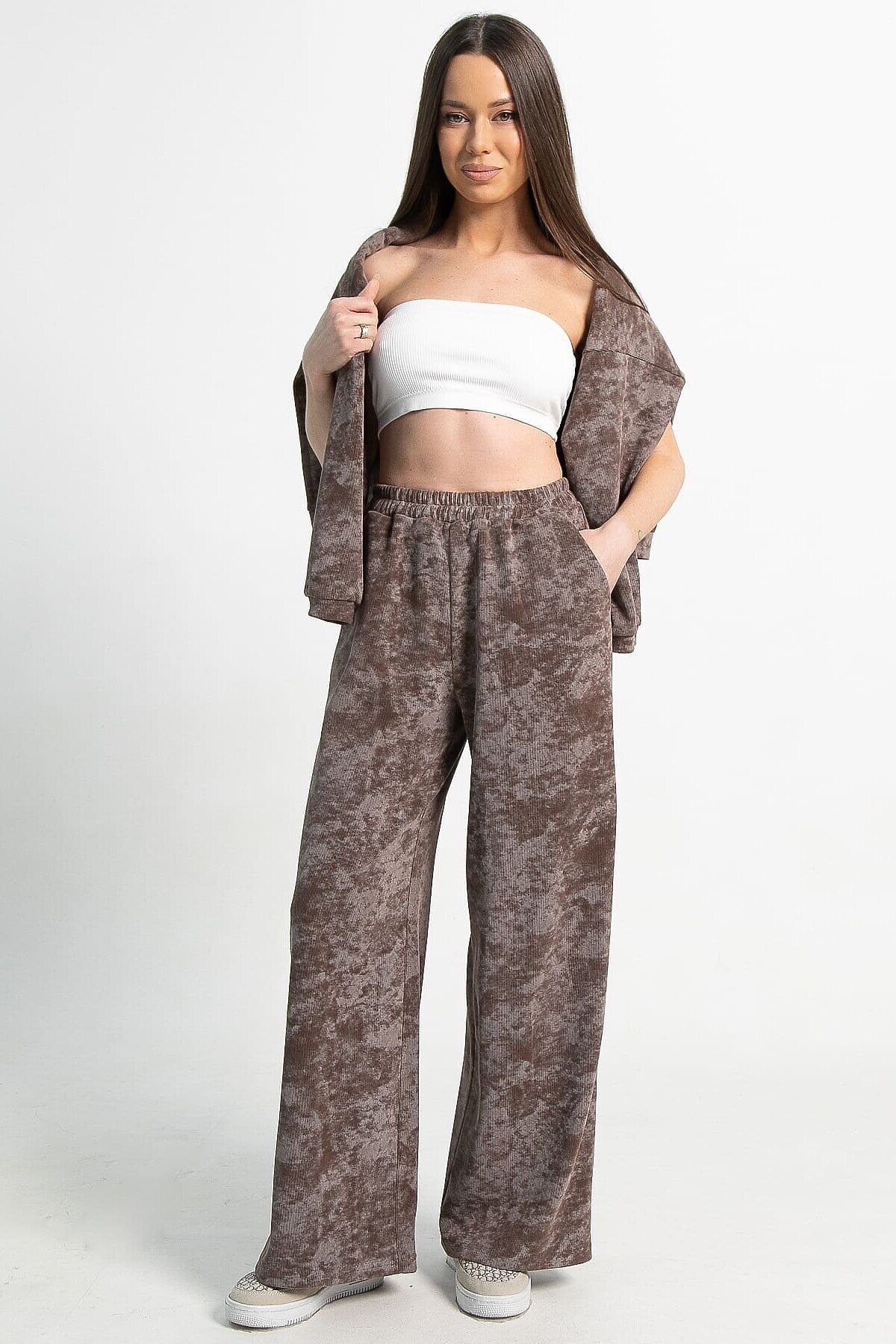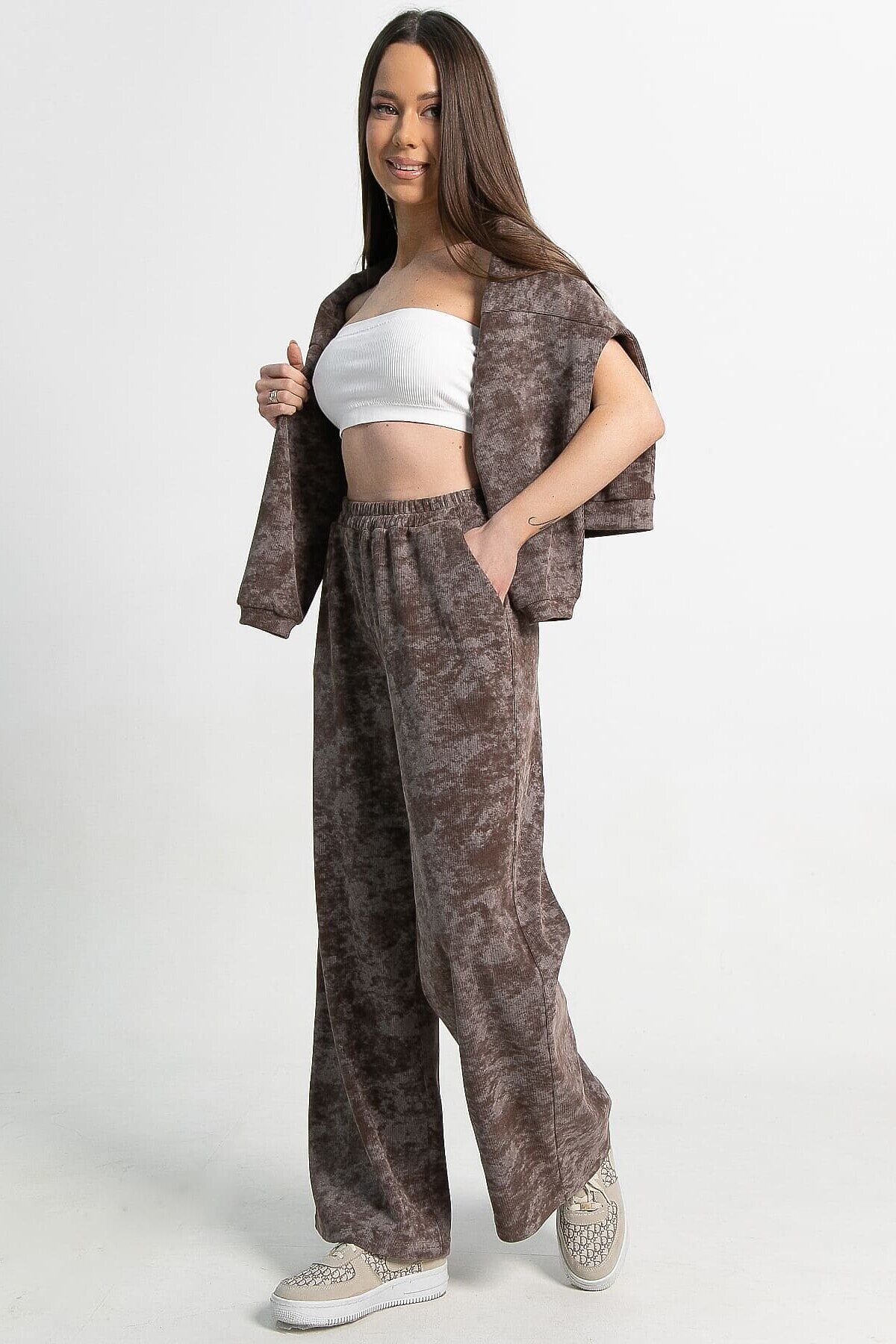 Ваш идеальный выбор для комфортных образов — костюм в кофейном цвете с принтом «варенка». Отличительная особенность этой модели — широкие брюки палаццо. Свободный крой верха и спущенный рукав создают ощущение комфорта, что особенно актуально в прохладную погоду. Брюки по талии на резинке обеспечивают дополнительный комфорт. По боковым швам расположены карманы. Этот комплект идеально подойдет тем, кто ценит свободу движений и уют без лишних деталей.