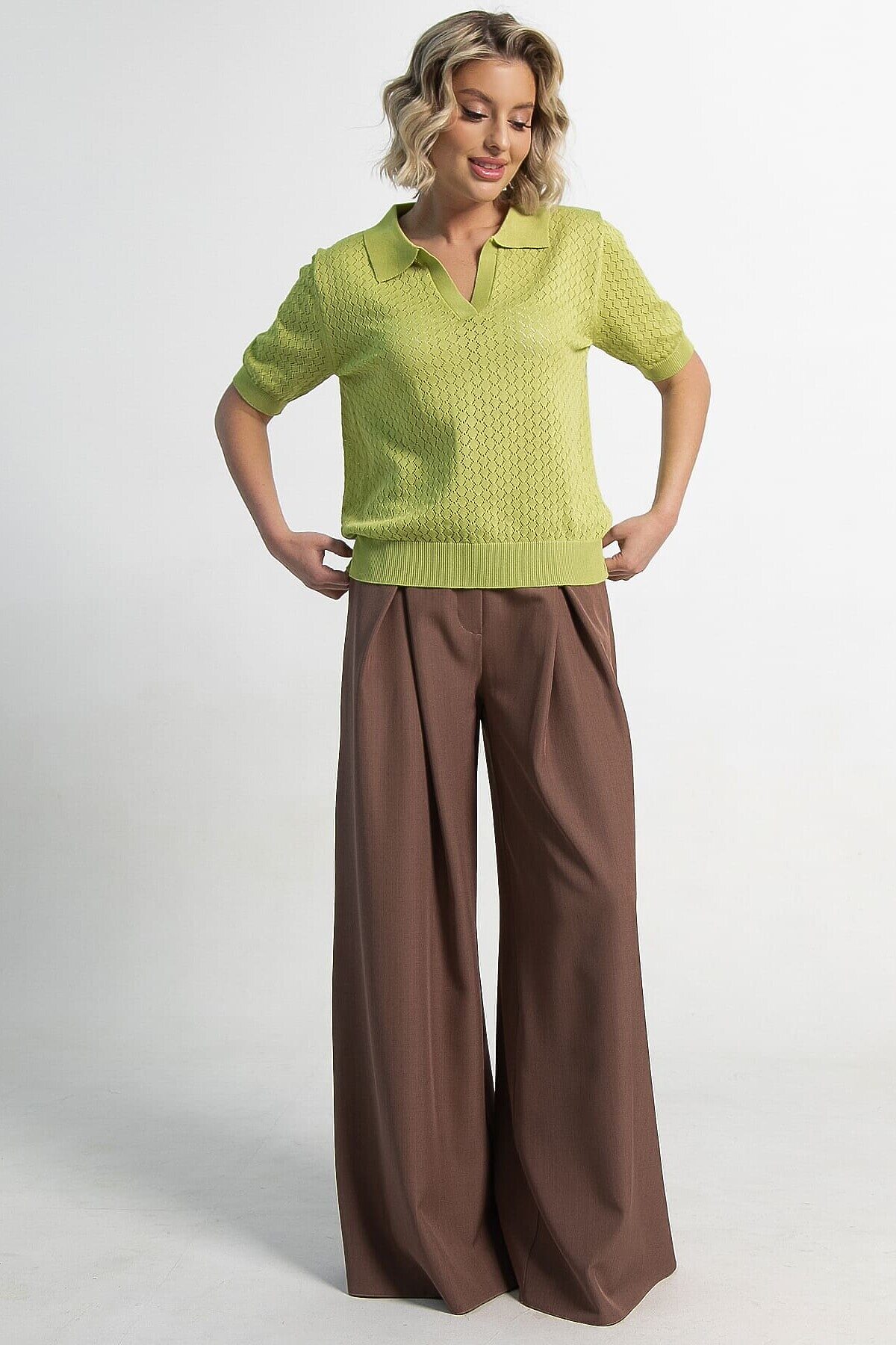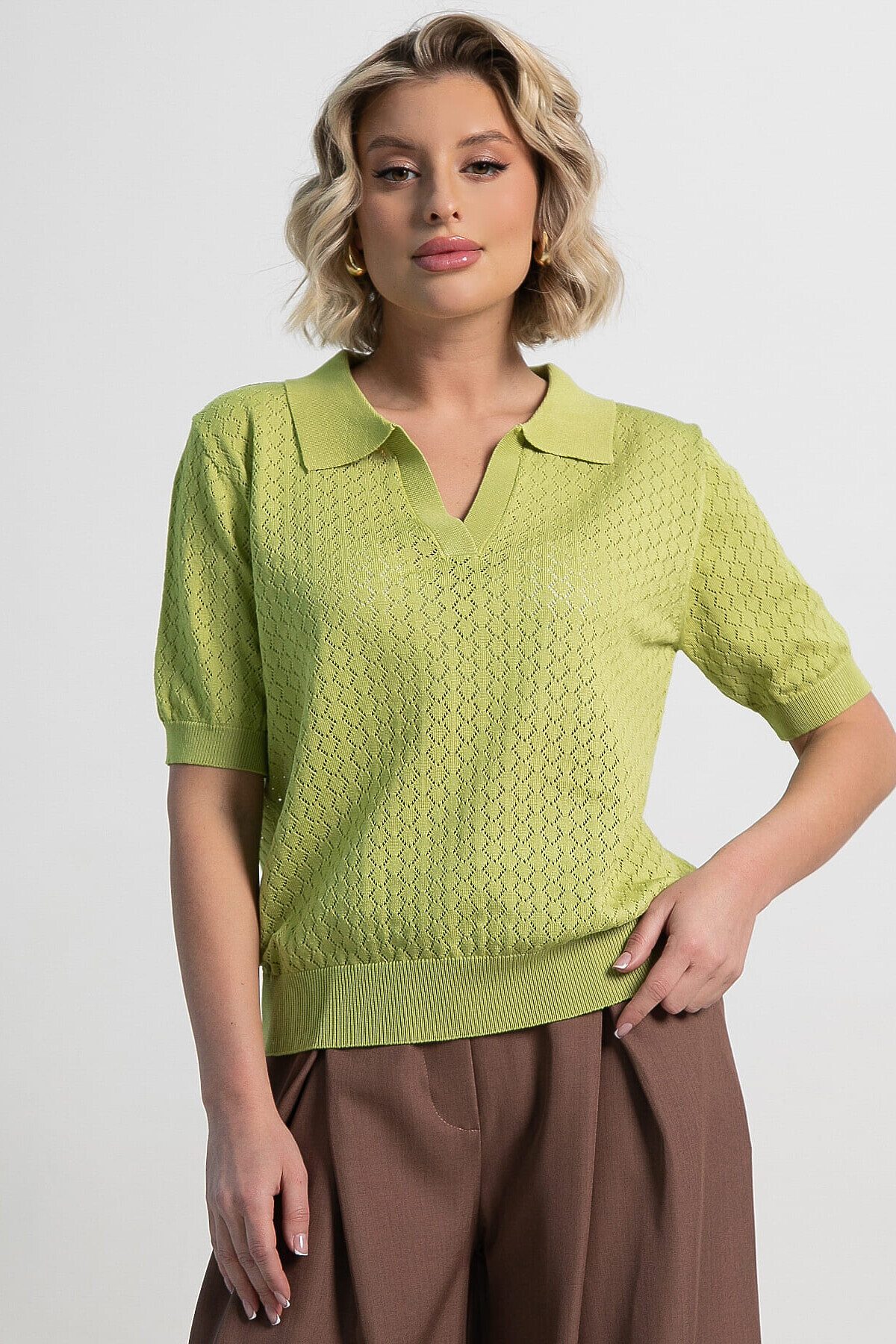 Откройте для себя идеальное дополнение к базовому гардеробу — наше женское поло в изысканном оттенке «зеленое яблоко». Этот элемент одежды легко впишется в стиль «олд мани», объединяя классическую элегантность и сдержанную роскошь. Поло гармонично сочетается с другими вещами, позволяя создавать утонченные и стильные образы. V-образный вырез и традиционный воротник-поло формируют изысканный и женственный силуэт. Комбинируйте его с классическими брюками, юбками-плиссе, джинсами или надевайте под стильный блейзер. Это поло подчеркнет вашу индивидуальность и чувство вкуса, помогая выглядеть элегантно и уверенно в любых ситуациях.