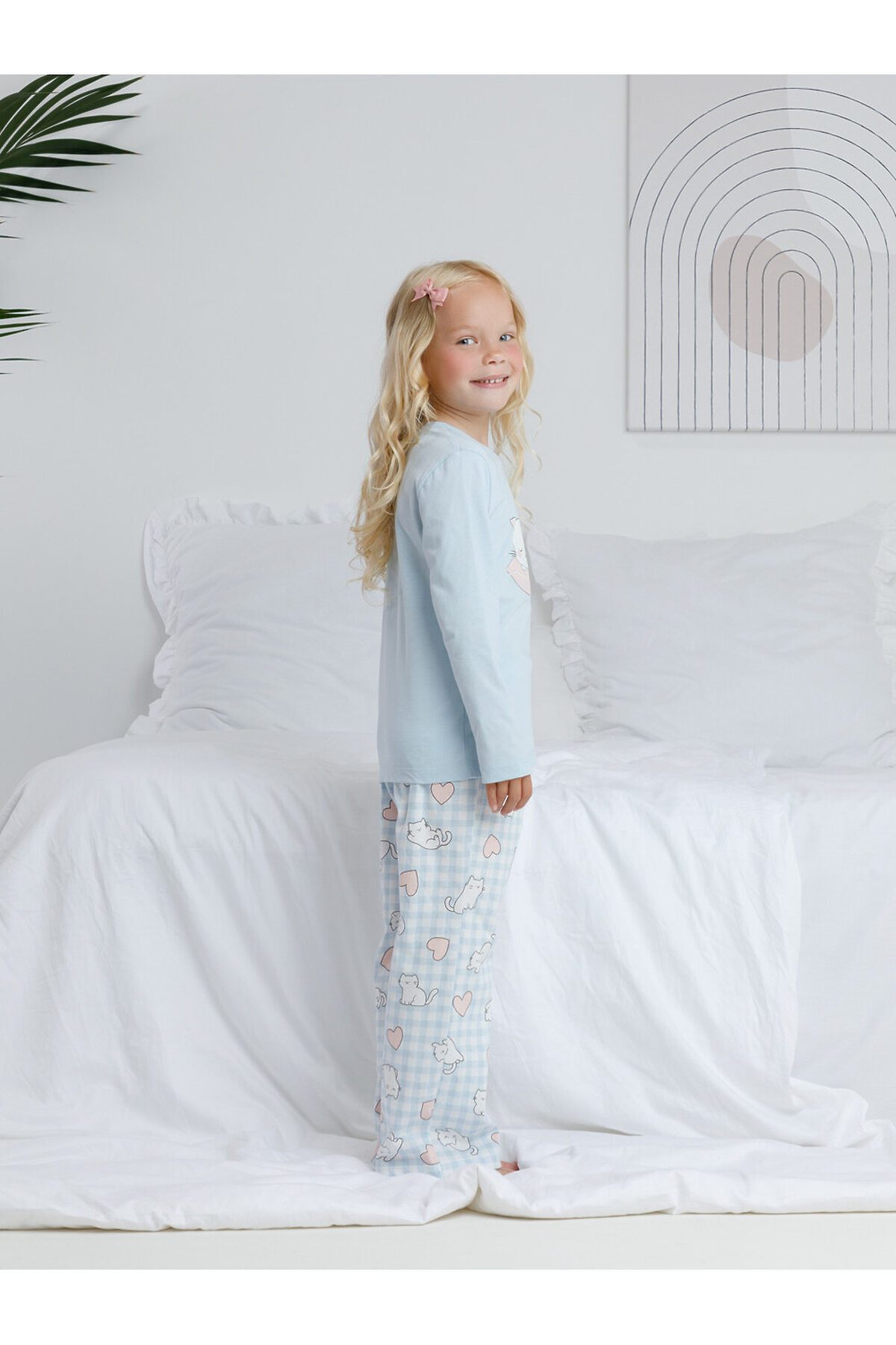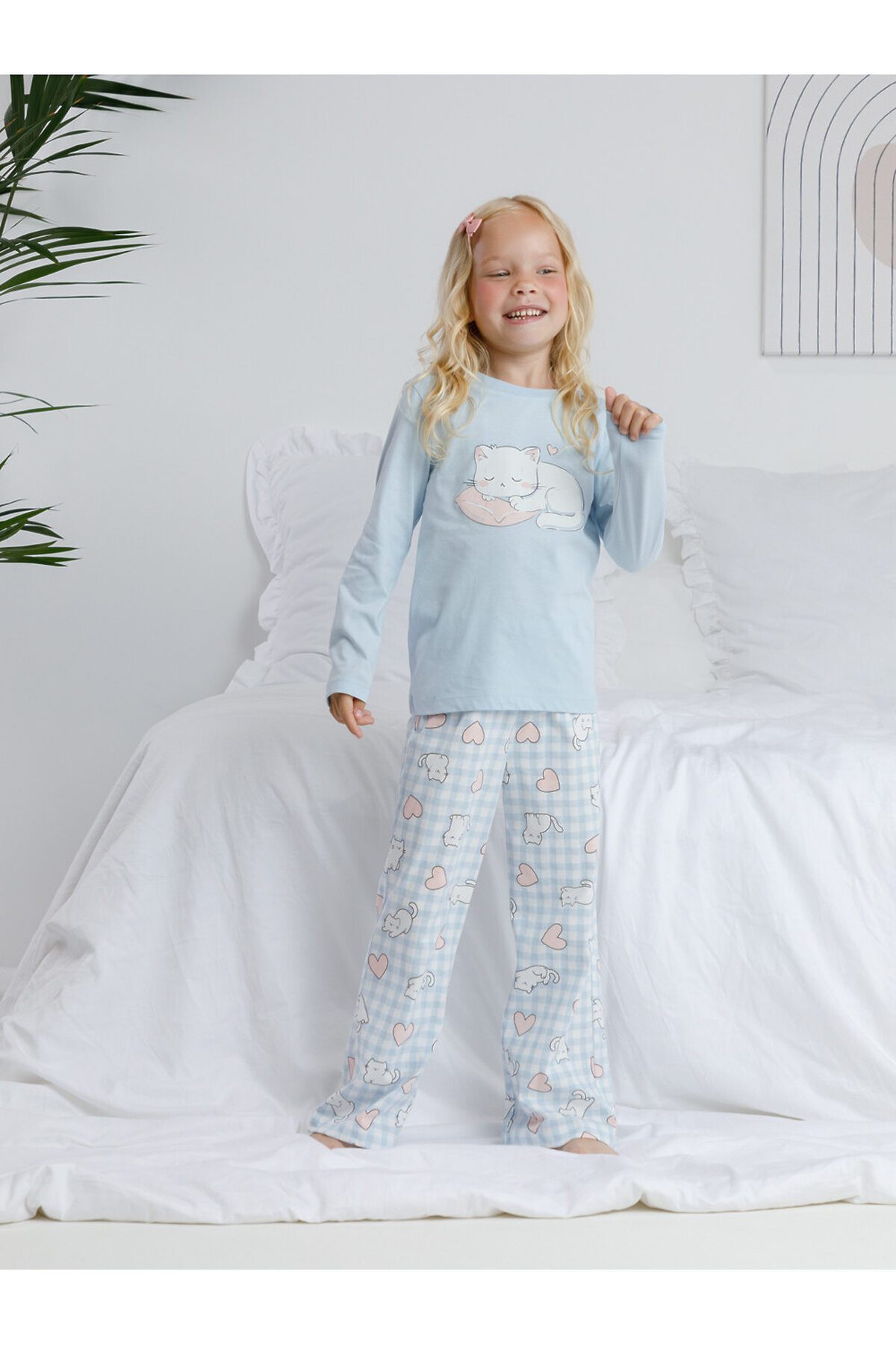 Трикотажная пижама из натурального хлопка. Джемпер с длинными втачными рукавами и прямые брюки с эластичной резинкой в поясе. Оригинальные набивка и принт выполнены из стойких гипоаллергенных текстильных гипоаллергенных красителей. Изделие сохраняет цвет и форму после многократных стирок. Все трикотажные полотна производятся в соответсвии с нормами швейцарского сертификата ЭкоТекс.
