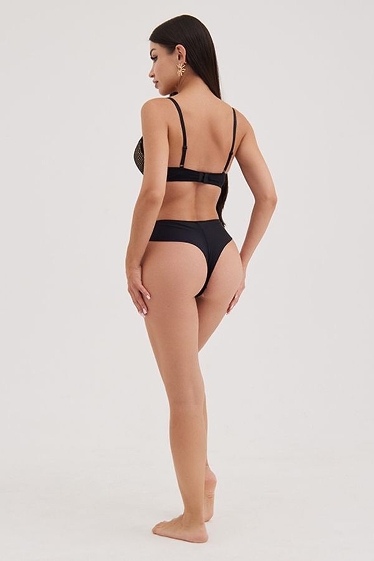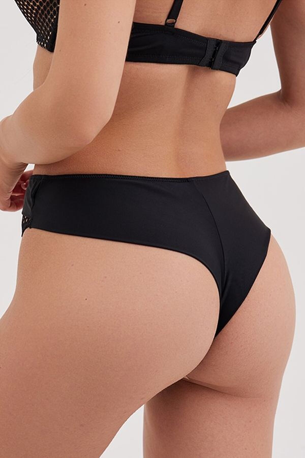 Трусики модели Brazilian cо средней линией талии выполнены из нежного кружевглшл полотна и нежного эластичного полотна. Декоративная детель в передней части украшена металлической пряжкой черного цвета.Тонка резинка по линии талии и срез ноэек спереди. Двойное эластичное полотно задней части трусиков обеспечивает удобную посадку. Ластовица из хлопка. Размерная сетка XS-(90), S-(94), M-(98), L-(102), XL-(106).