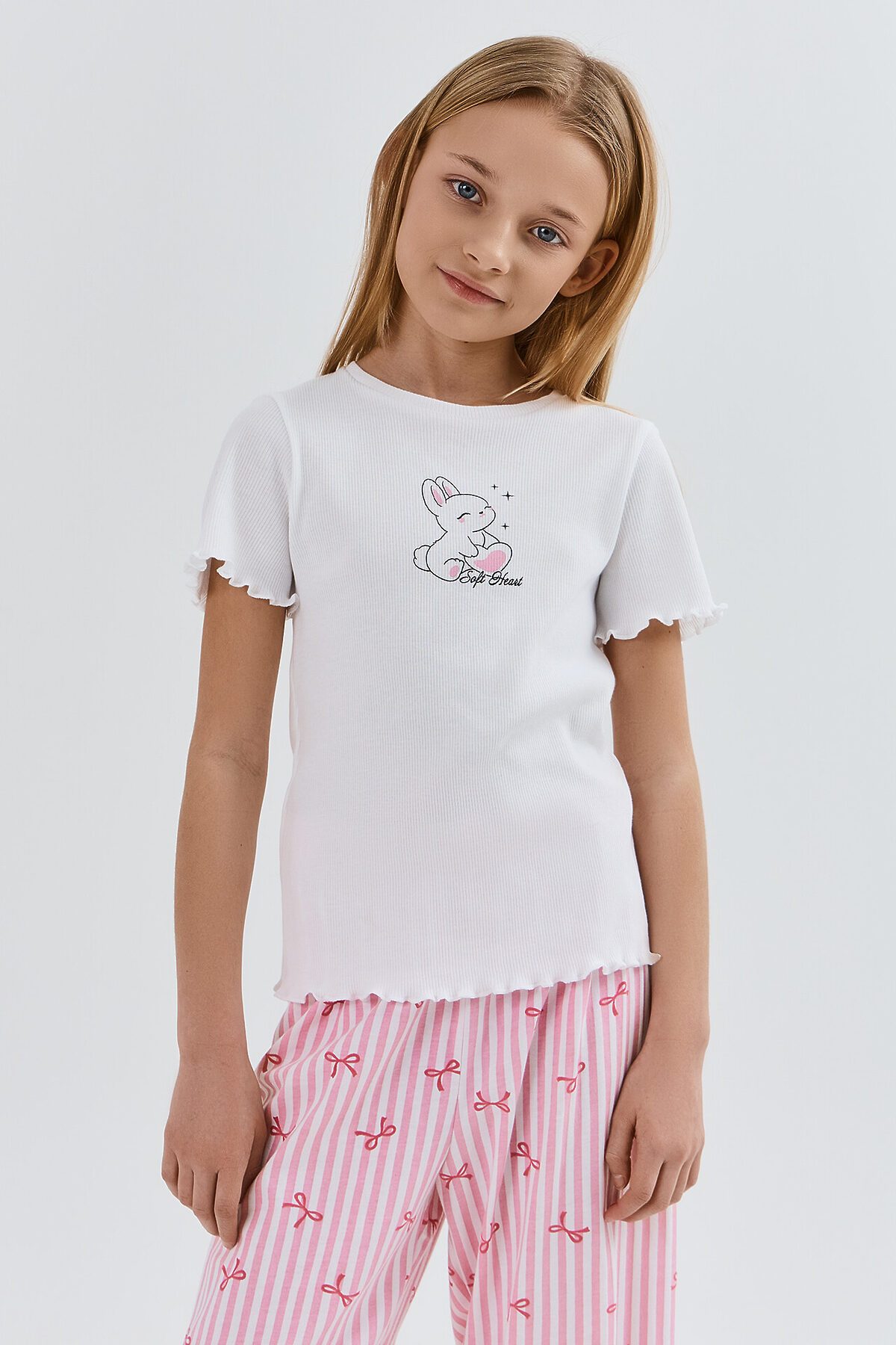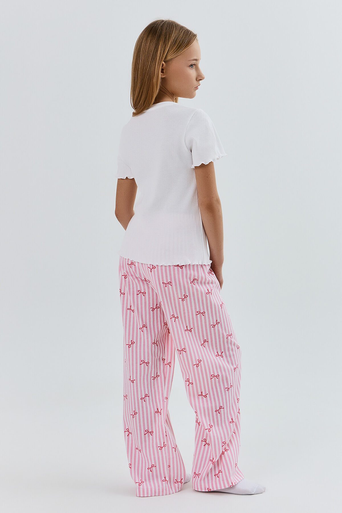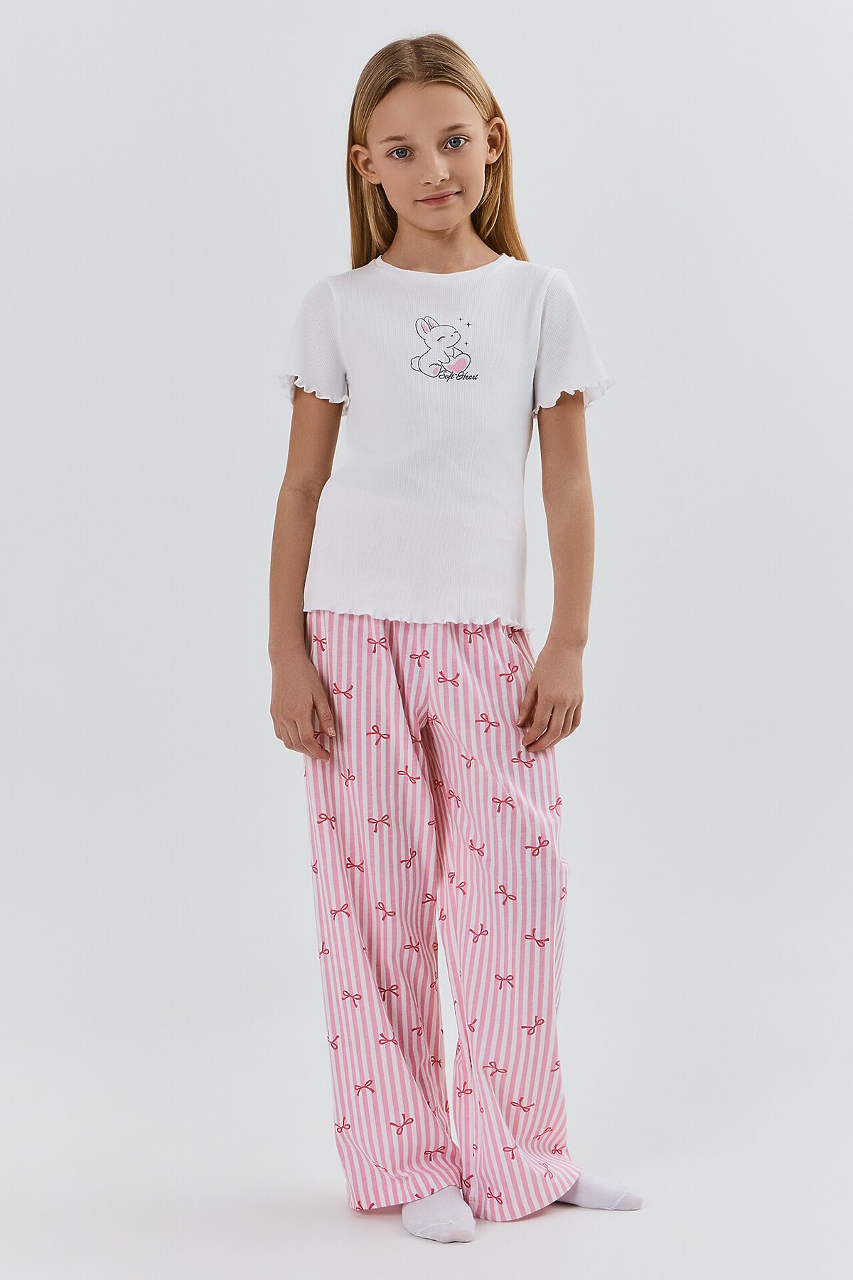 Комплект для девочек состоит из джемпера и брюк. Джемпер полуприлегающего силуэта, выполнен из рибаны (R-25 и R-43). Перед и спинка цельнокроеные. Горловина круглой формы. Рукав втачной, одношовный, короткий. Низ джемпера и рукавов обработаны на микроверлоке Брюки прямого, свободного силуэта выполнены из полотна трикотажного кулирного SJ-10 (SJ-001.01.140),100% хлопок, 180 см, 140 гр/м?. Пояс цельнокроеный с эластичной тесьмой внутри (внутрення резина 30RV), ширина 30 мм. Низ брюк обработан на 2-х игольной плоскошовной машине швом в подгибку.