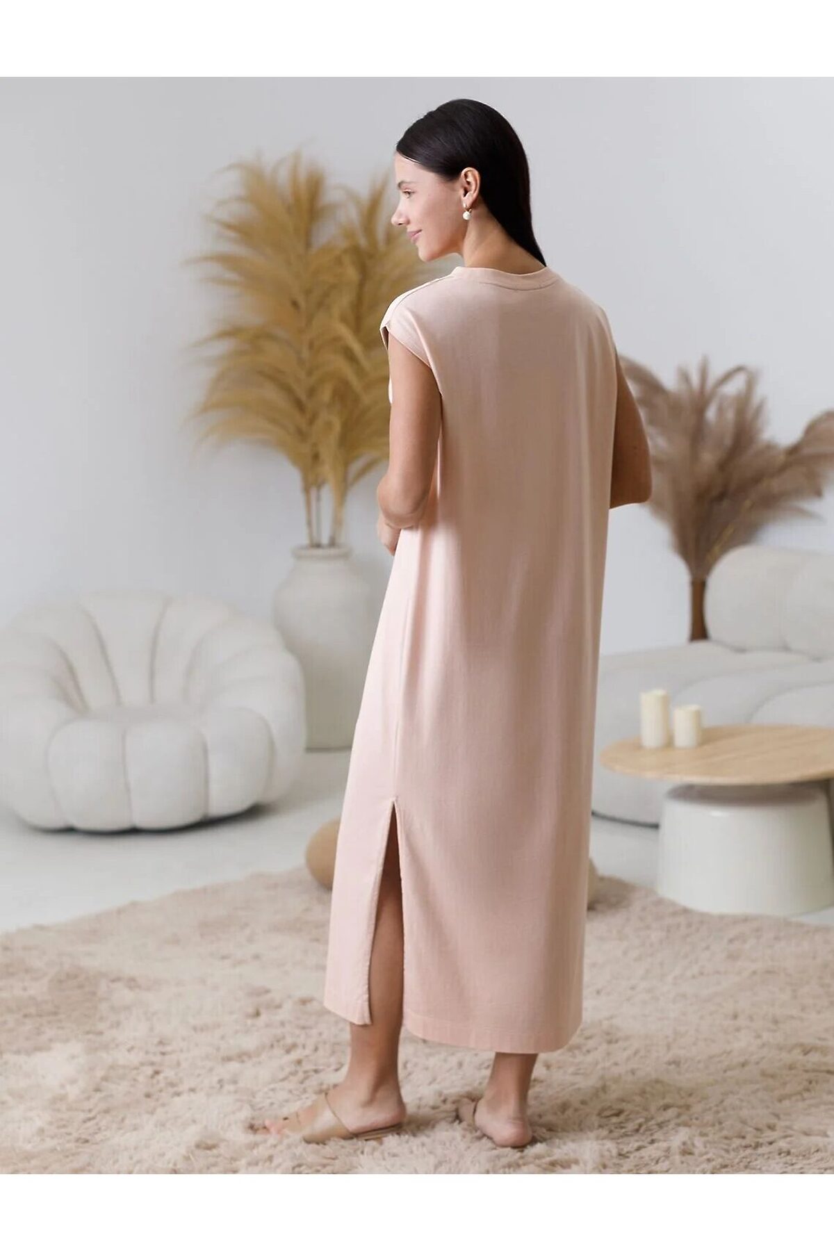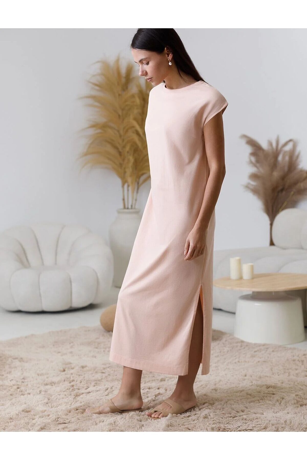 Стильное базовое платье пудрового цвета длины макси идеально для весны и лета. Легкое и дышащее, оно выполнено из натурального 100% хлопка, что обеспечивает комфортное ношение в теплое время года. Свободный и прямой крой не сковывает движений и легко скроет возможные недостатки фигуры. Благодаря разрезам платье добавляет легкости и непринужденности образу, делая его подходящим для повседневных и непринужденных мероприятий. Короткий цельнокроеный рукав и позволяет чувствовать себя удобно в теплую погоду, а так же в домашней обстановке. Простота кроя сочетается с современным дизайном, создавая гармоничный лук без излишеств. Это легкое платье подойдет для тех, кто ценит комфорт и элегантность одновременно.