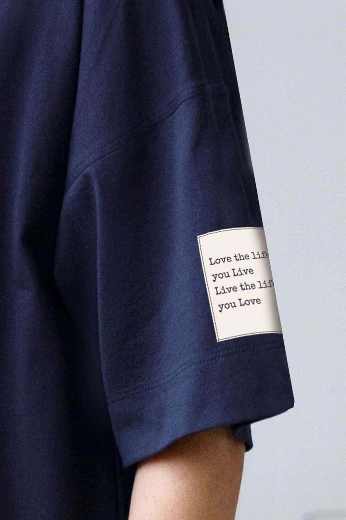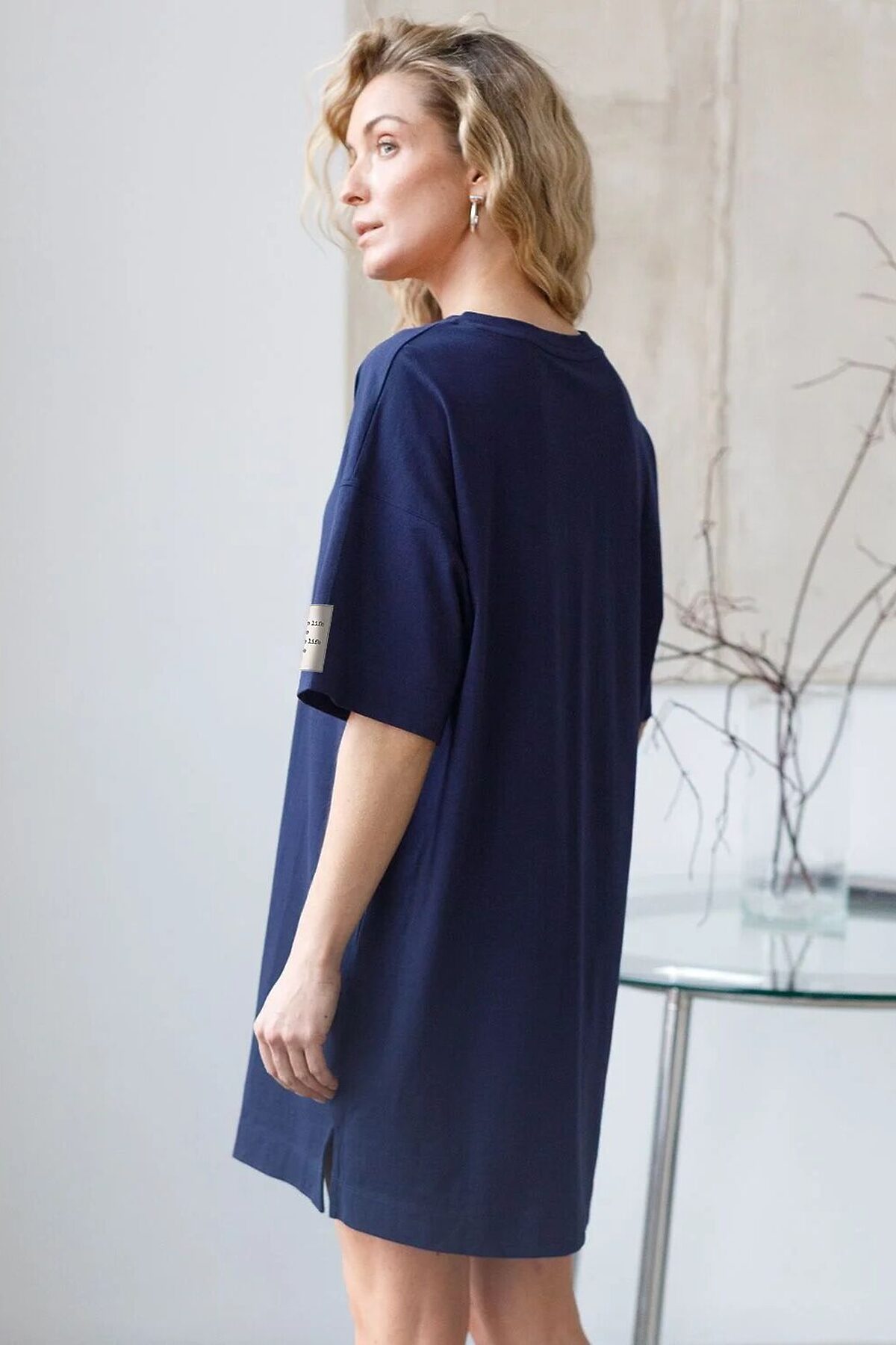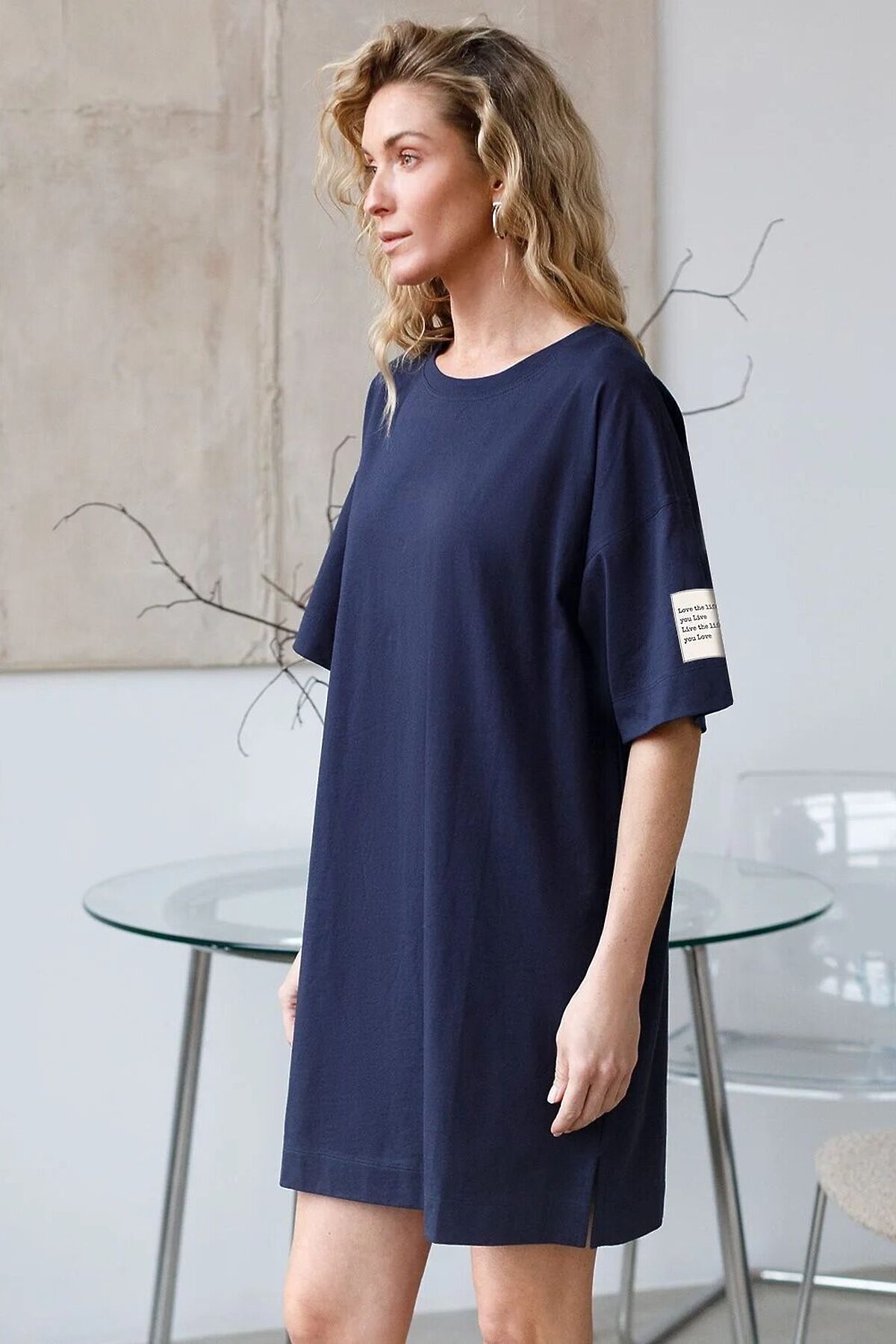 Стильное хлопковое платье-футболка темно-синего цвета отличается простым и легким кроем, идеально подходящим для повседневной носки. Модель имеет спущенную линию плеча и широкий рукав, что дарит комфорт и свободу движений. Небольшие разрезы добавляют изящности и оригинальности образу, а стильный принт на рукаве в виде надписи придает платью современный и привлекательный вид. Перевод надписи: love the life You life Live the life You love - Люби жизнь,ты жизнь, живи жизнью, которую любишь. Натуральная ткань прекрасно держит форму и не вызывает раздражений на коже, благодаря чему платье-футболка сохраняет презентабельный вид даже после многократных стирок.Короткое платье прямого кроя легко скроет недостатки фигуры, обеспечивая непринужденный образ в теплую или жаркую погоду. Комфортное платье прекрасно подойдет для отдыха или для домашнего использования, поддерживая баланс между удобством и стилем. Повседневное платье легко комбинировать с разной обувью и аксессуарами, делая образ завершенным и современным. Это изделие — отличный выбор для тех, кто ценит функциональность и стиль в одном.