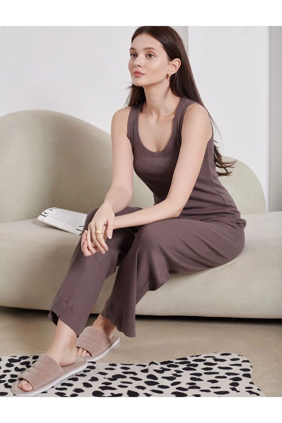 Базовый топ кофейного цвета с круглым вырезом из фактурного трикотажа в рубчик идеально сочетается с повседневным стилем и подходит для домашней носки или отдыха. Мягкое полотно из хлопка обеспечивает максимальный комфорт даже в течение длительного времени. Особенность этого изделия — эластичная структура ткани, благодаря чему она хорошо тянется и подстраивается под особенности фигуры. Майка подойдет для девушек и женщин, которые ценят уют и удобство. Нежная ткань приятна к телу, не вызывает дискомфорта и позволяет коже дышать, что особенно важно в повседневной жизни. Полуприлегающий крой визуально вытягивает силуэт и делает фигуру более стройной, а широкие лямки не доставляют дискомфорта и хорошо держат форму. Разнообразие размеров позволяет выбрать подходящий вариант для любых параметров, в том числе на большие размеры. Этот повседненый топ практичен и незаменим для тех, кто ищет качественные вещи на каждый день. Рекомендуем сочетать с артикулами: D40.001, D40.002, D40.003, D48.011, D48.012, D44.160, D44.161, D44.162, D44.163, D46.058