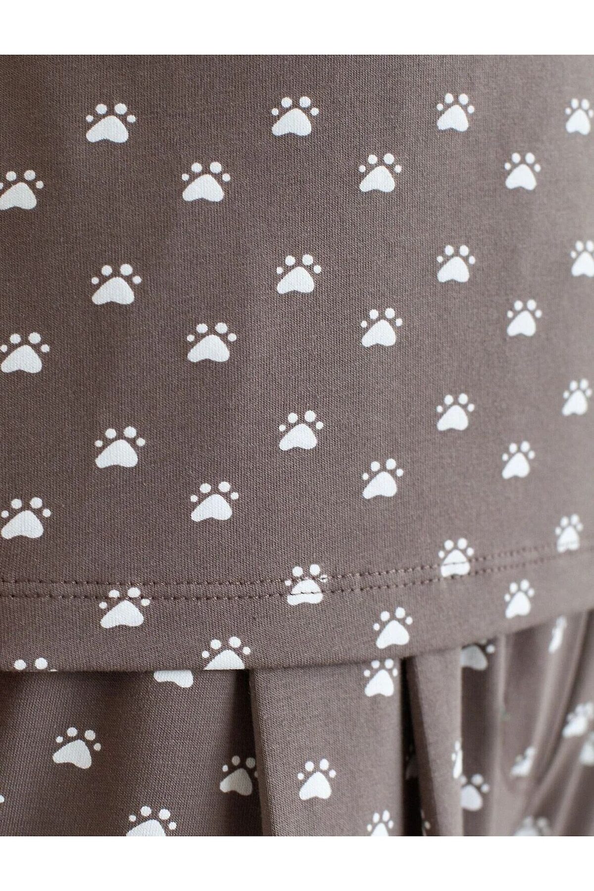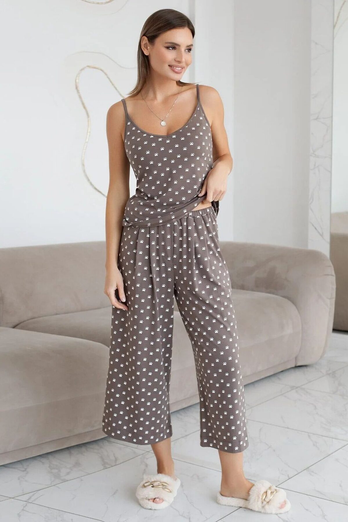 Топ кофейного цвета из 100% хлопка с принтом станет отличным выбором для создания женственного и красивого образа. Благодаря тонким бретелям с регуляторами топ легко отрегулировать под особенности фигуры, обеспечивая идеальный комфорт в течение всего дня. V вырез подчеркивает линию шеи и придает особую привлекательность. Особое внимание заслуживает качество материала: натуральный хлопок хорошо пропускает воздух, позволяя коже дышать, что делает майку особенно приятной даже в жаркую погоду. Мягкая ткань не вызывает раздражения и подходит для чувствительной кожи. Милый принт в виде лапок добавляет индивидуальности и яркости образу, поэтому изделие легко впишется как в повседневный, так и в домашний стиль.Такой комфортный и стильный топ понравится тем, кто ценит удобство и стиль, его можно использовать как нижний слой, а также носить самостоятельно в домашних условиях или на прогулке. Рекомендуем сочетать с артикулами: D46.058, D44,160, D44.161, D44.162, D44.163, D44.161, D48.012