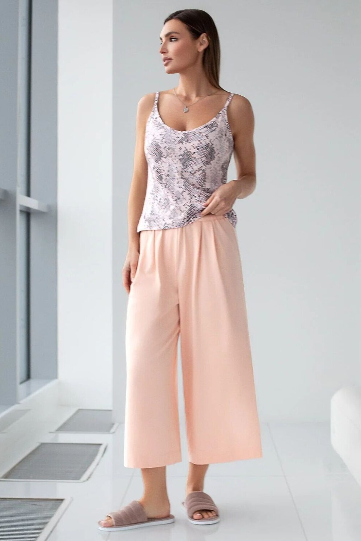 Топ пудрового цвета из 100% хлопка с принтом станет отличным выбором для создания женственного и красивого образа. Благодаря тонким бретелям с регуляторами топ легко отрегулировать под особенности фигуры, обеспечивая идеальный комфорт в течение всего дня. V вырез подчеркивает линию шеи и придает особую привлекательность. Особое внимание заслуживает качество материала: натуральный хлопок хорошо пропускает воздух, позволяя коже дышать, что делает майку особенно приятной даже в жаркую погоду. Мягкая ткань не вызывает раздражения и подходит для чувствительной кожи. Трендовый змеиный принт добавляет индивидуальности и яркости образу, поэтому изделие легко впишется как в повседневный, так и в домашний стиль.Такой комфортный и стильный топ понравится тем, кто ценит удобство и стиль, его можно использовать как нижний слой, а также носить самостоятельно в домашних условиях или на прогулке. Рекомендуем сочетать с артикулами: D46.058, D44,160, D44.161, D44.162, D44.163, D44.161, D48.012