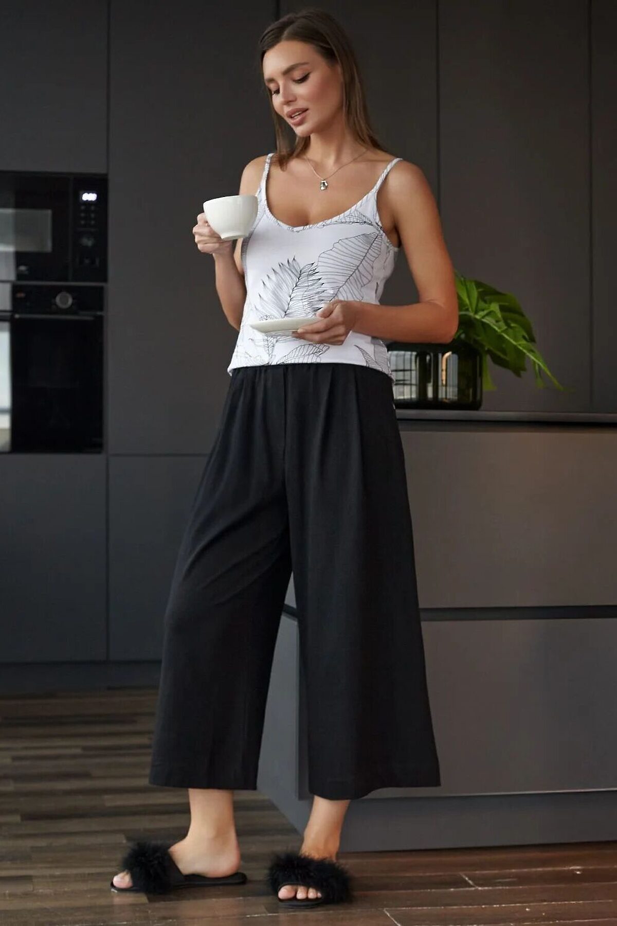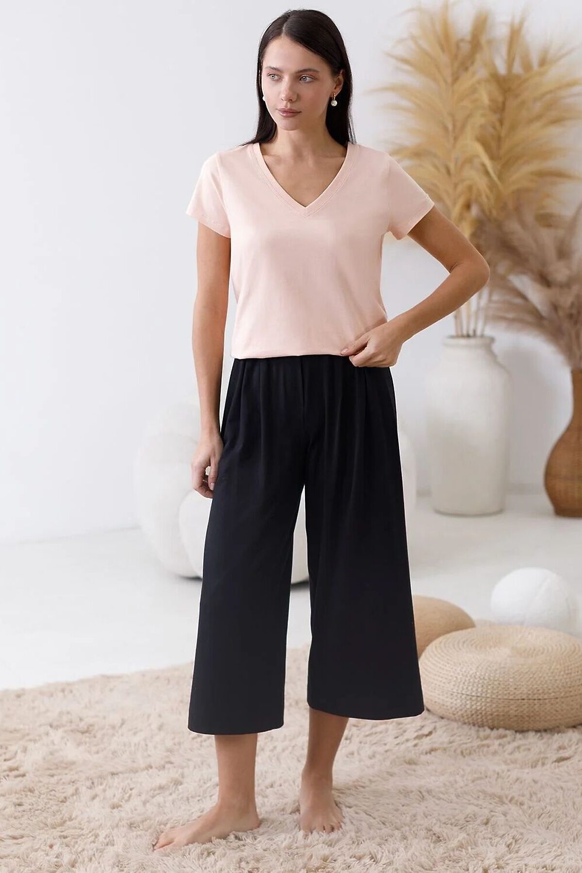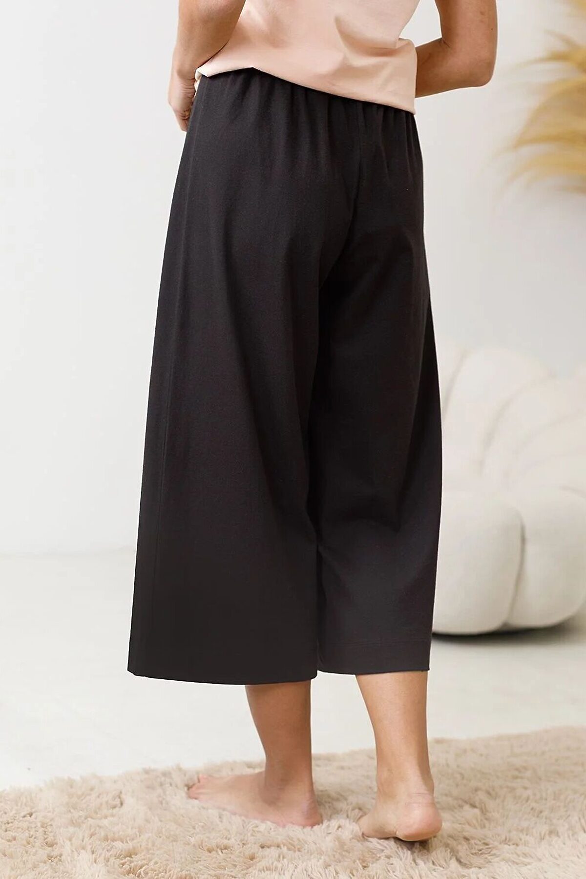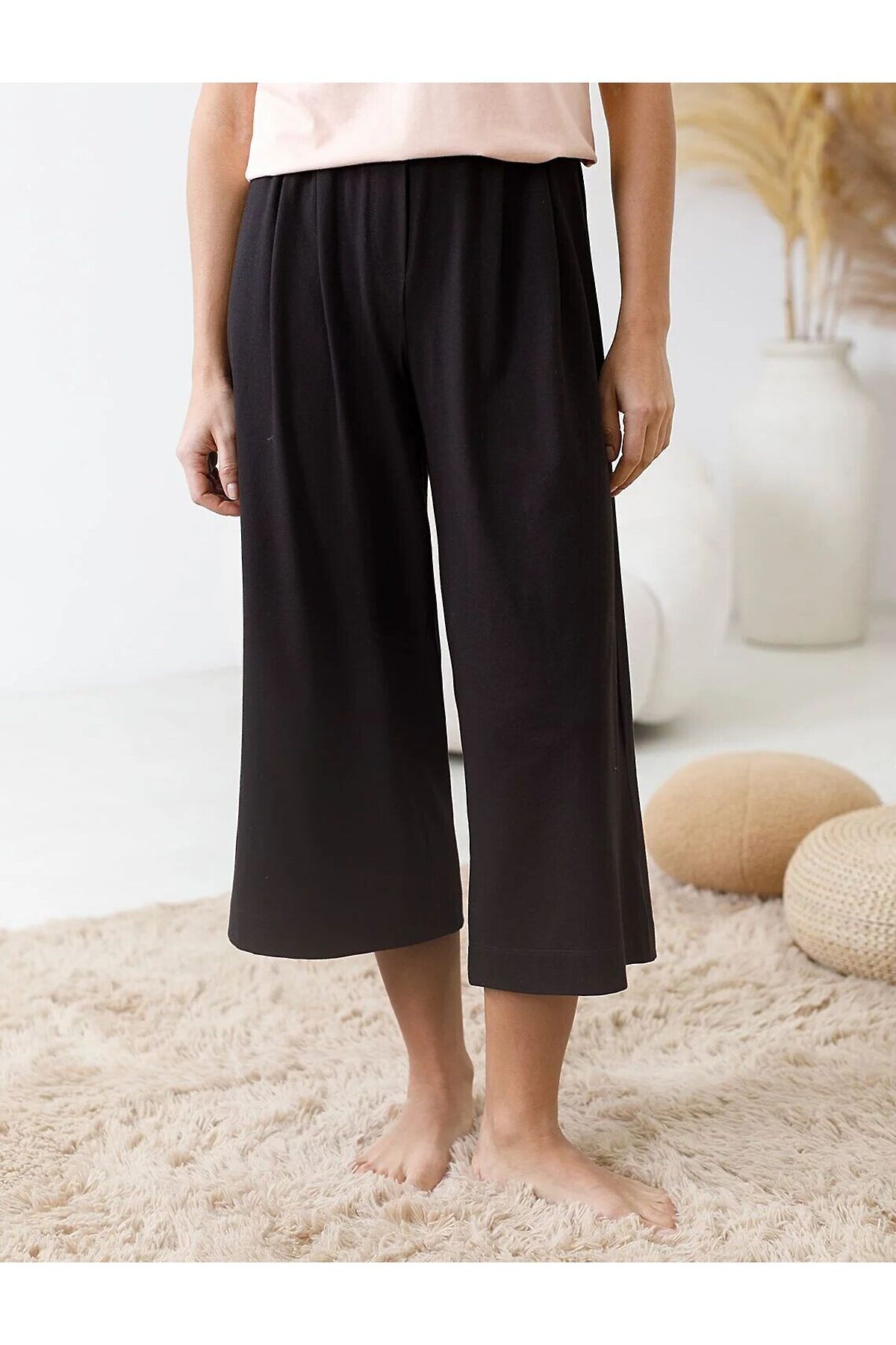 Комфортные укороченные широкие брюки кюлоты черного цвета на тонкой резинке из 100% хлопка – отличный выбор для отдыха и домашней носки. Эти свободные брюки обеспечивают максимальную свободу движений благодаря широкому крою. Эластичная резинка в области талии гарантирует удобную посадку и индивидуальное прилегание по фигуре. Защипы добавляют выразительность образу и помогают сформировать актуальный силуэт, подчеркивая современные тенденции.Тонкая хлопковая ткань пропускает воздух, создавая ощущение легкости и свежести в теплую и жаркую погоду. Повседневные брюки подходят для больших размеров, мягко скроют возможные недостатки фигуры, подчеркивая комфорт и стиль. Домашние брюки кюлоты отлично сочетаются с разными вариантами верхней одежды, поэтому их можно носить не только дома, но и на прогулках. Удобные брюки созданы для тех, кто ценит комфорт и практичность без лишних деталей. Благодаря свободному крою и натуральному материалу штаны идеально подходят для повседневного использования. Эти брюки не сковывают движение и обеспечивают комфорт на протяжении всего дня, что делает их незаменимыми в гардеробе. Рекомендуем сочетать с артикулами: D43.233, D43.234, D49.150, D49.151, D49.152, D49.153, D49.154, D49.157, D49.158, D49.159