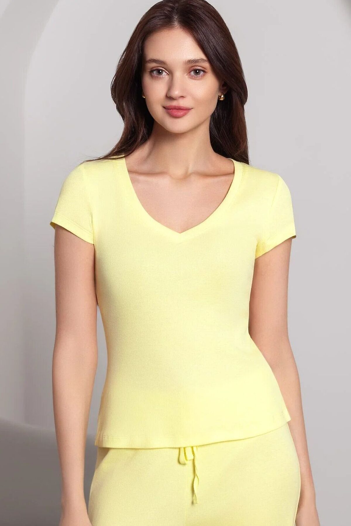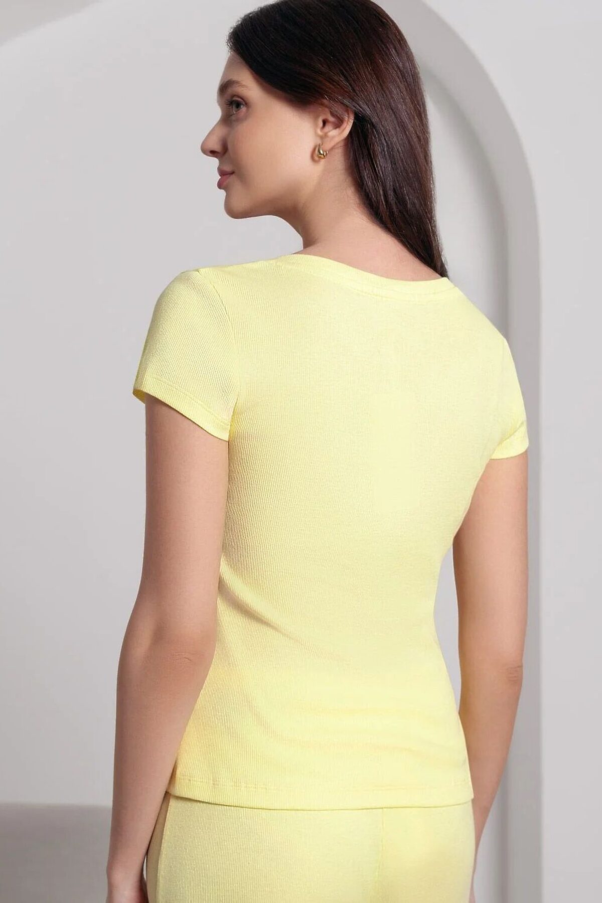Футболка лимонного цвета с V вырезом из фактурного трикотажа в рубчик идеально сочетается с повседневным стилем и подходит для домашней носки или отдыха. Мягкое полотно из хлопка обеспечивает максимальный комфорт даже в течение длительного времени. Особенность этого изделия — эластичная структура ткани, благодаря чему она хорошо тянется и подстраивается под особенности фигуры. Короткие рукава делают модель легкой и универсальной. V-образный вырез красиво подчеркивает зону декольте, придавая образу утонченность и женственность, не открывая лишнего, сохраняя при этом комфорт и уверенность в себе. Футболка подойдет для девушек и женщин, которые ценят уют и удобство. Нежная ткань приятна к телу, не вызывает дискомфорта и позволяет коже дышать, что особенно важно в повседневной жизни. Футболка в мелкий рубчик полуприлегающего кроя визуально вытягивает силуэт и делает фигуру более стройной. Разнообразие размеров позволяет выбрать подходящий вариант для любых параметров, в том числе на большие размеры. Эта красивая футболка практична и незаменима для тех, кто ищет качественные и стильные вещи на каждый день. Рекомендуем сочетать с артикулами: D40.001, D40.002, D40.003, D48.011, D48.012, D44.160, D44.161, D44.162, D44.163, D46.058