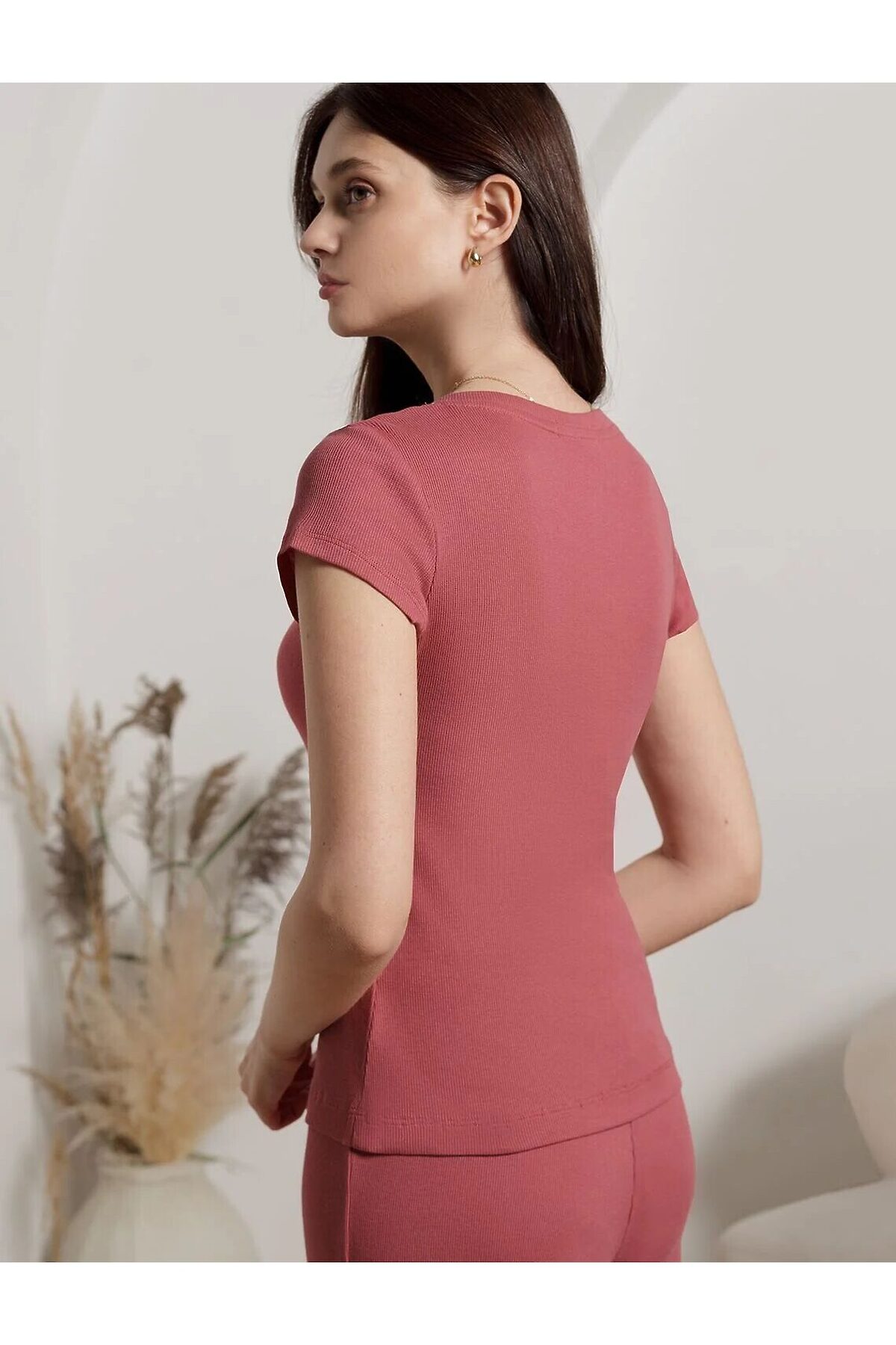 Футболка темно-кораллового цвета с V вырезом из фактурного трикотажа в рубчик идеально сочетается с повседневным стилем и подходит для домашней носки или отдыха. Мягкое полотно из хлопка обеспечивает максимальный комфорт даже в течение длительного времени. Особенность этого изделия — эластичная структура ткани, благодаря чему она хорошо тянется и подстраивается под особенности фигуры. Короткие рукава делают модель легкой и универсальной. V-образный вырез красиво подчеркивает зону декольте, придавая образу утонченность и женственность, не открывая лишнего, сохраняя при этом комфорт и уверенность в себе. Футболка подойдет для девушек и женщин, которые ценят уют и удобство. Нежная ткань приятна к телу, не вызывает дискомфорта и позволяет коже дышать, что особенно важно в повседневной жизни. Футболка в мелкий рубчик полуприлегающего кроя визуально вытягивает силуэт и делает фигуру более стройной. Разнообразие размеров позволяет выбрать подходящий вариант для любых параметров, в том числе на большие размеры. Эта красивая футболка практична и незаменима для тех, кто ищет качественные и стильные вещи на каждый день. Рекомендуем сочетать с артикулами: D40.001, D40.002, D40.003, D48.011, D48.012, D44.160, D44.161, D44.162, D44.163, D46.058