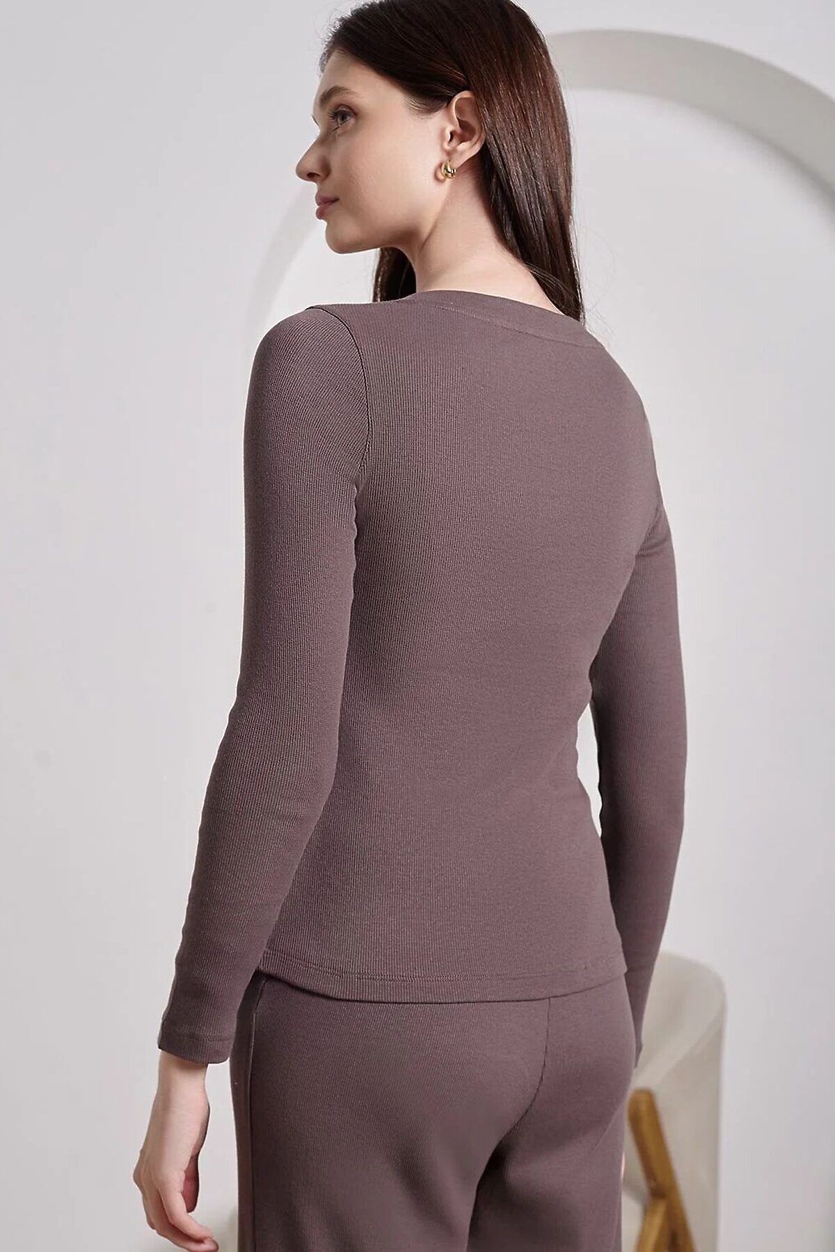 Лонгслив облегающий из фактурного трикотажа в рубчик с круглым вырезом на пуговицах VILATTE, кофе